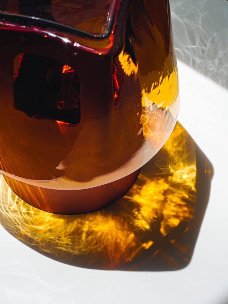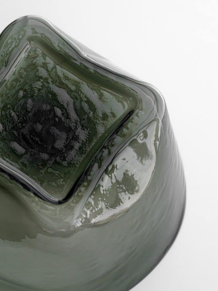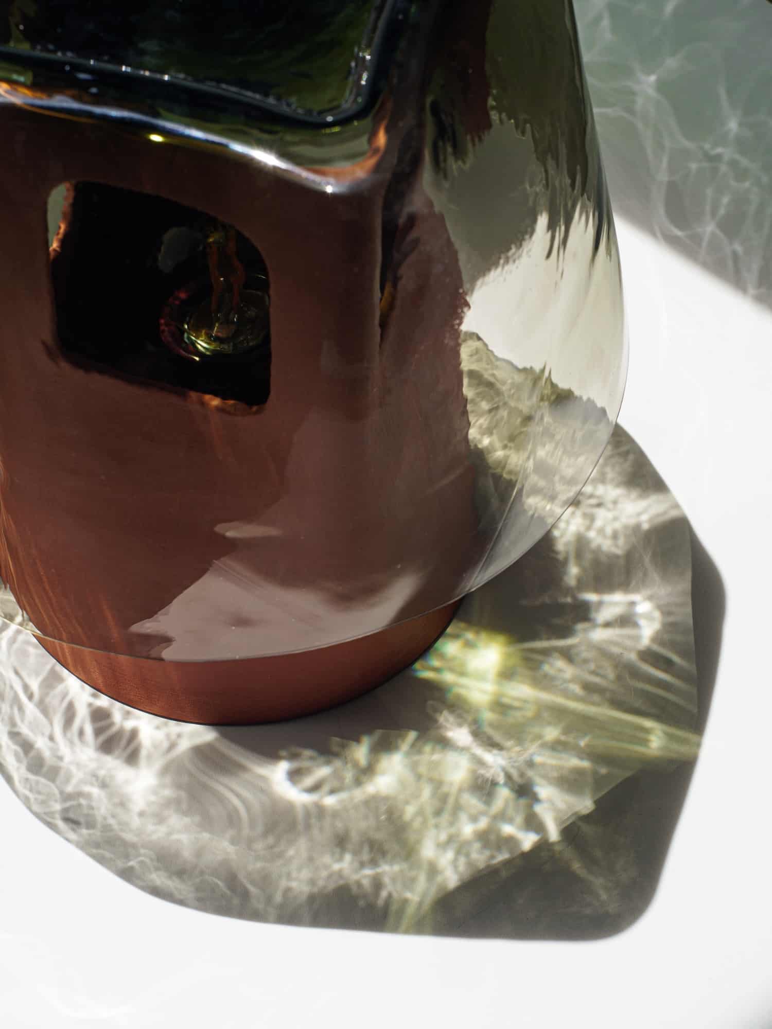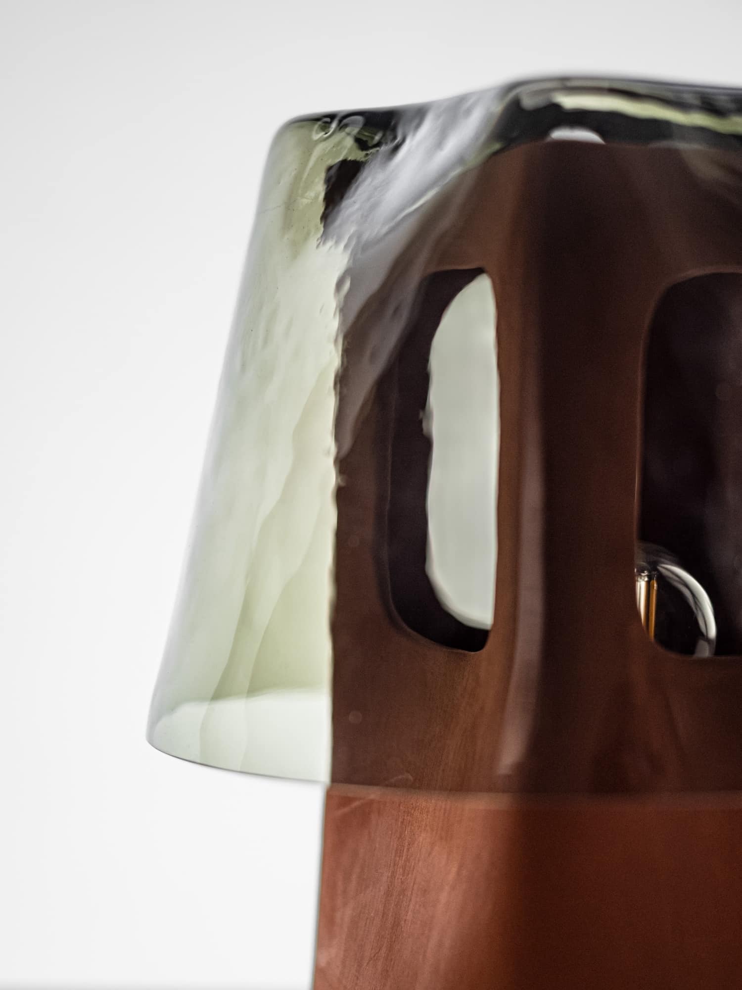 L’abat-jour en verre soufflé, aux formes légèrement arrondies et douces, vient parfaitement s’ajuster sur la structure, comme une rencontre heureuse entre ces matériaux. Proposé en teinte verte ou dans une version marron, il transforme la lumière diffusée en lui donnant une certaine douceur. Le vert apporte une fraîcheur apaisante, presque végétale, tandis que l’ambre enveloppe l’espace de tonalités chaudes et terreuses qui évoquent les couchers de soleil méditerranéens. Cette approche chromatique fait écho à d’autres créations récentes où la couleur du verre devient un élément structurant de l’ambiance lumineuse.
