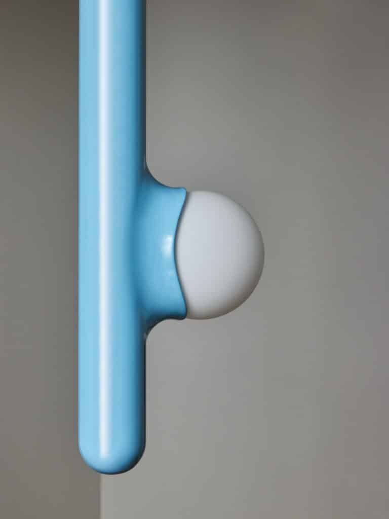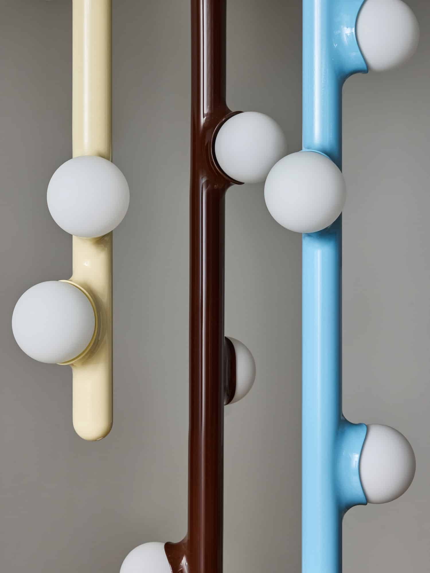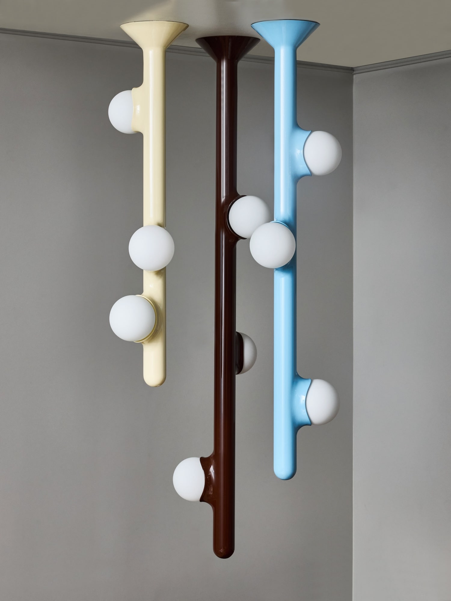Chacune des trois suspensions présente une silhouette tubulaire minimaliste, déclinée en trois couleurs soigneusement choisies : crème, chocolat brun et bleu ciel. Ce triptyque chromatique crée une composition raffinée, à la fois ludique et sophistiquée, qui évoque l’élégance graphique des luminaires modernistes tout en s’autorisant des clins d’œil aux audaces postmodernes.