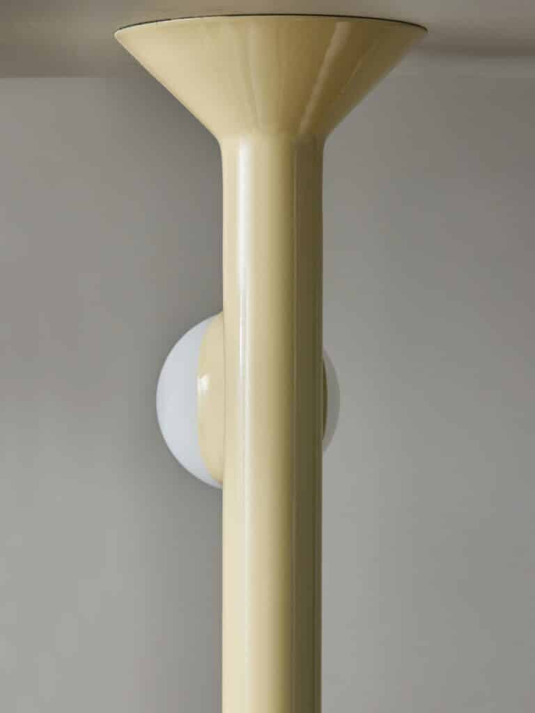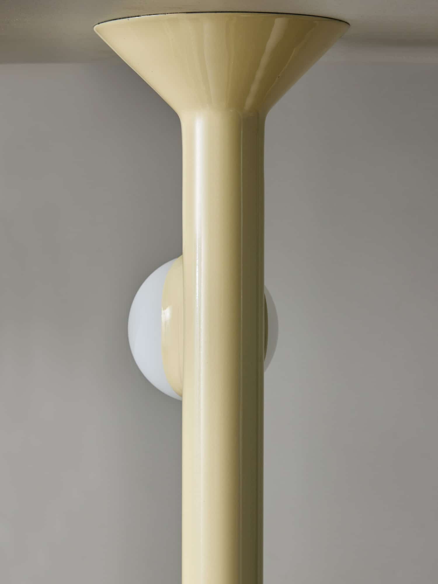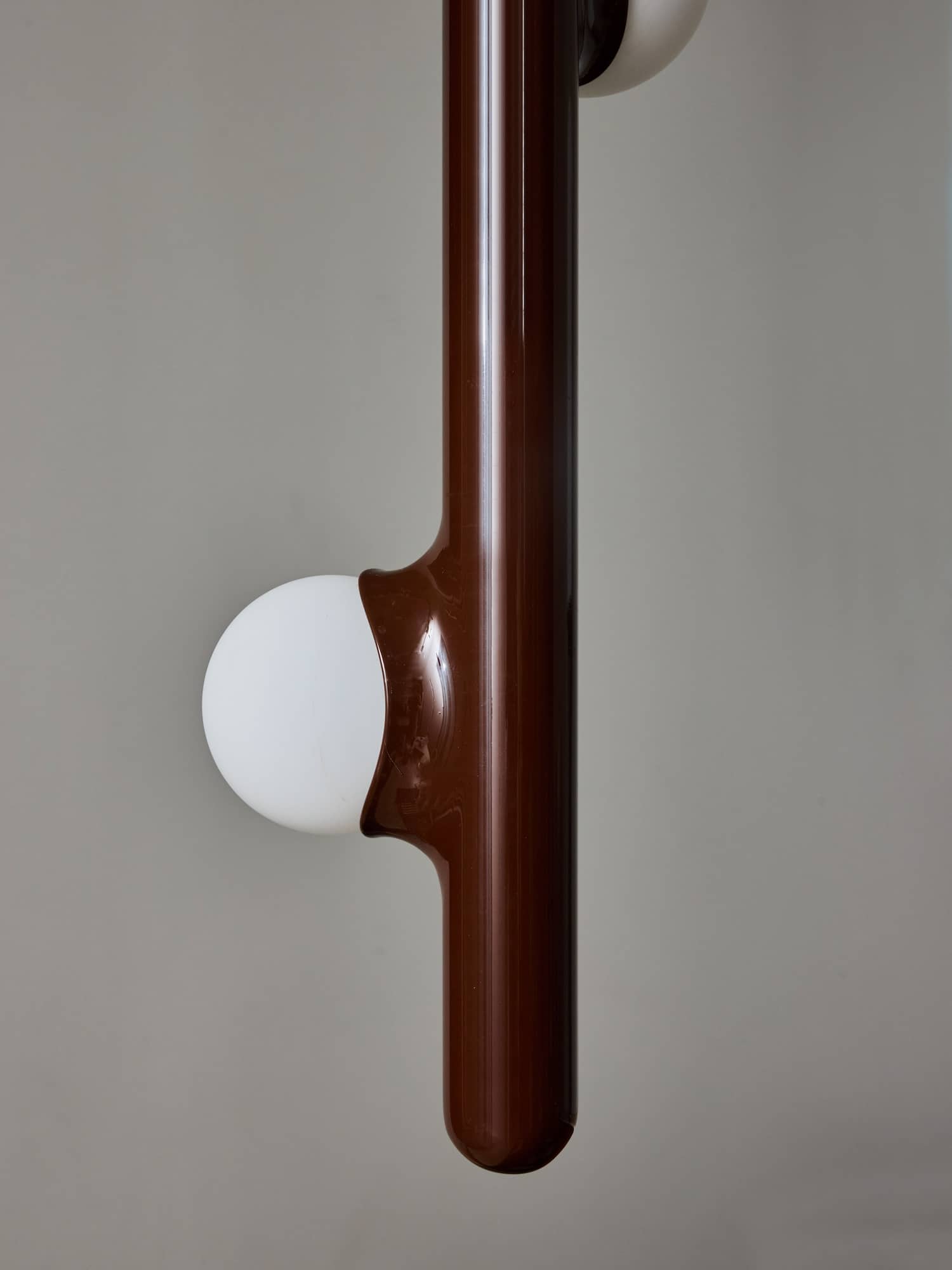 L’attention portée à la matière est remarquable. Le métal peint est rehaussé d’une finition laquée brillante qui capte subtilement la lumière ambiante, tandis que les sphères en verre opale, lisses, satinées, filtrent la lumière pour offrir un éclairage doux, enveloppant, sans éblouissement.