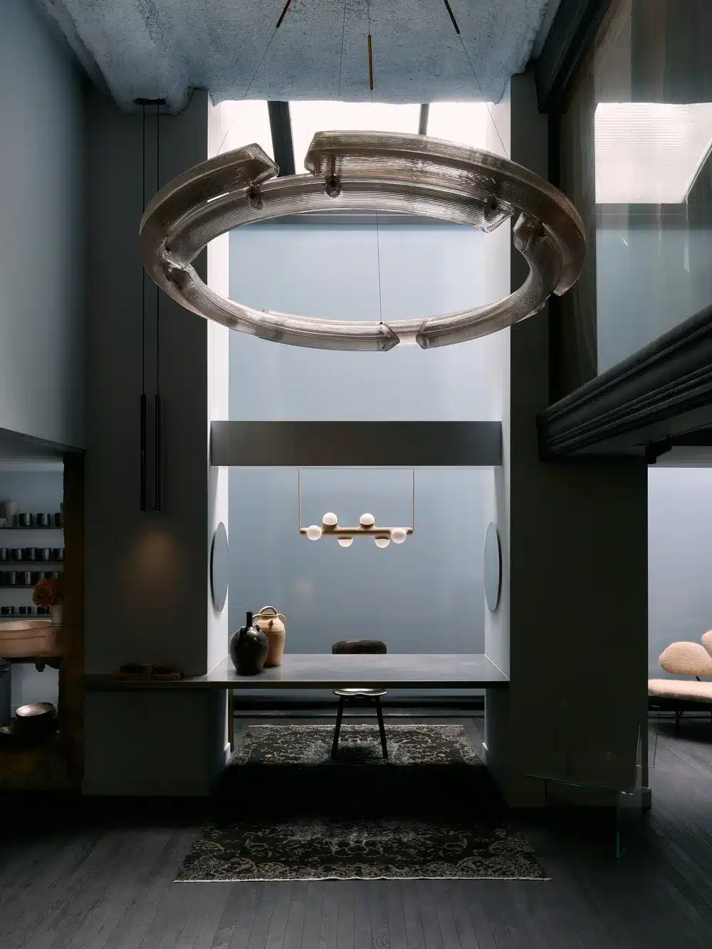 L’approche de Mickaël, déjà saluée dans d’autres projets pour sa capacité à rendre la matière expressive, prend ici une dimension supplémentaire. La collaboration avec Glustin Luminaires révèle un dialogue entre deux sensibilités : l’une sculpturale, instinctive, l’autre tournée vers la scénographie de l’objet dans l’espace.