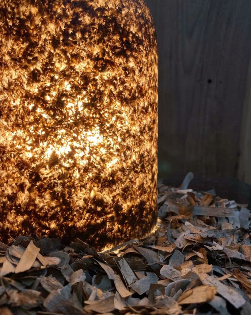 Une fois mises en forme à l’aide de moules en bois recyclés, elles deviennent des plaques translucides ou des éléments de mobilier qui conservent la texture naturelle de chaque feuille. Ce matériau, unique à chaque pièce, laisse passer la lumière, donnant vie à des objets presque vivants, en perpétuel dialogue avec leur environnement.