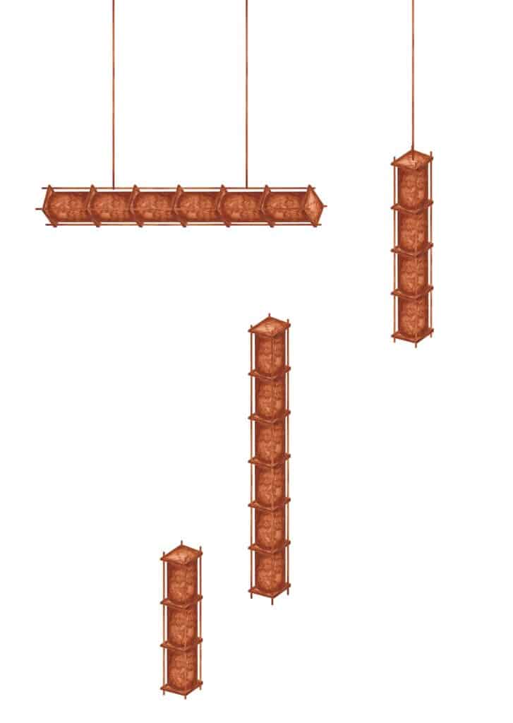 Cette collection se décline en quatre typologies : Lampe à poser, Lampadaire, Suspension horizontale, Suspension verticale.