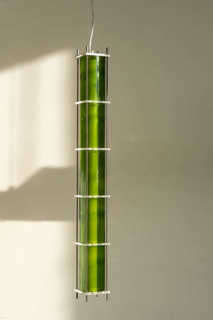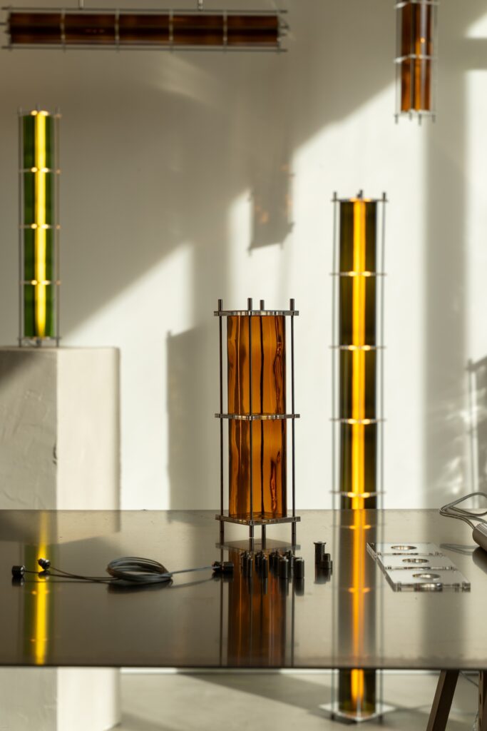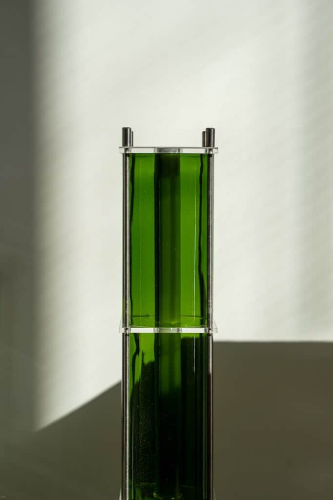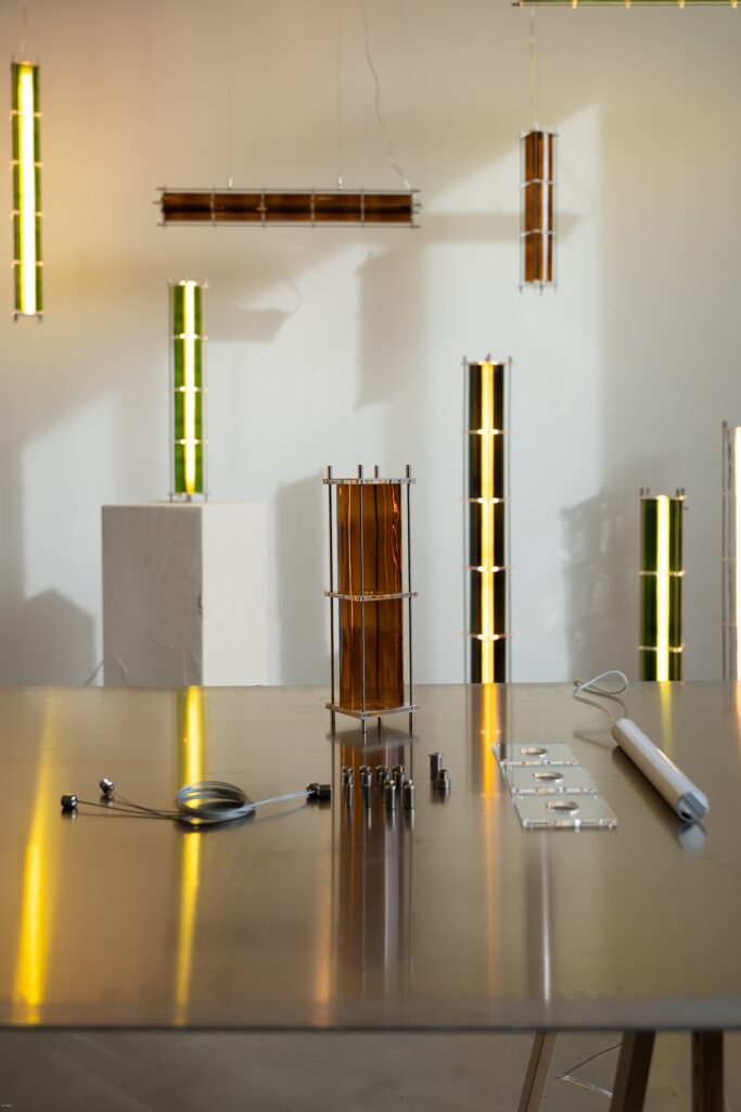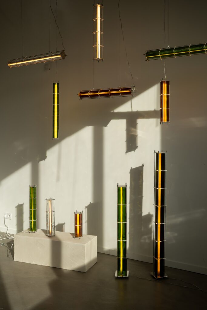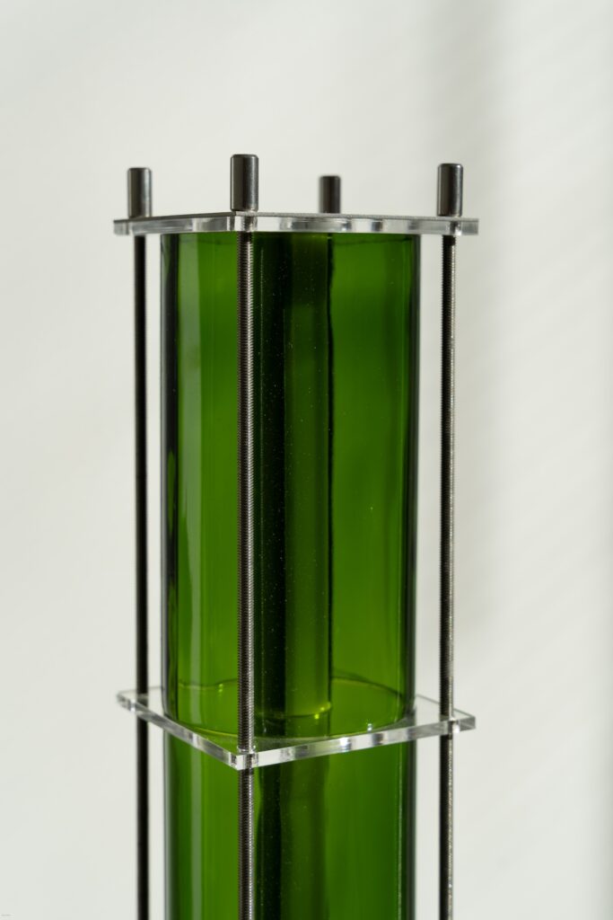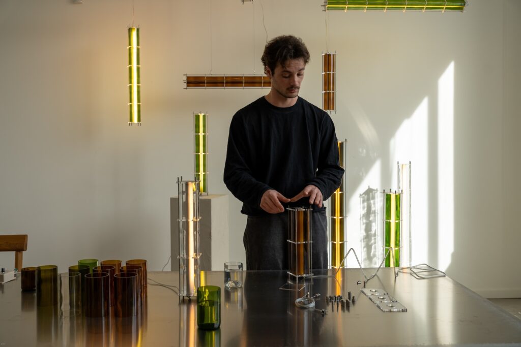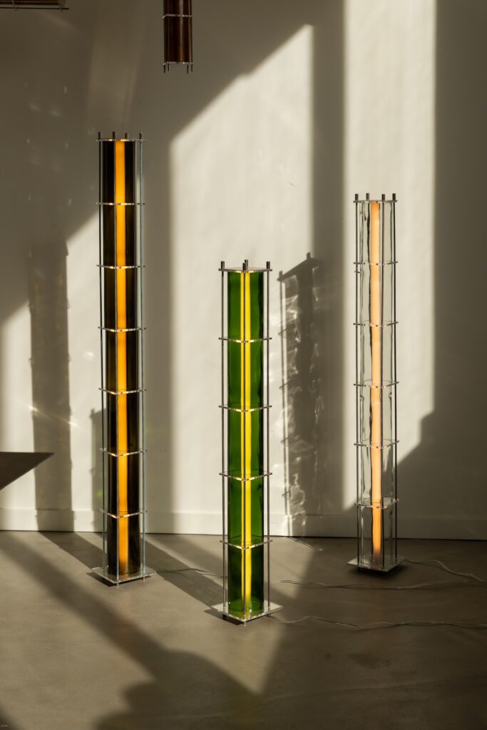 Le fruit de cette transition prend forme dans une première collection baptisée CYL, pensée en collaboration avec Théo Charasse. Designer connu pour ses objets à la fois poétiques et structurés, il a trouvé dans le verre recyclé un terrain de jeu stimulant. Le point de départ ? La bouteille, encore et toujours. Coupée, superposée, revisitée. Le cylindre devient module, rythme, structure. Le luminaire se pense alors en volumes verticaux et horizontaux, jouant avec les transparences, les teintes et les reflets.