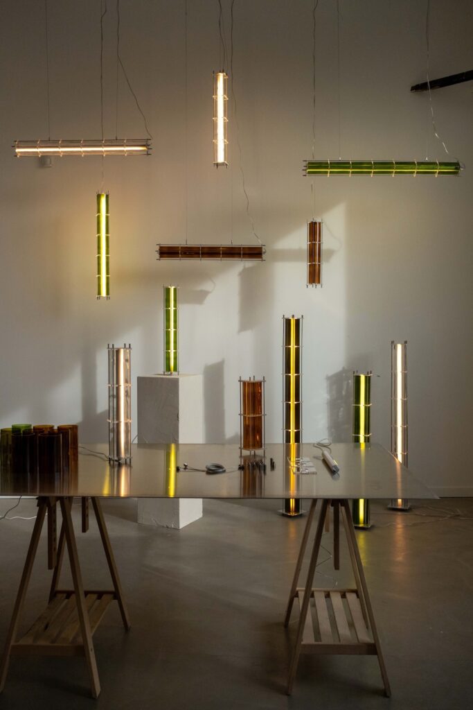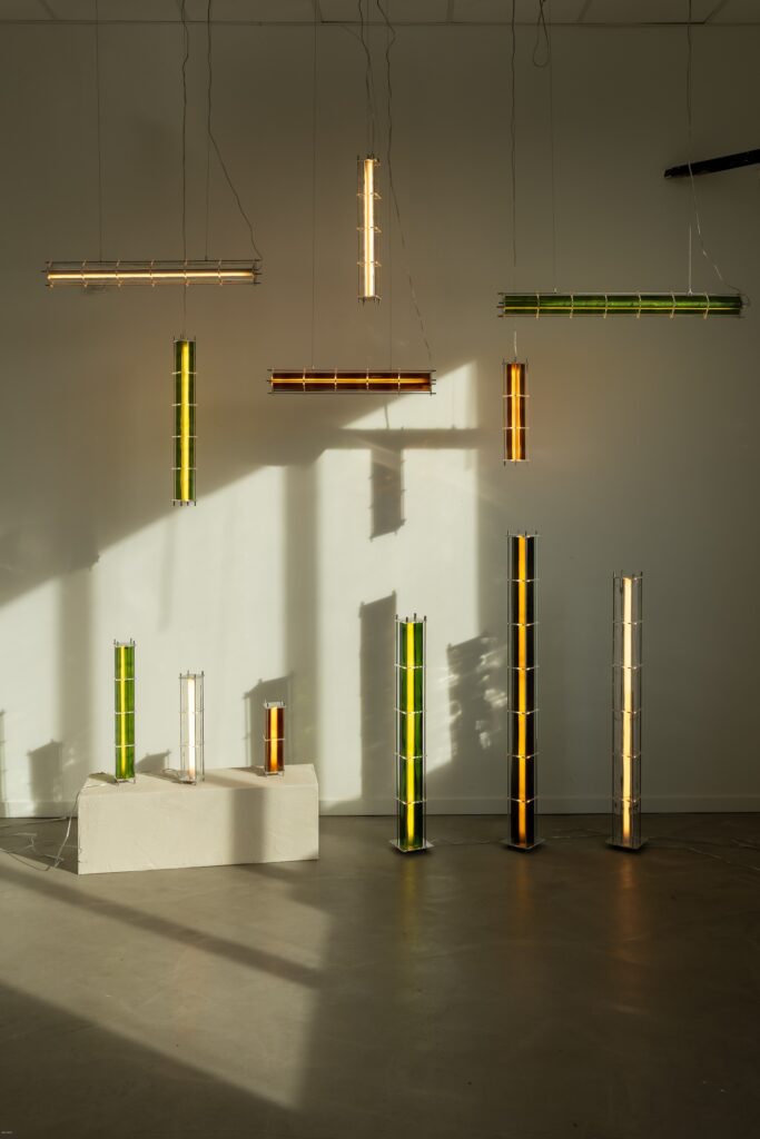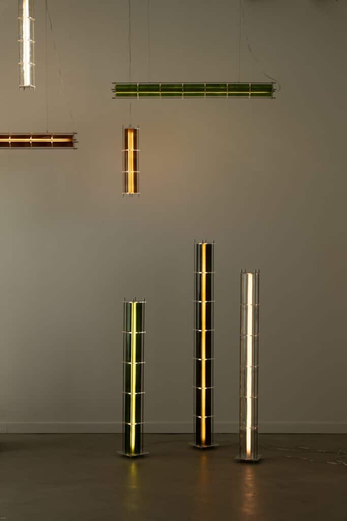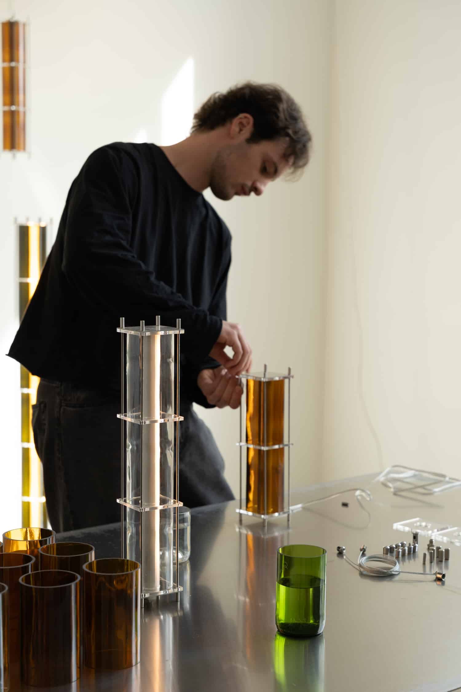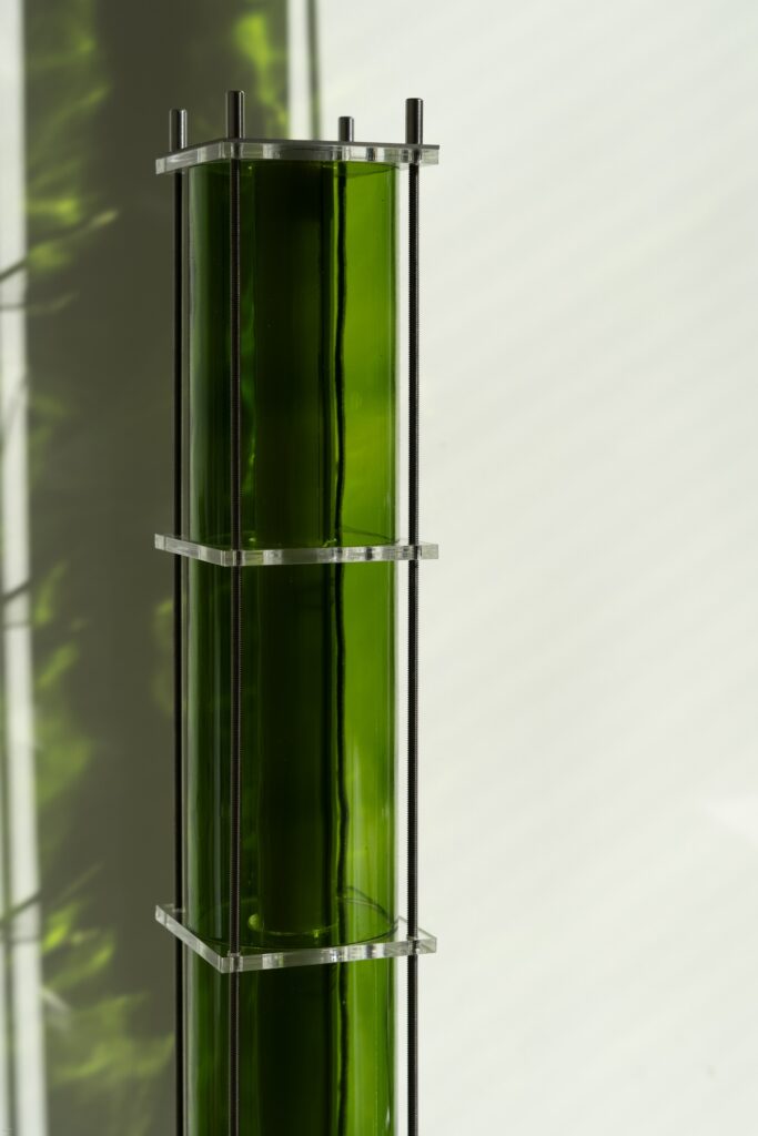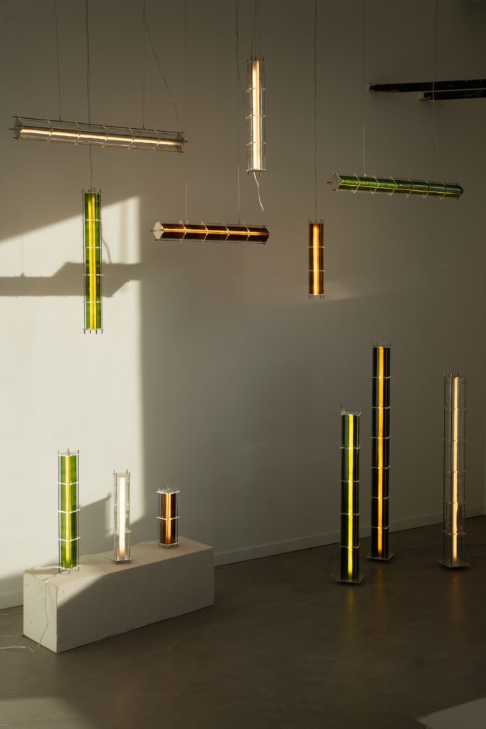 Le fruit de cette transition prend forme dans une première collection baptisée CYL, pensée en collaboration avec Théo Charasse. Designer connu pour ses objets à la fois poétiques et structurés, il a trouvé dans le verre recyclé un terrain de jeu stimulant. Le point de départ ? La bouteille, encore et toujours. Coupée, superposée, revisitée. Le cylindre devient module, rythme, structure. Le luminaire se pense alors en volumes verticaux et horizontaux, jouant avec les transparences, les teintes et les reflets.