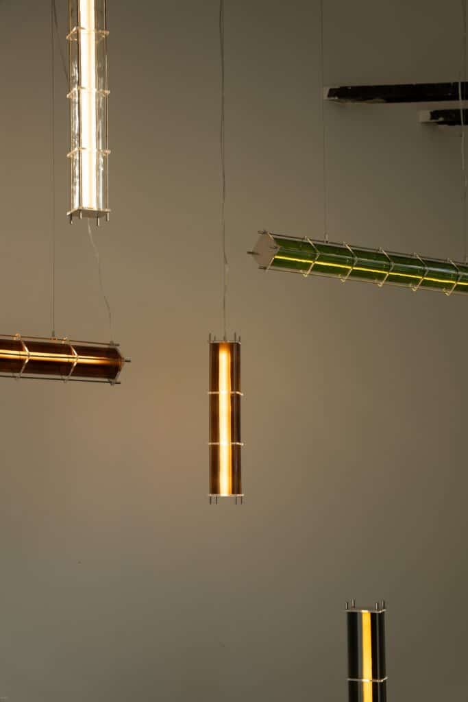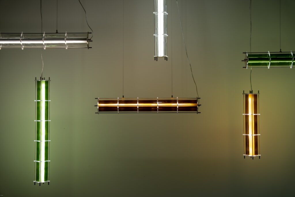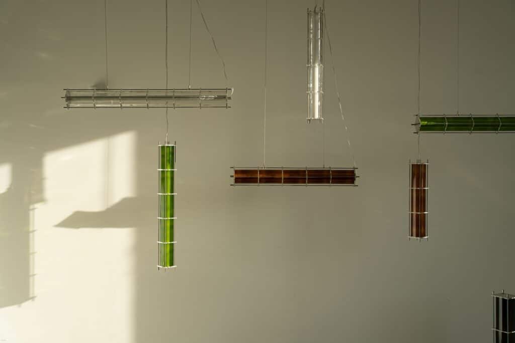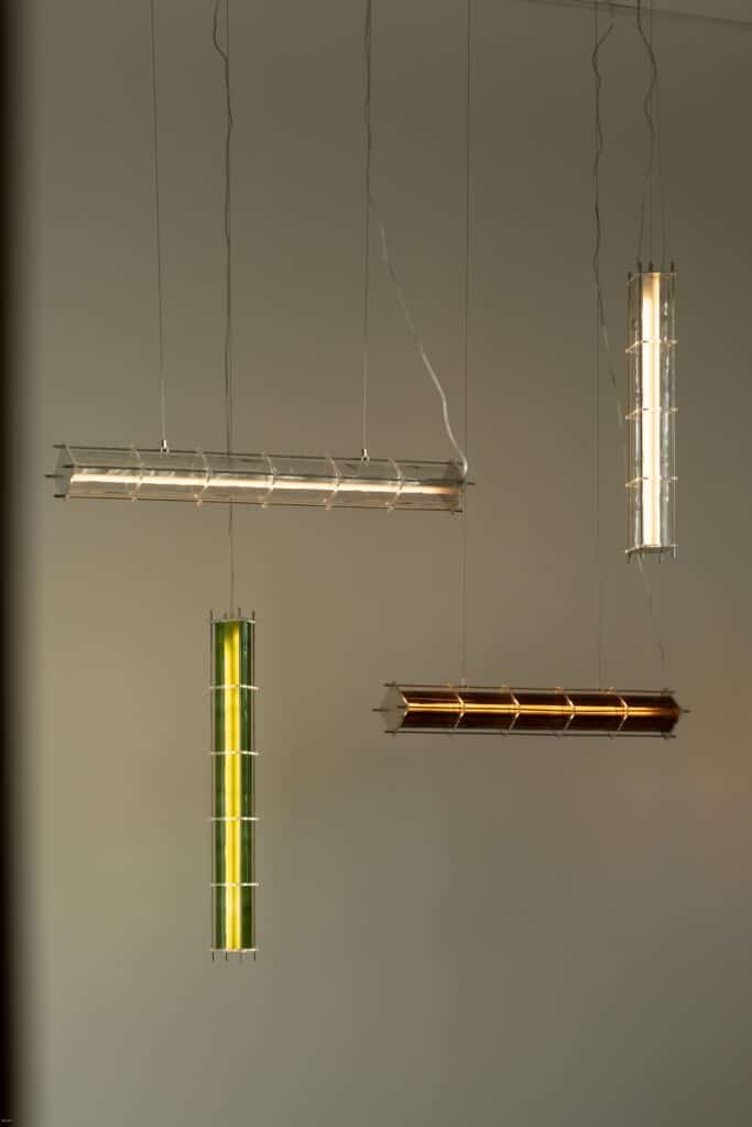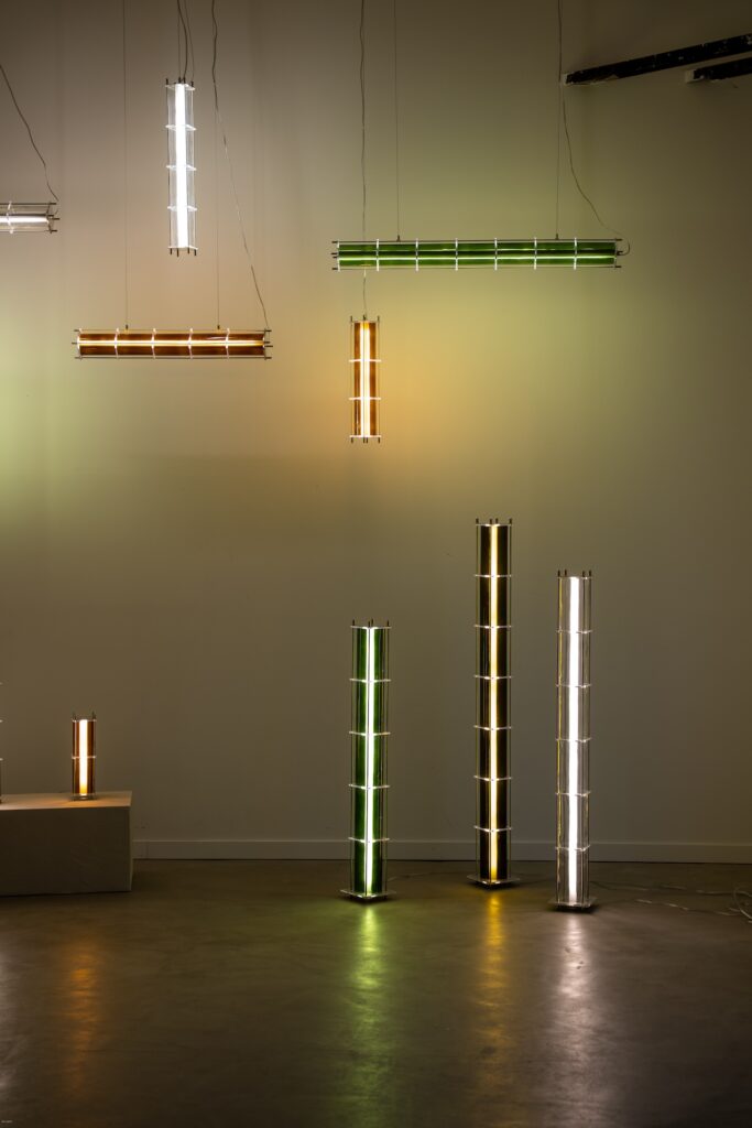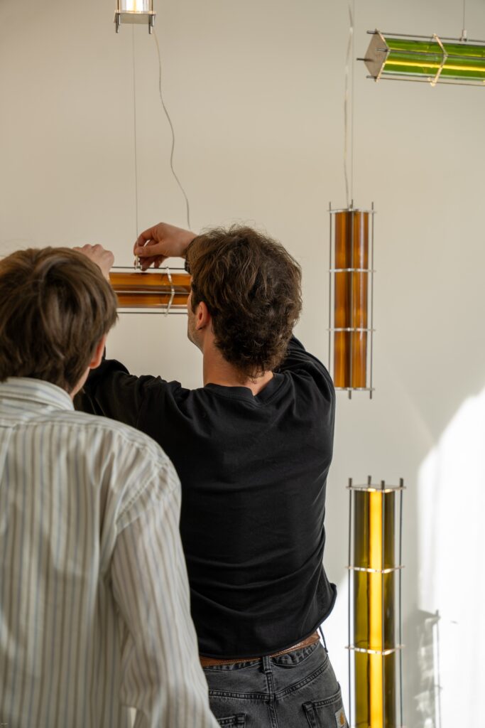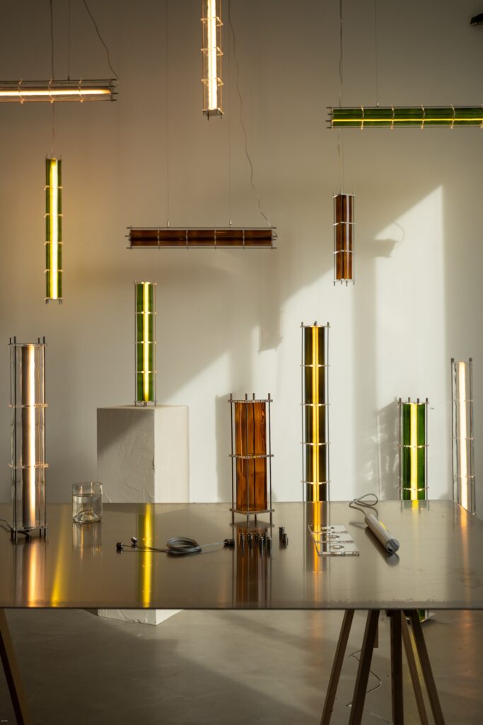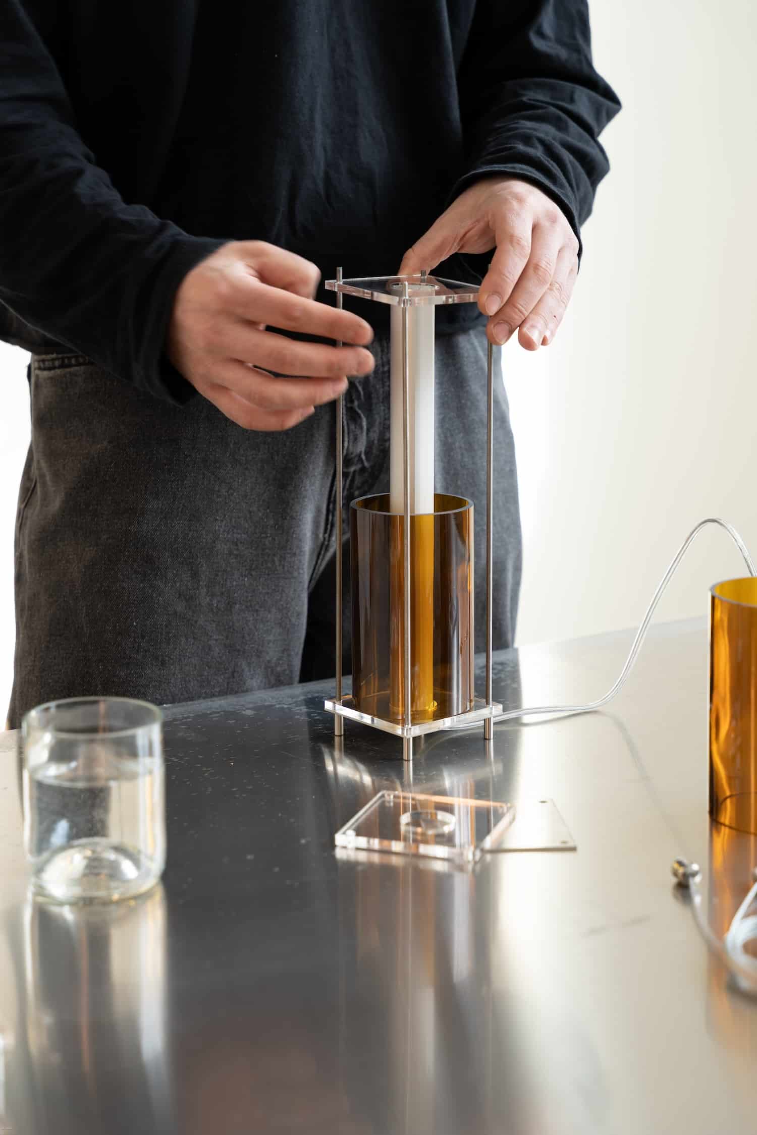 Le fruit de cette transition prend forme dans une première collection baptisée CYL, pensée en collaboration avec Théo Charasse. Designer connu pour ses objets à la fois poétiques et structurés, il a trouvé dans le verre recyclé un terrain de jeu stimulant. Le point de départ ? La bouteille, encore et toujours. Coupée, superposée, revisitée. Le cylindre devient module, rythme, structure. Le luminaire se pense alors en volumes verticaux et horizontaux, jouant avec les transparences, les teintes et les reflets.
