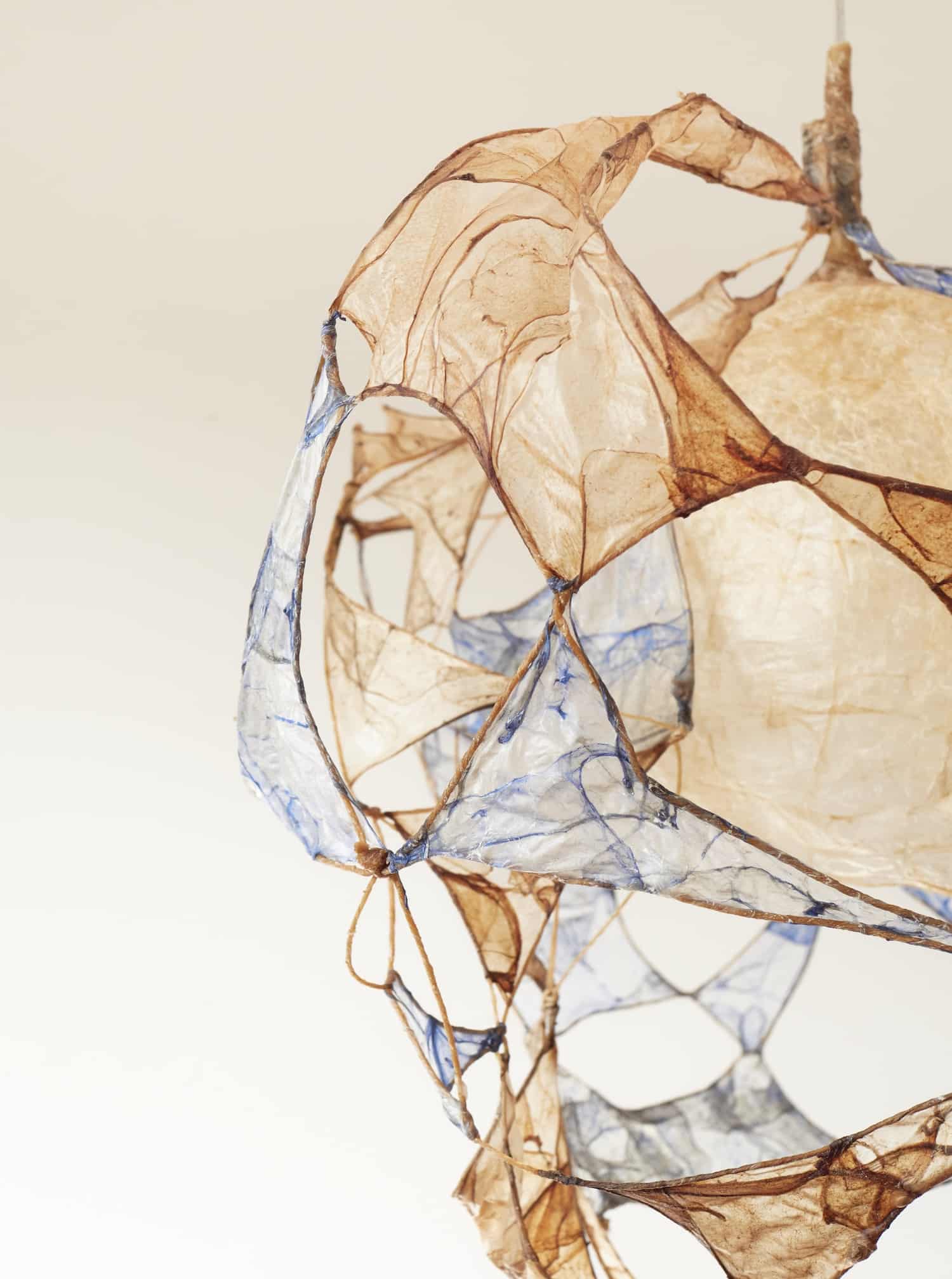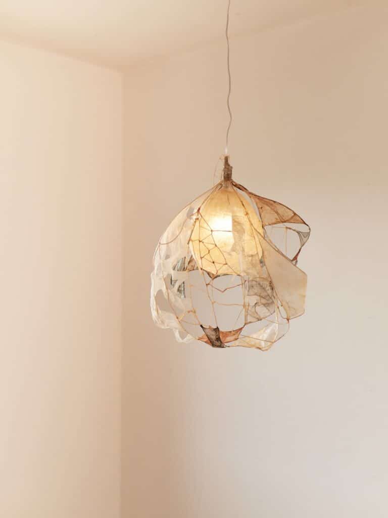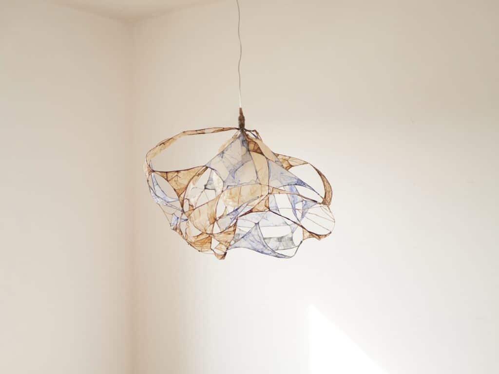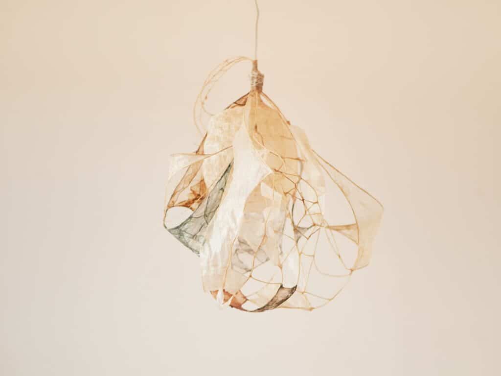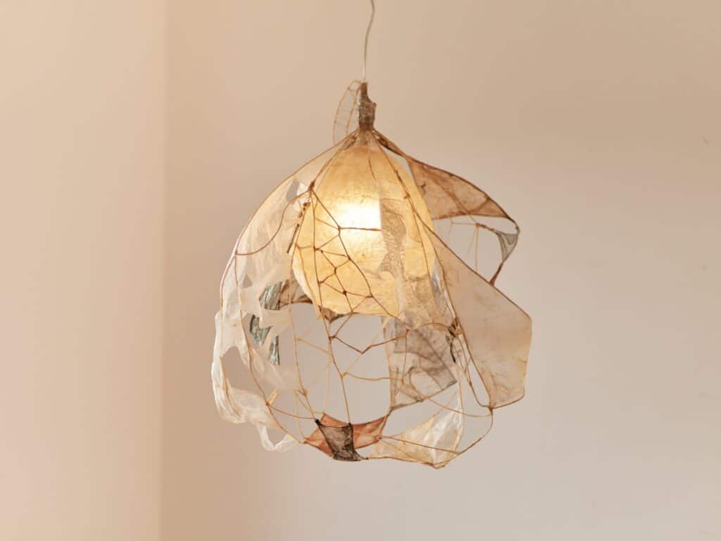 Le regard s’arrête, surpris. Une suspension flotte dans l’espace, douce, est-elle organique ? Sa lumière est tamisée, presque liquide, douce et intrigante. On se rapproche, et c’est là que l’objet révèle sa matière : un assemblage délicat de membranes organiques, animales, précisément des chutes d’intestins issues de l’industrie agroalimentaire.