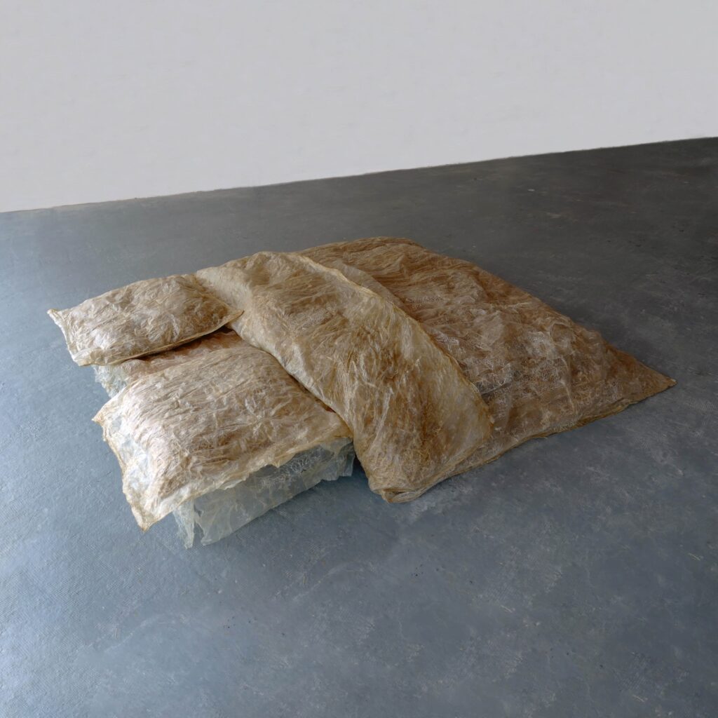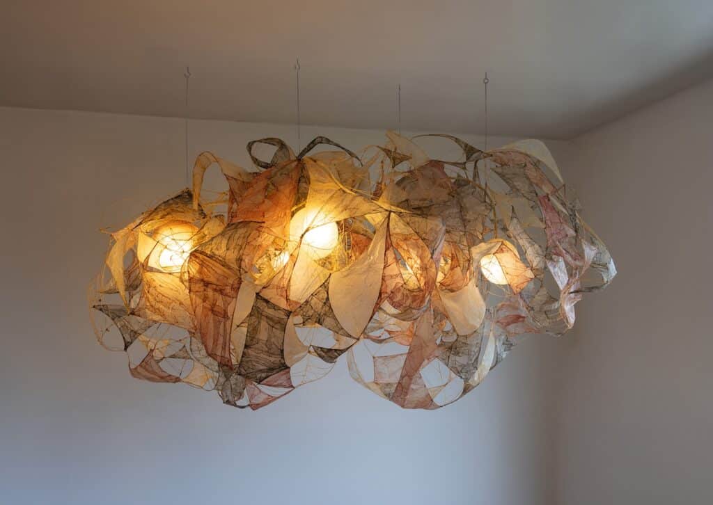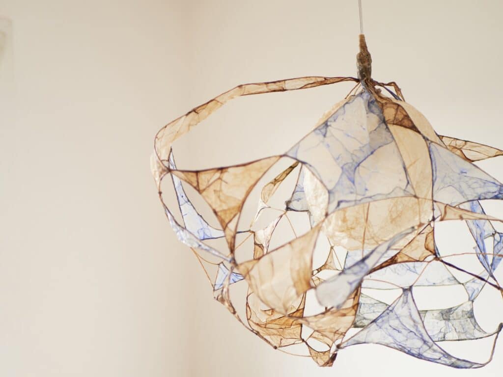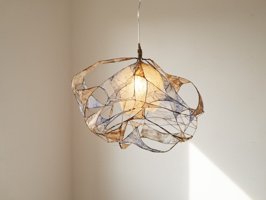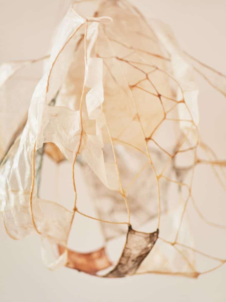 Le regard s’arrête, surpris. Une suspension flotte dans l’espace, douce, est-elle organique ? Sa lumière est tamisée, presque liquide, douce et intrigante. On se rapproche, et c’est là que l’objet révèle sa matière : un assemblage délicat de membranes organiques, animales, précisément des chutes d’intestins issues de l’industrie agroalimentaire.