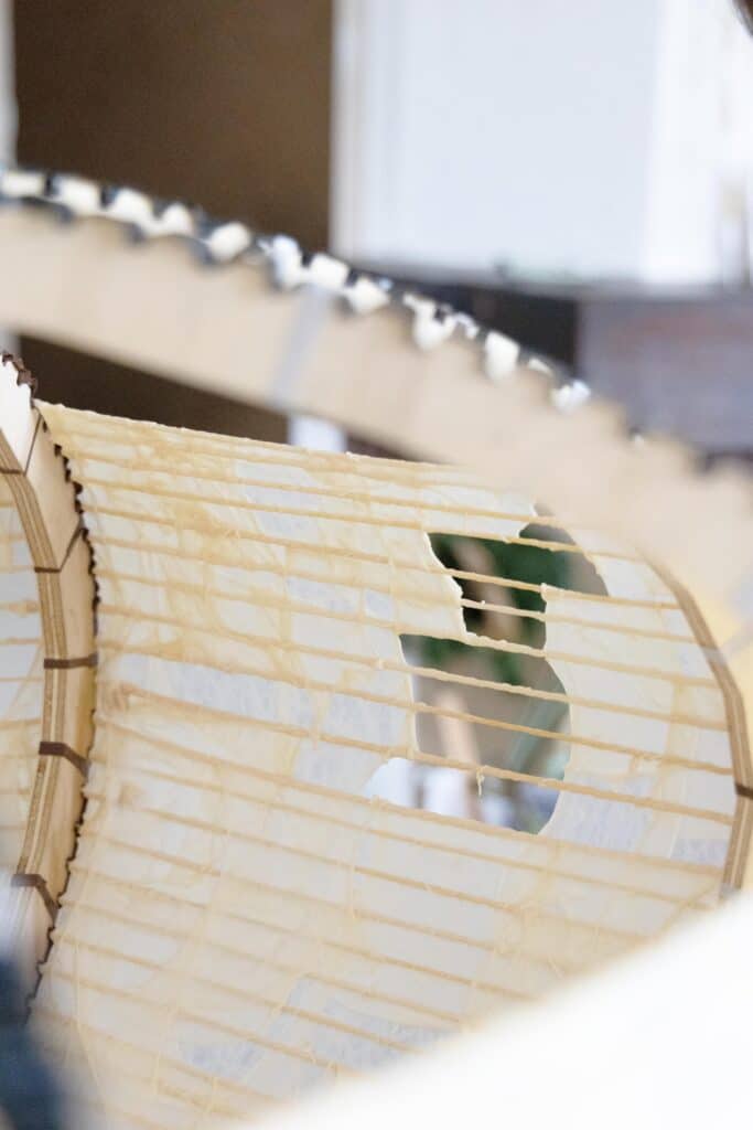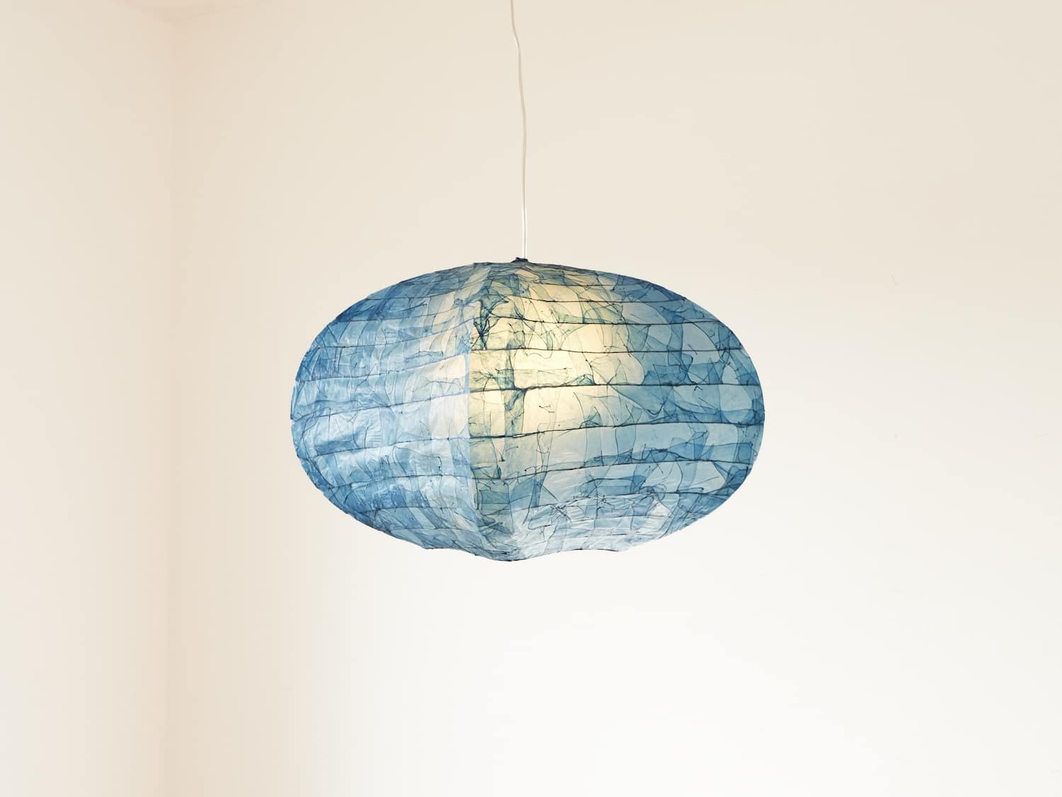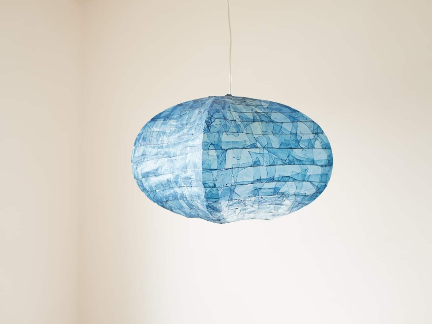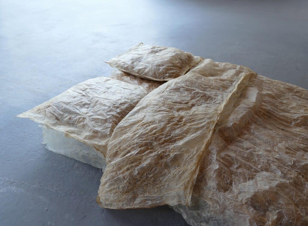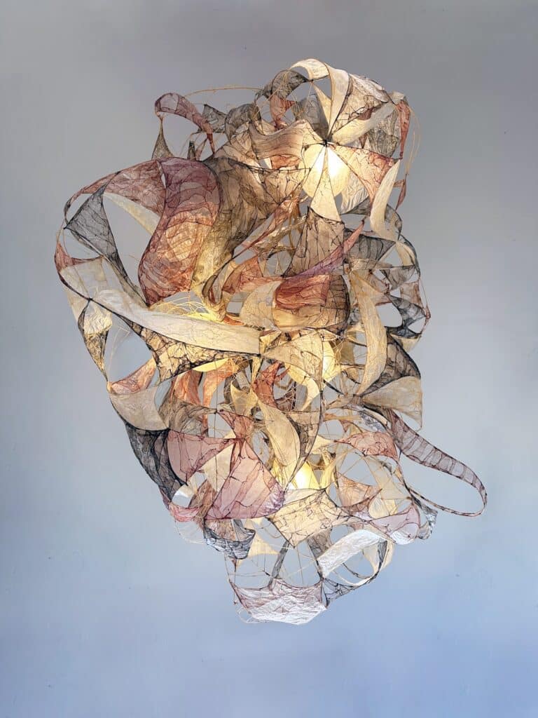 Le regard s’arrête, surpris. Une suspension flotte dans l’espace, douce, est-elle organique ? Sa lumière est tamisée, presque liquide, douce et intrigante. On se rapproche, et c’est là que l’objet révèle sa matière : un assemblage délicat de membranes organiques, animales, précisément des chutes d’intestins issues de l’industrie agroalimentaire.