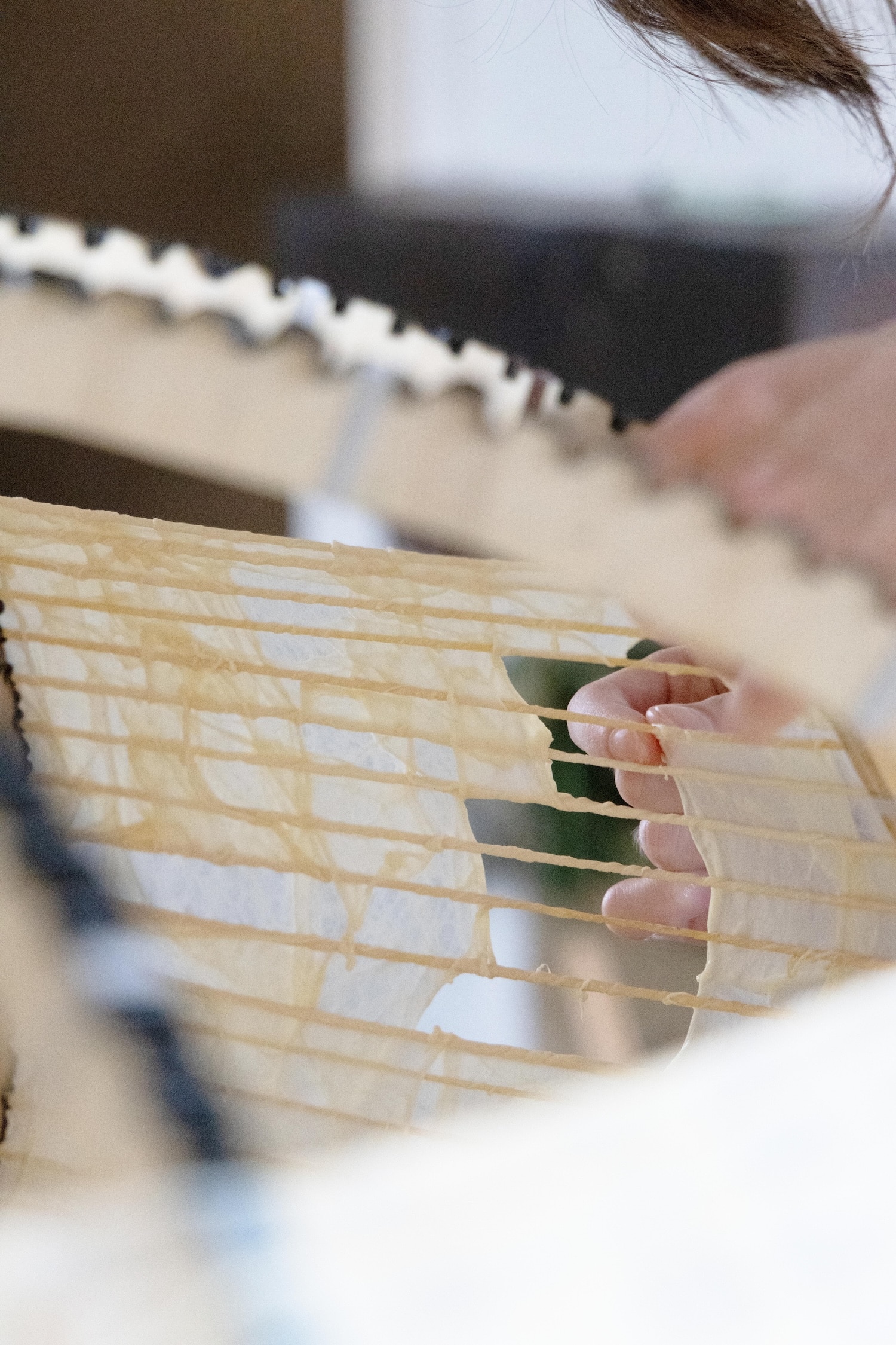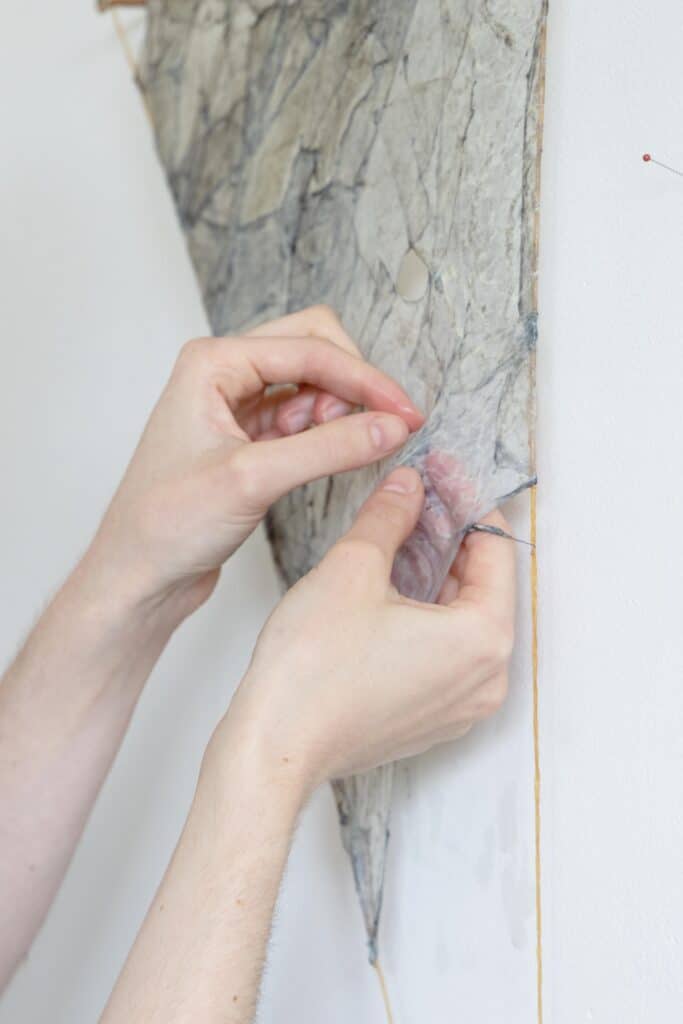 Inspiré par les savoir-faire oubliés des peuples inuit ou subsahariens, Thibault Philip transforme cette matière biologique en une nouvelle toile pour y dessiner de nouveaux projets : papier, fil, tresse, feuille… Chaque pièce est le fruit d’un travail de teinture (à l’encre de seiche, au nila ou à la racine de garance), de façonnage manuel et d’assemblage sans colle ni résine, grâce aux propriétés auto-adhésives des protéines animales mises en lumière en collaboration avec le CNRS.
