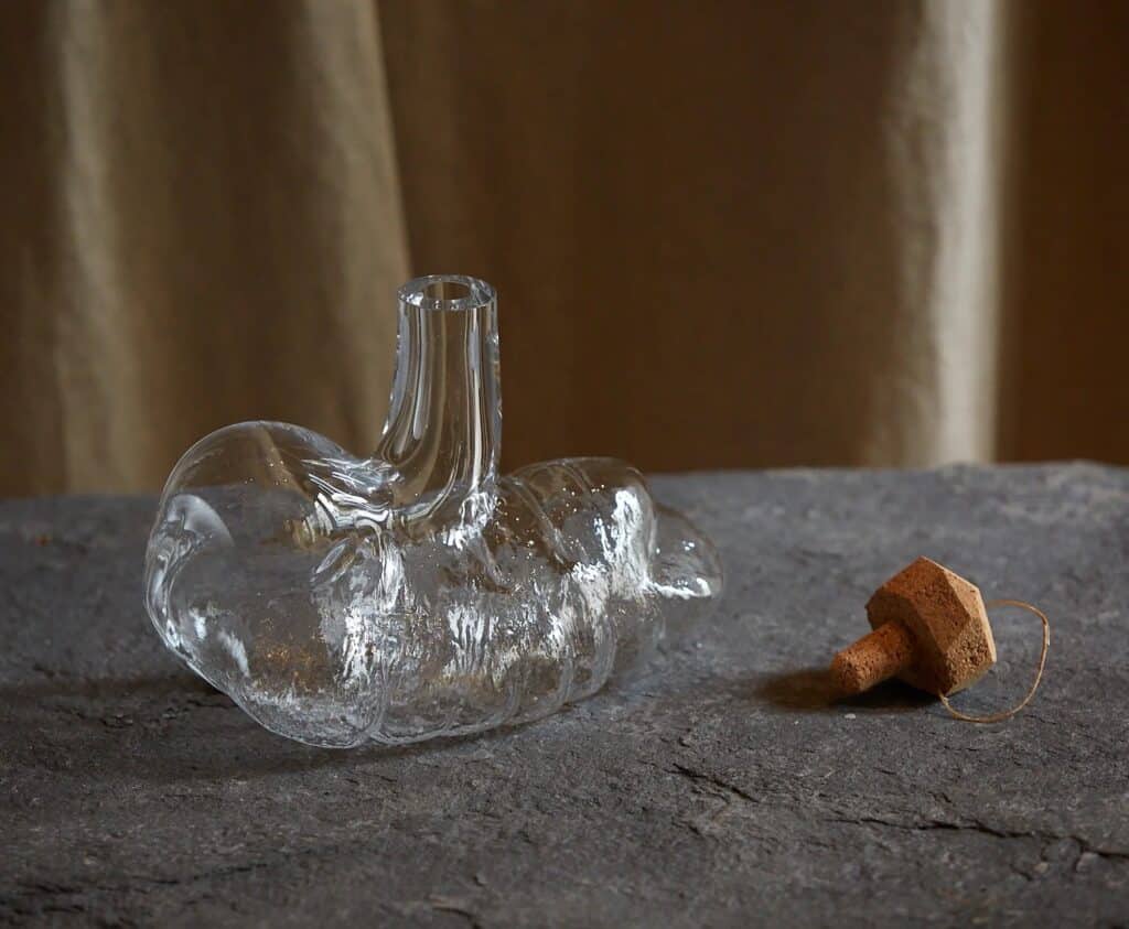 Dans une série de pièces soufflées, Service/Viscère, le verre prend lui aussi les formes des viscères. Chaque contenant est réalisé à partir de moules en organes, mêlant techniques verrières et références anthropologiques. L’approche est frontale, presque dérangeante, mais elle soulève une question essentielle : quelles valeurs attribuons-nous à une matière selon son origine ?