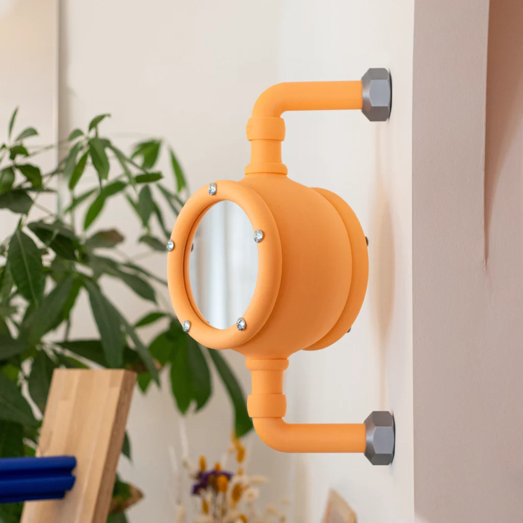 L’inspiration puisée dans les modules rotatifs des aires de jeux pour enfants confère à l’objet une dimension ludique et nostalgique. Le miroir est conçu pour être manipulé régulièrement : il s’oriente selon l’envie, sans mécanisme visible, invitant à l’interaction quotidienne. Cette approche rappelle les réflexions du Studiolow sur les fixations murales, où des éléments traditionnellement statiques deviennent des supports pour de nouvelles fonctionnalités.