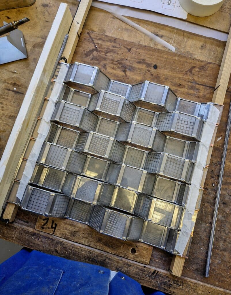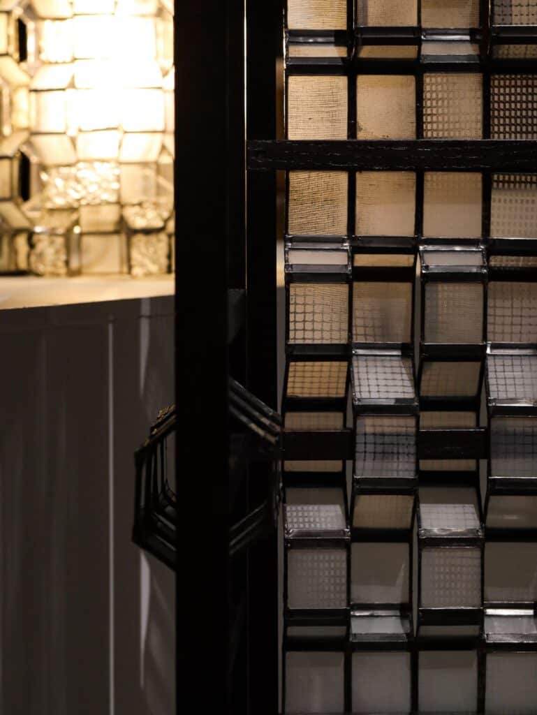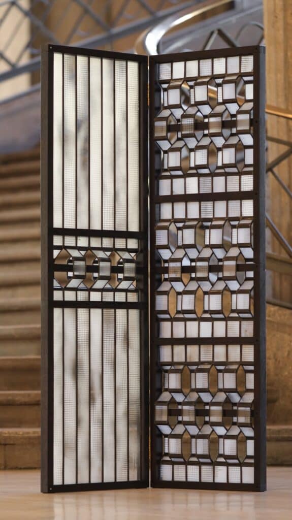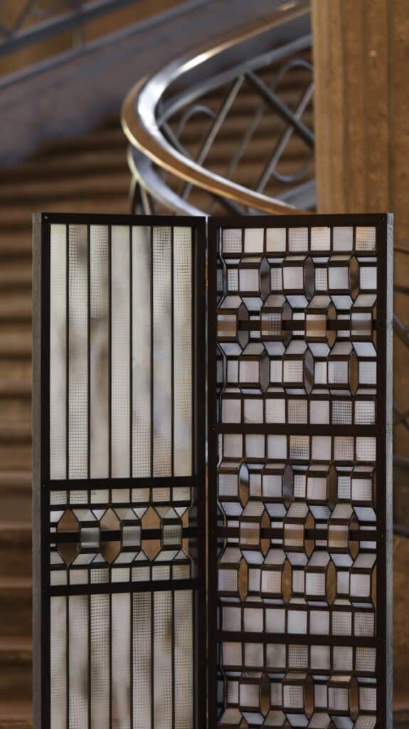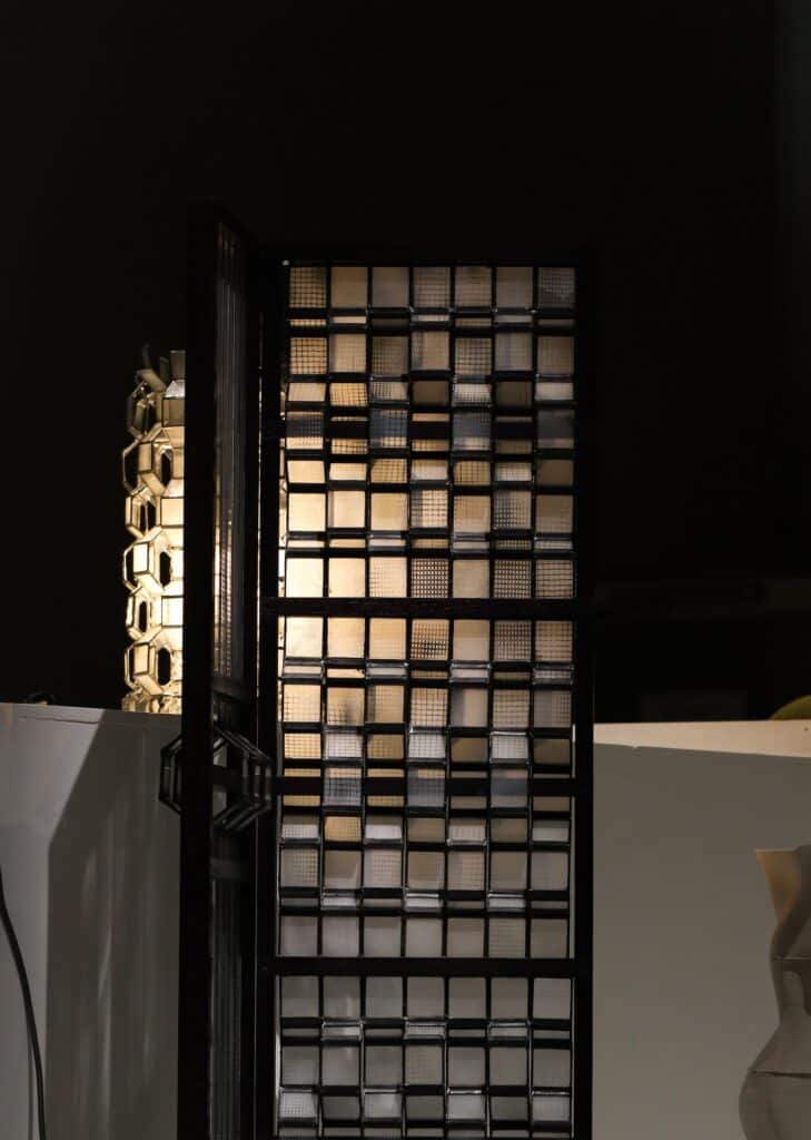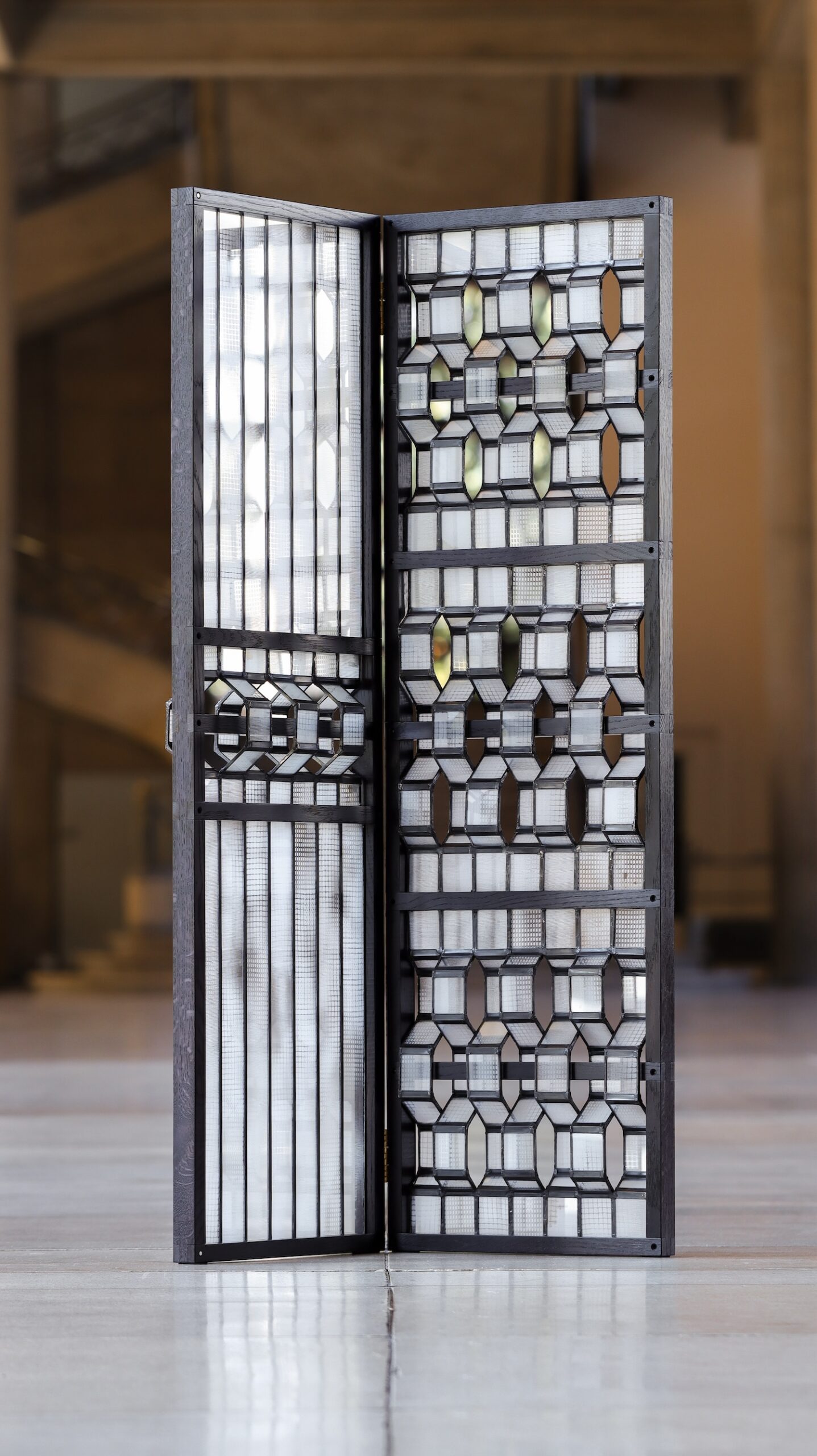 On aime particulièrement la mise en avant des matériaux, de l’idée même de créer une pièce hybride, un paravent sans en être un, un lumière, sans source, une mise en beauté du métal, du verre, tel un vitrail, nous restons simplement à l’admirer. Chapeau.