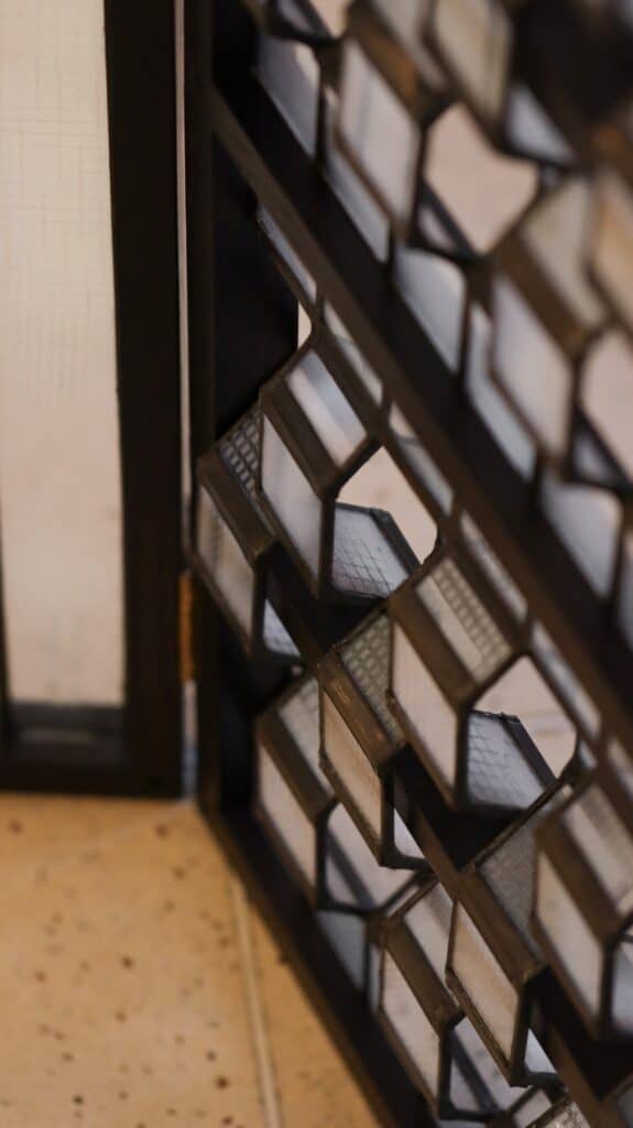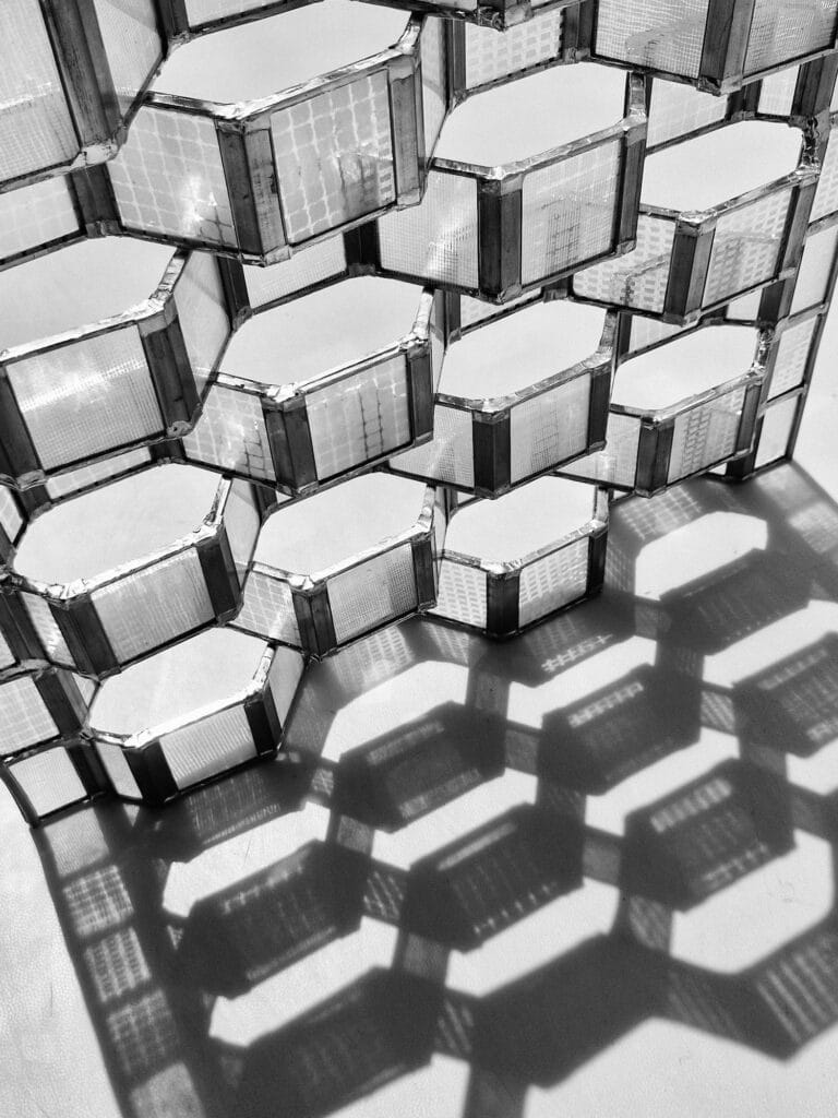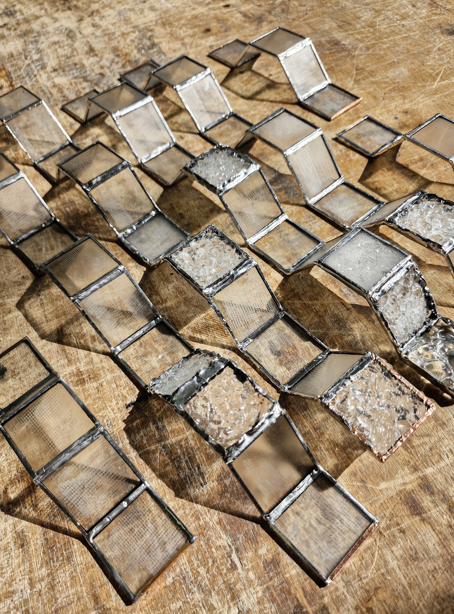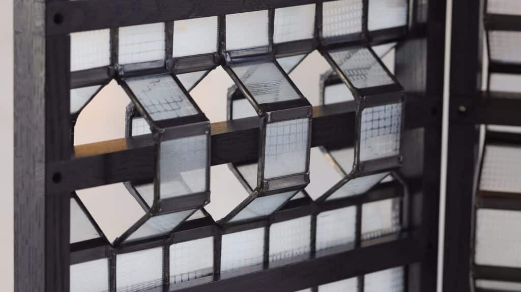 Le travail du verre float sablé, sertissage au cuivre et au plomb offre une matière bien vivante et projetée dans un nouvel environnement. En interaction permanente avec la lumière, les surfaces captent, diffusent et projettent des jeux d’ombres graphiques. Les lignes se prolongent au sol et sur les murs, créant un paysage visuel en perpétuelle évolution. Une expérience immersive, sensible, presque cinétique.