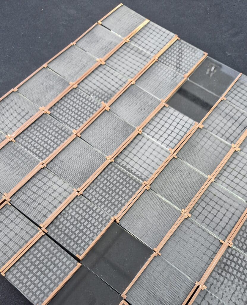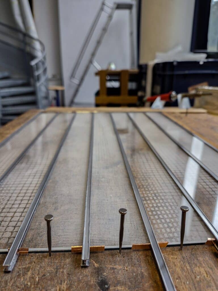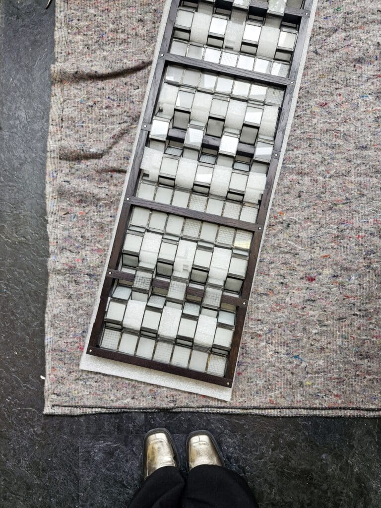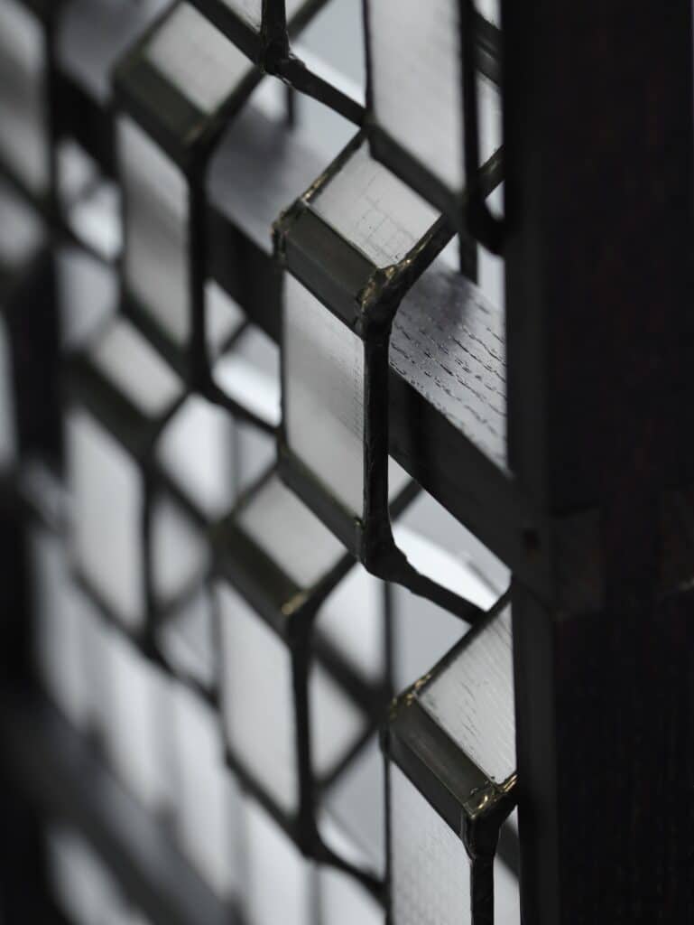 Le travail du verre float sablé, sertissage au cuivre et au plomb offre une matière bien vivante et projetée dans un nouvel environnement. En interaction permanente avec la lumière, les surfaces captent, diffusent et projettent des jeux d’ombres graphiques. Les lignes se prolongent au sol et sur les murs, créant un paysage visuel en perpétuelle évolution. Une expérience immersive, sensible, presque cinétique.