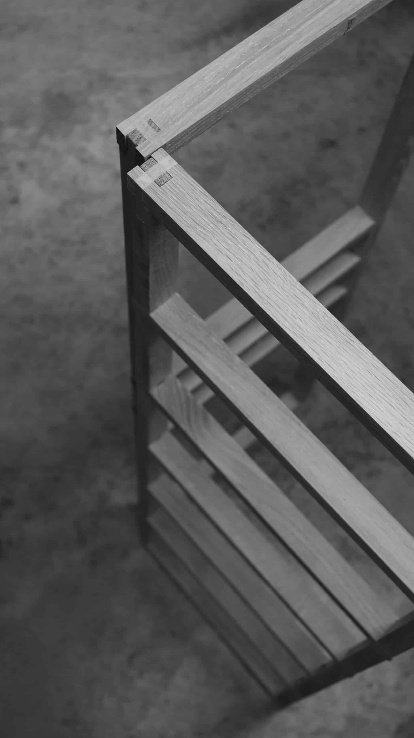 Le dessin du paravent puise son inspiration dans les codes du brutalisme, ses formes géométriques, les lignes nettes rappellent cette esthétique architecturale radicale. Pourtant, la pièce évite toute lourdeur grâce à la légèreté du verre et à la finesse de la structure en chêne, réalisée avec précision par Louis Esnault.
