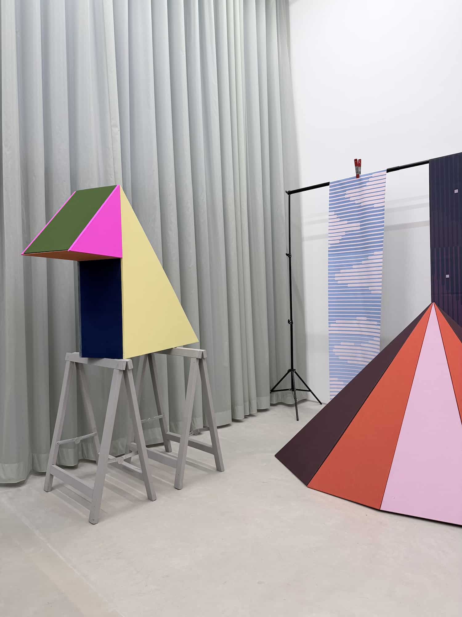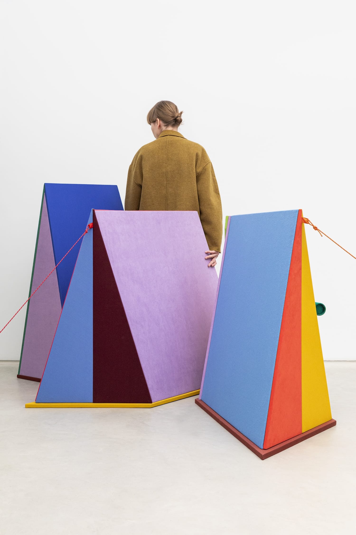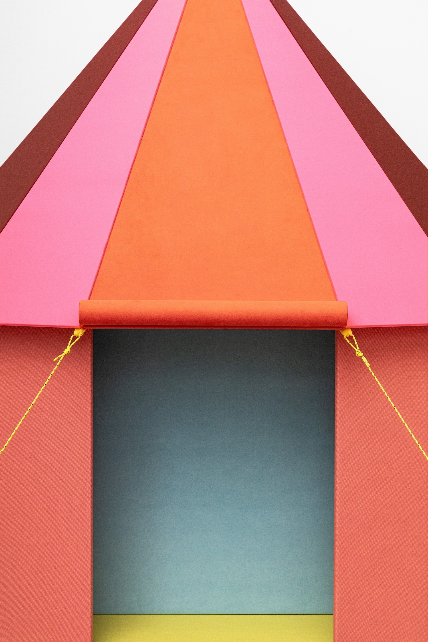 Raw Color parle de « manifestation de forme, de couleurs et de matières« . Chaque tente repose sur une géométrie simple, qui génère une identité visuelle distincte. La couleur, ensuite : les associations chromatiques ne sont pas neutres, elles racontent quelque chose de l’usage, de l’humeur, de la collection qu’elles mettent en scène. Les matières, enfin : les textiles Kvadrat ne sont pas là pour habiller, ils sont là pour signifier, pour apporter une épaisseur sensorielle à ce qui serait autrement un objet trop lisse.