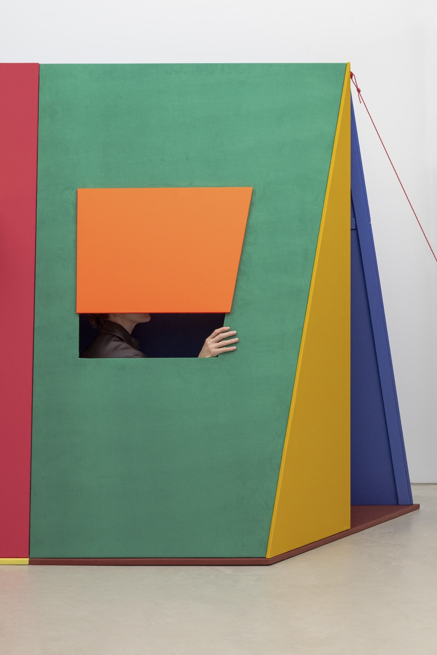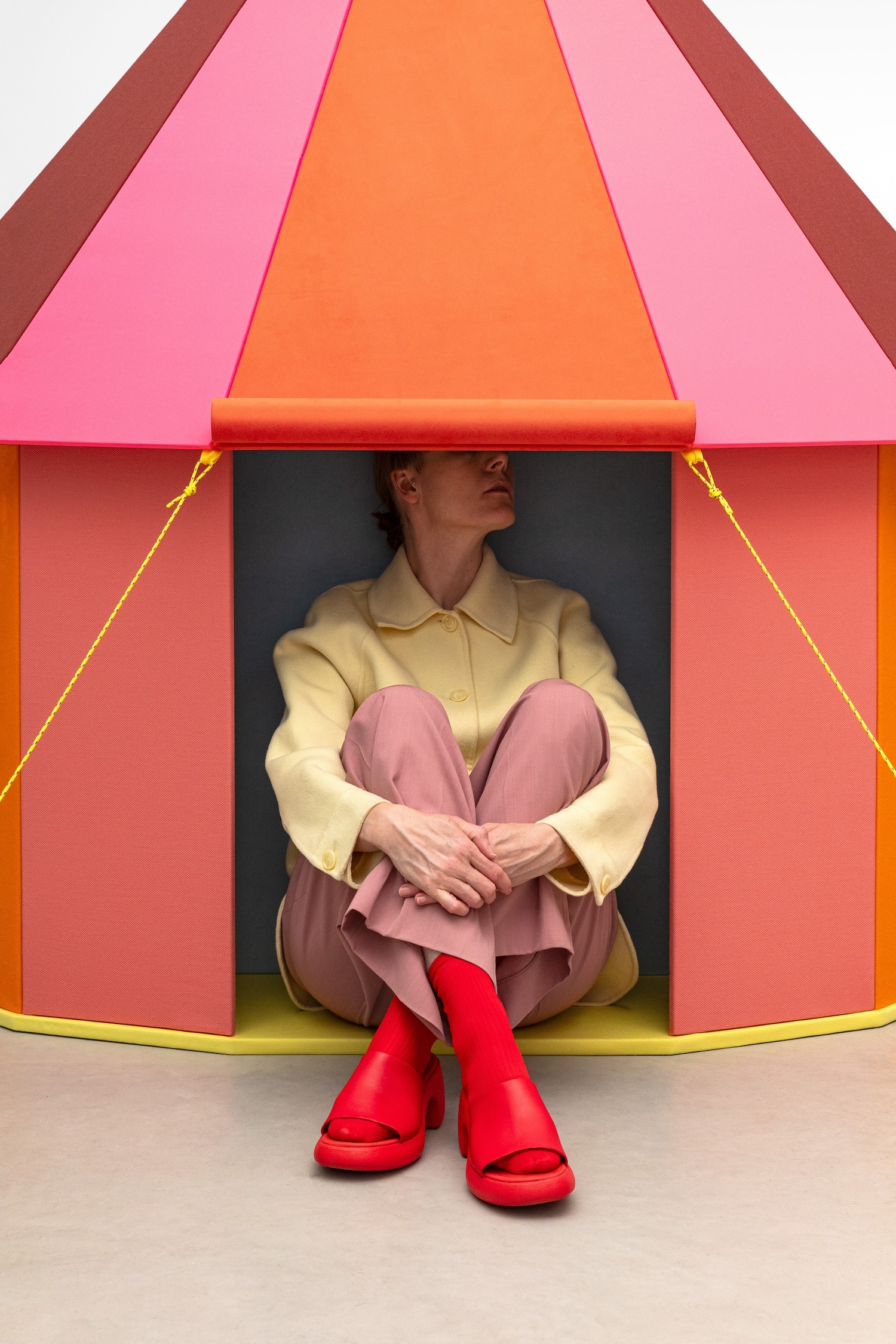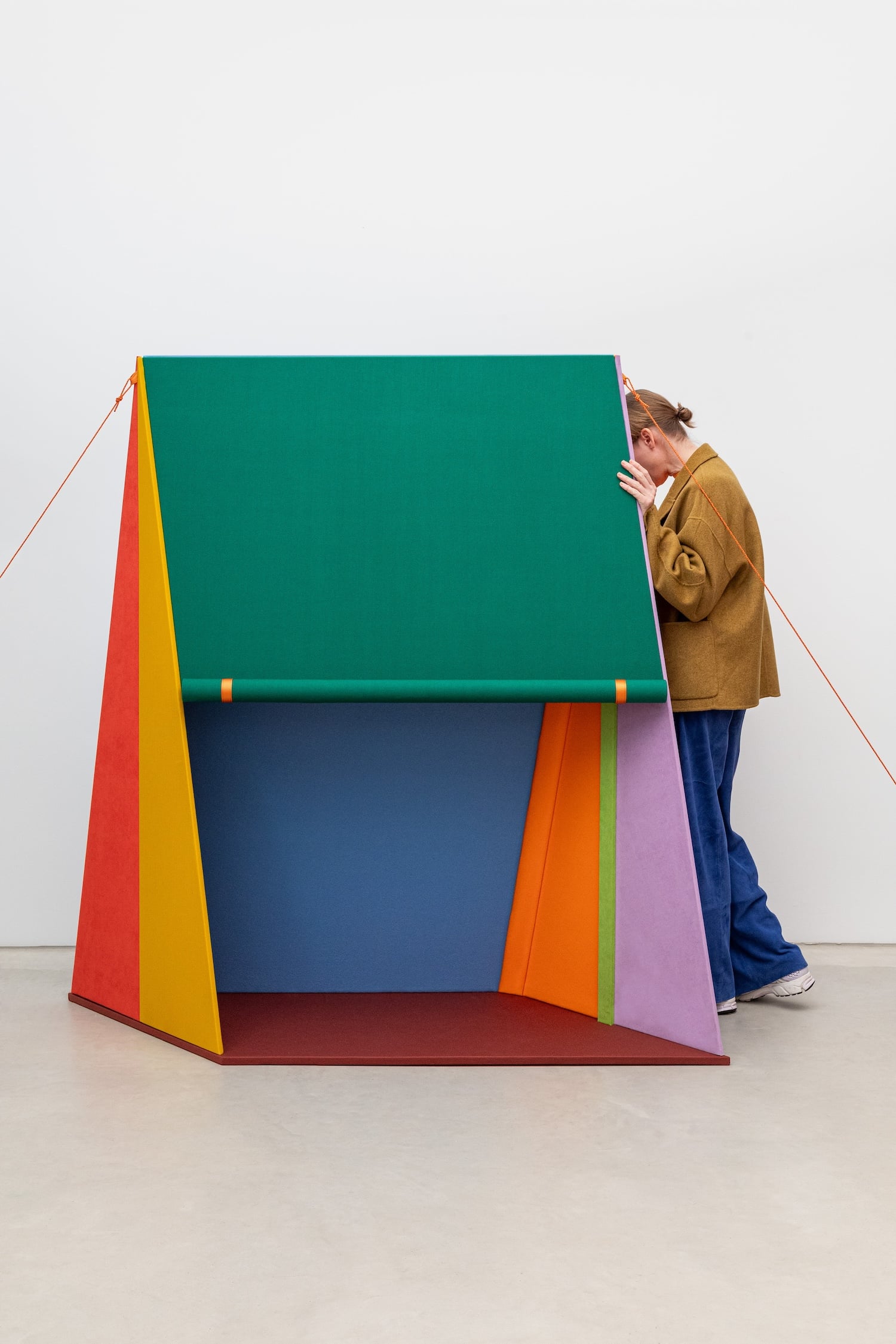 Raw Color parle de « manifestation de forme, de couleurs et de matières« . Chaque tente repose sur une géométrie simple, qui génère une identité visuelle distincte. La couleur, ensuite : les associations chromatiques ne sont pas neutres, elles racontent quelque chose de l’usage, de l’humeur, de la collection qu’elles mettent en scène. Les matières, enfin : les textiles Kvadrat ne sont pas là pour habiller, ils sont là pour signifier, pour apporter une épaisseur sensorielle à ce qui serait autrement un objet trop lisse.