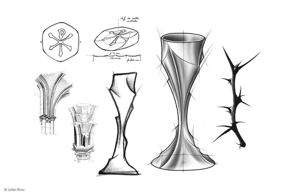 L’inspiration puise dans les éléments structurels de Notre-Dame : voûtes, arcs-boutants, nervures. Mais plutôt que de reproduire littéralement ces motifs, le designer en extrait une dynamique de forces, les plis du calice évoquent simultanément les drapés végétaux de Viollet-le-Duc et la couronne d’épines, relique emblématique de la cathédrale.