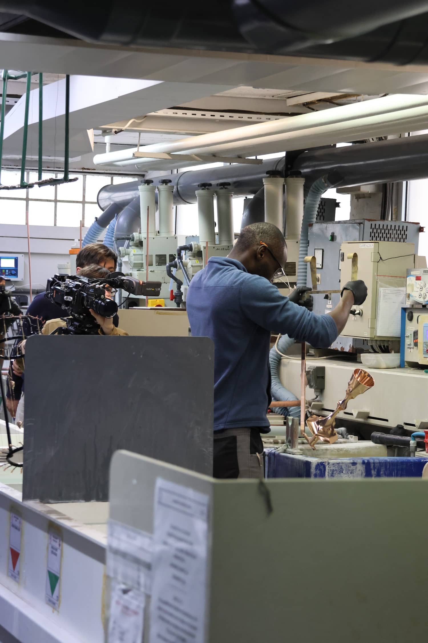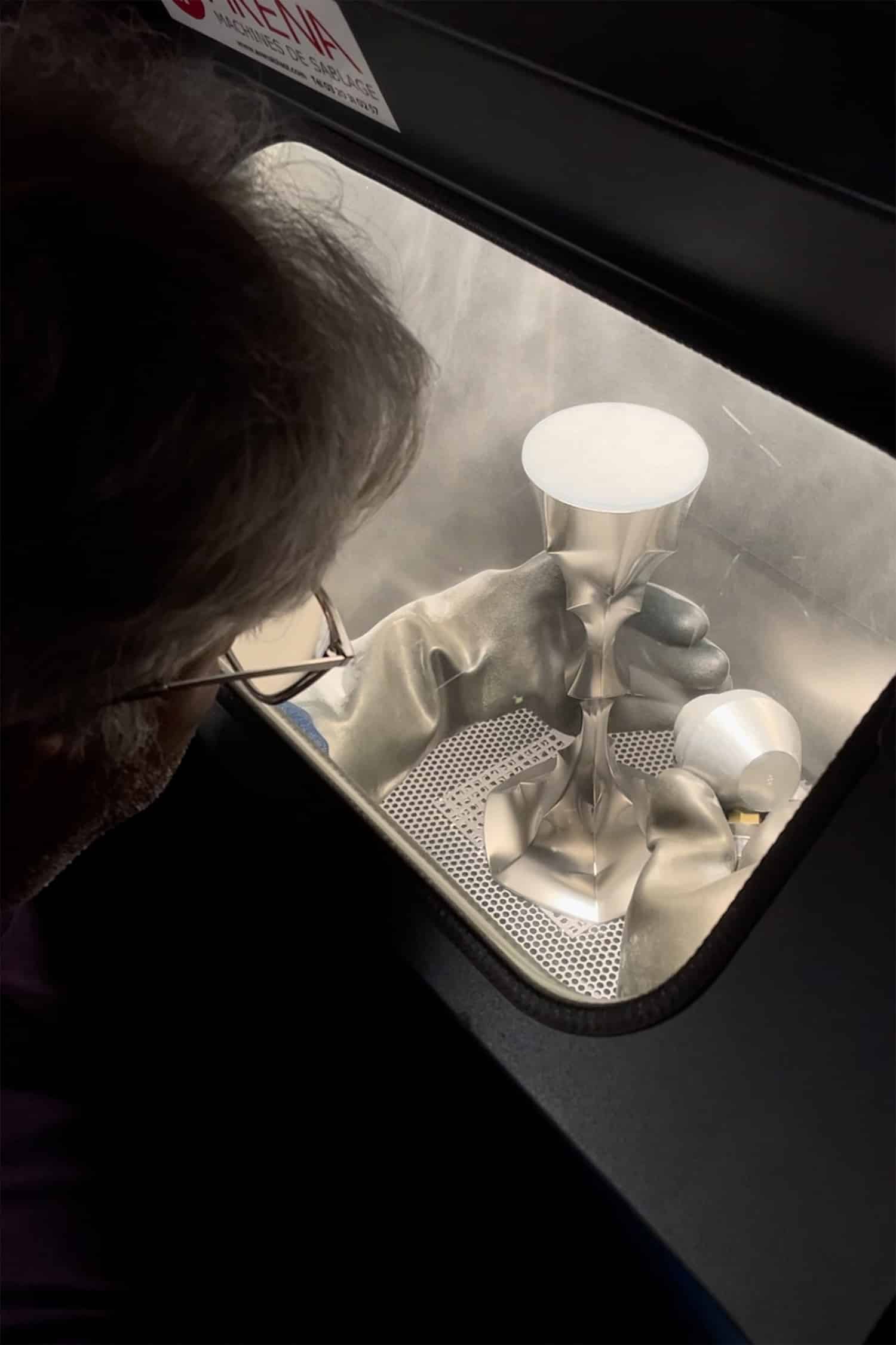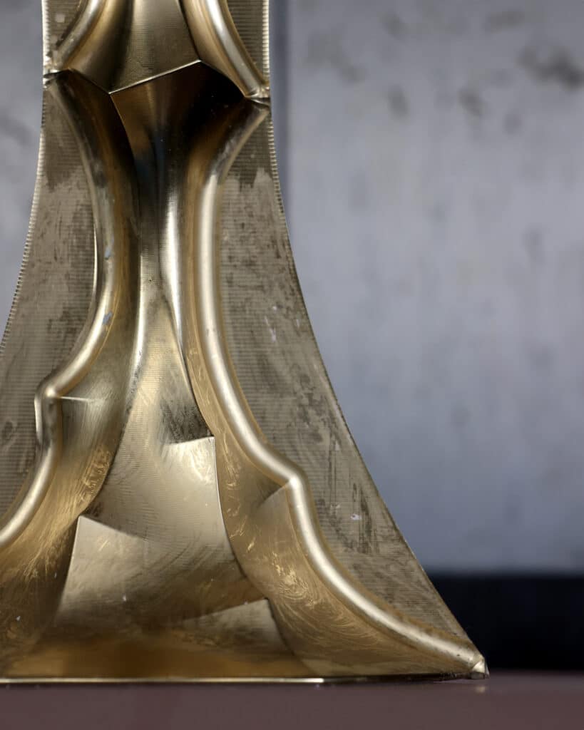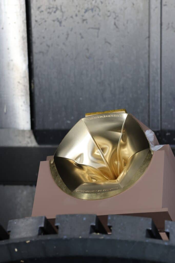Le processus de fabrication orchestré pour ces pièces illustre une méthodologie hybride. Le calice, mesurant 31 cm de hauteur, trouve sa forme par usinage CNC de laiton brut chez MMB Volum-e, entreprise labellisée EPV à Blangy-sur-Bresle.