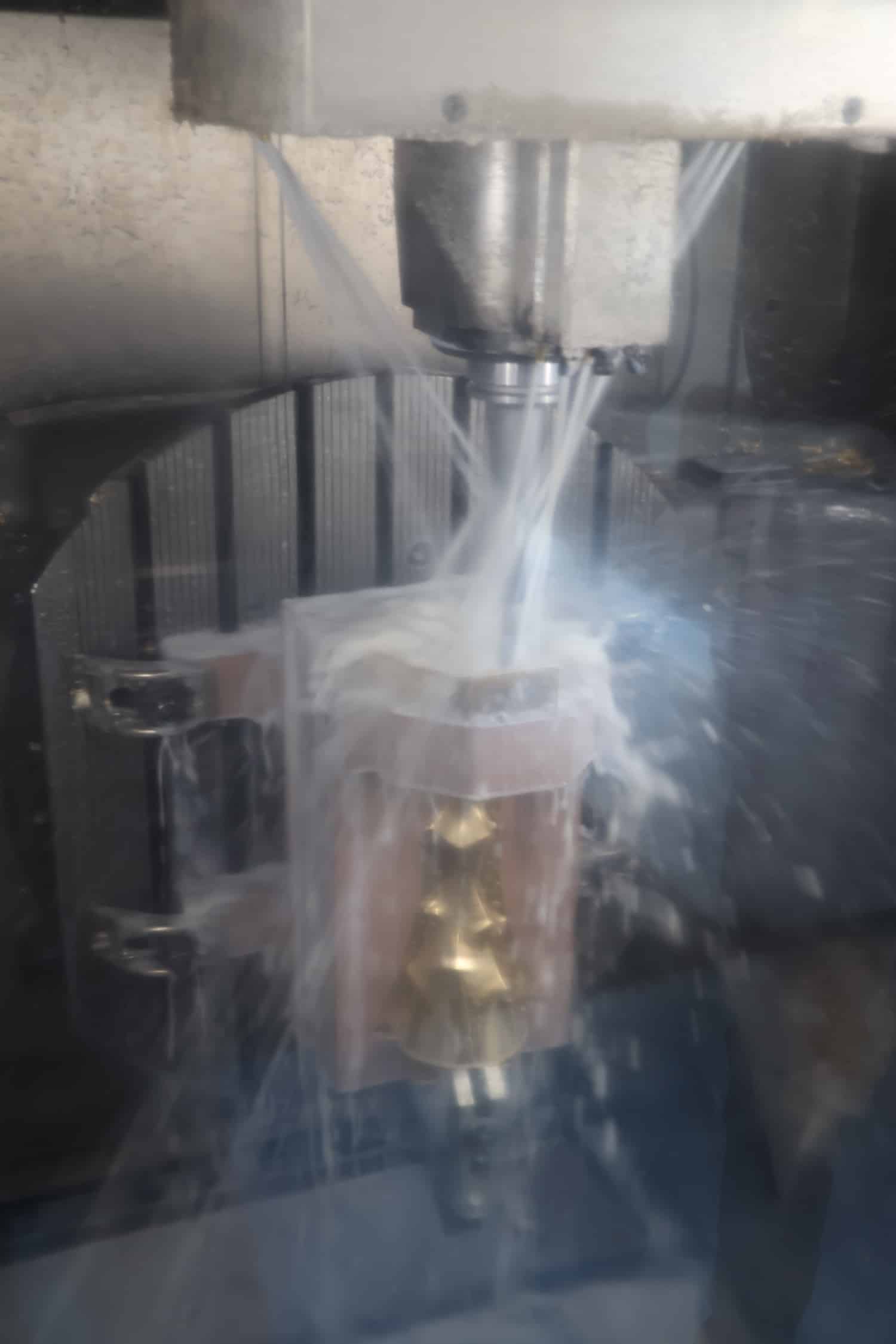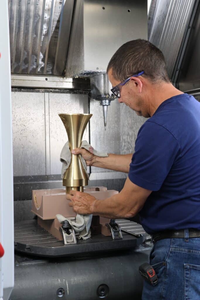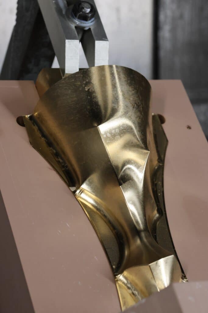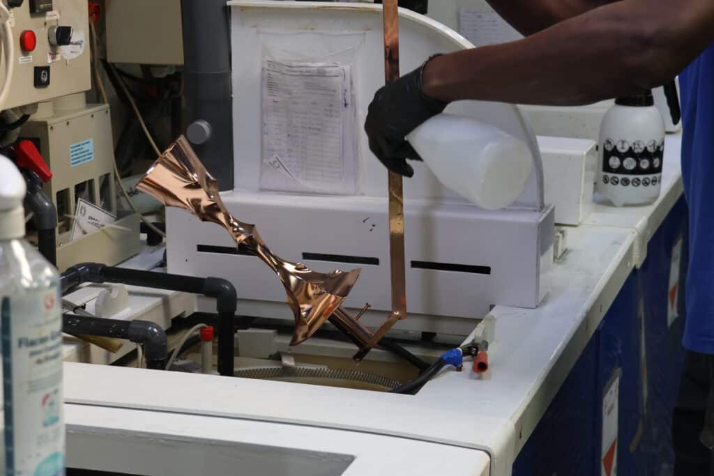Le processus de fabrication orchestré pour ces pièces illustre une méthodologie hybride. Le calice, mesurant 31 cm de hauteur, trouve sa forme par usinage CNC de laiton brut chez MMB Volum-e, entreprise labellisée EPV à Blangy-sur-Bresle.