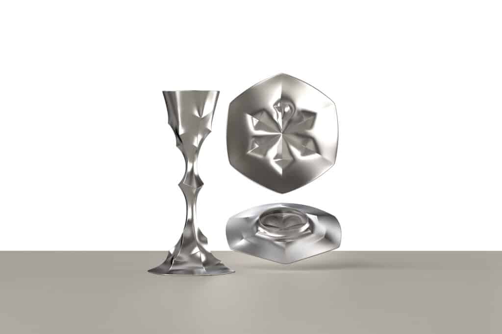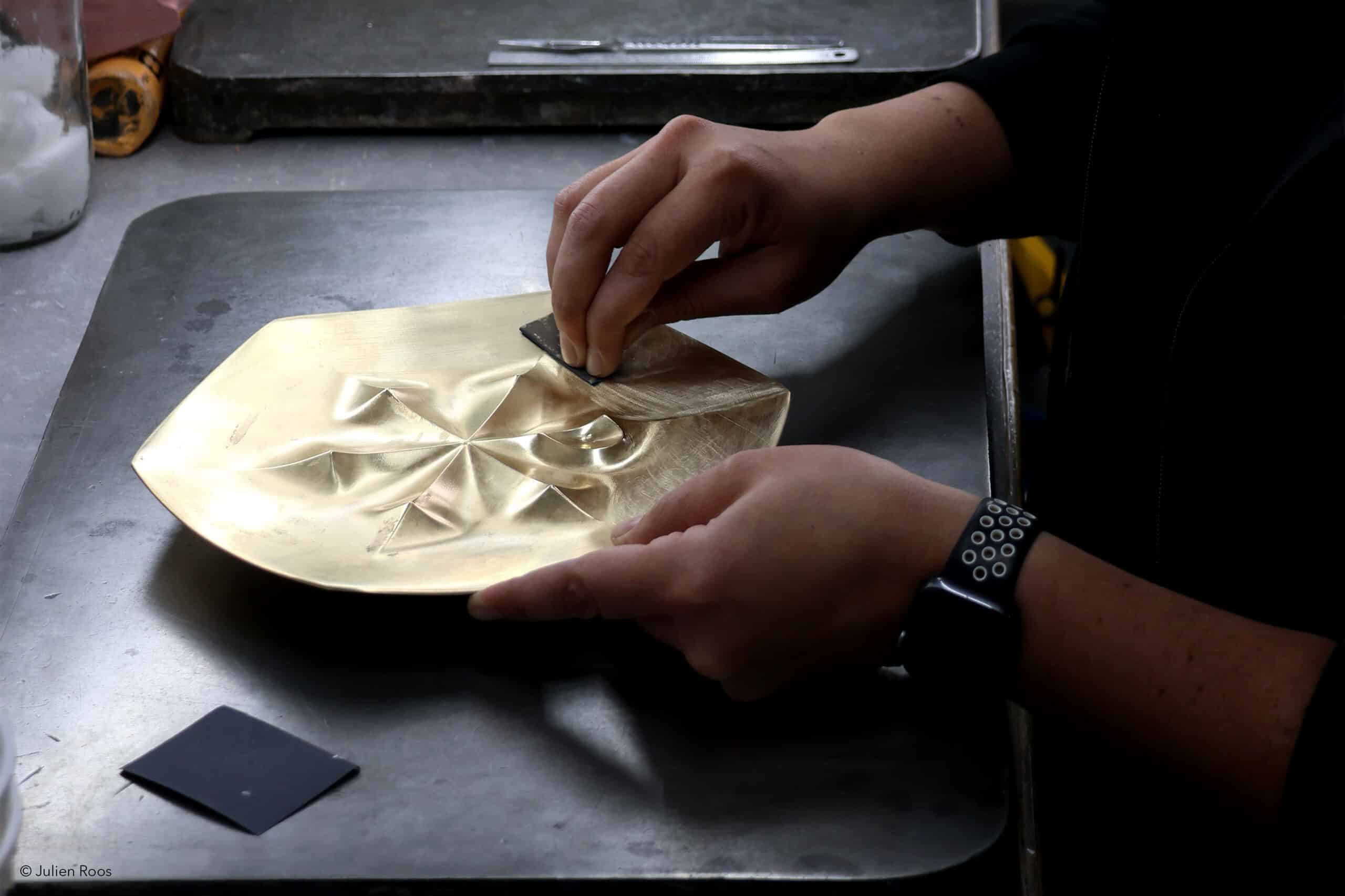 Le projet se distingue par sa conception même : c’est un designer, et non un orfèvre, qui dessine ces objets. Cette distinction engage un rapport différent à la forme, là où l’orfèvrerie traditionnel privilégie l’ornement et le décor, Julien Roos pense volumes, silhouettes, continuité des surfaces.