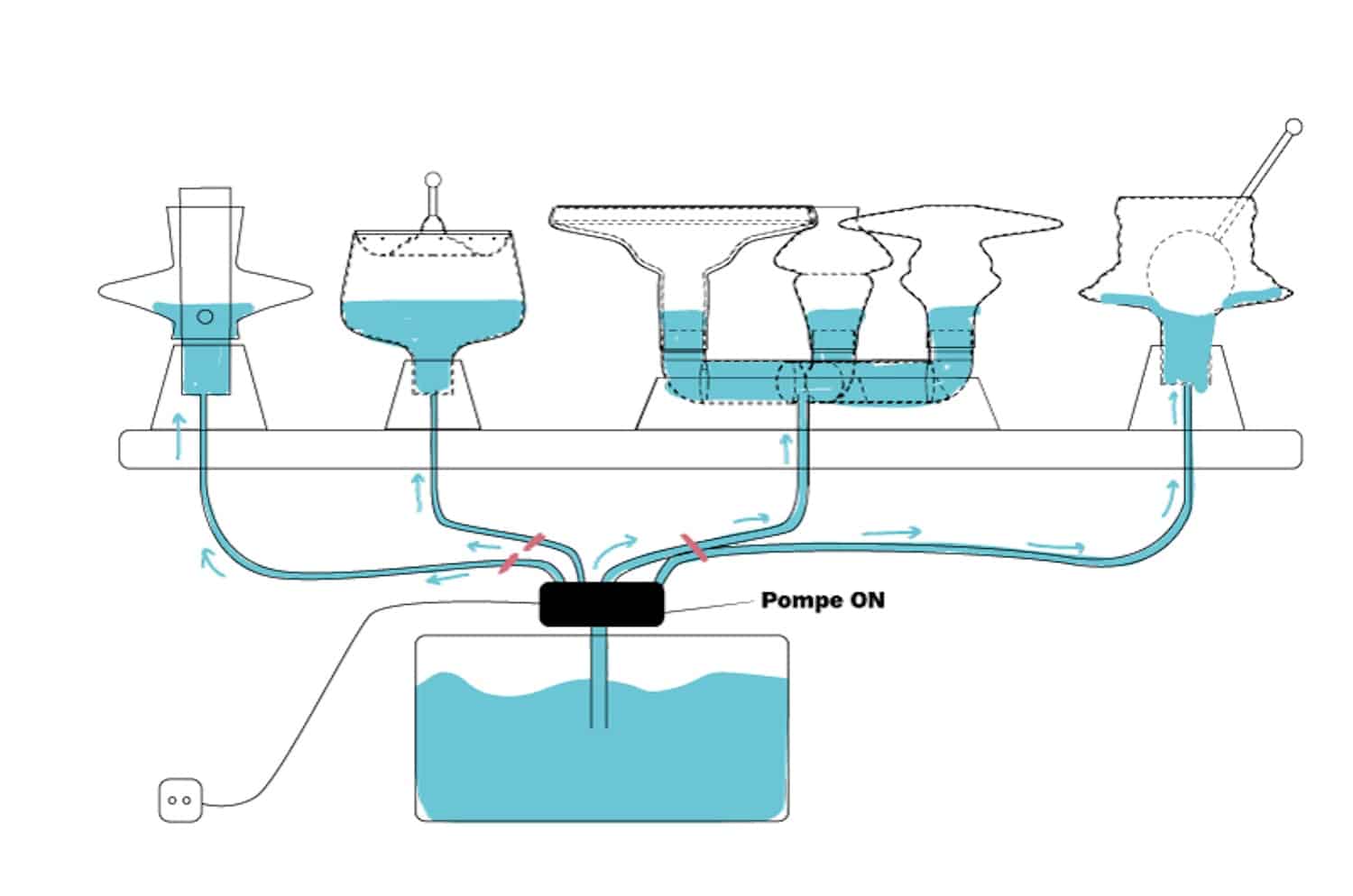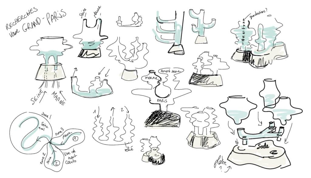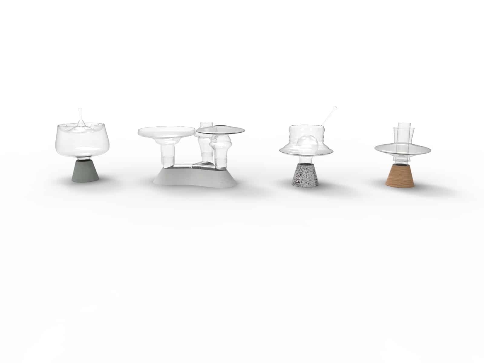 Ce dialogue entre le bois et le verre rappelle les explorations matérielles déjà observées dans les projets combinant céramique et verre, où les contraintes techniques notamment le choc thermique deviennent des opportunités formelles. Ici, c’est la modélisation hydraulique qui dicte les volumes : chaque courbe, chaque variation d’épaisseur correspond à une densité de population exposée à l’inondation. Le verre translucide permet de visualiser simultanément l’intérieur du vase représentant le cours d’eau et sa paroi extérieure qui symbolise les habitants touchés.