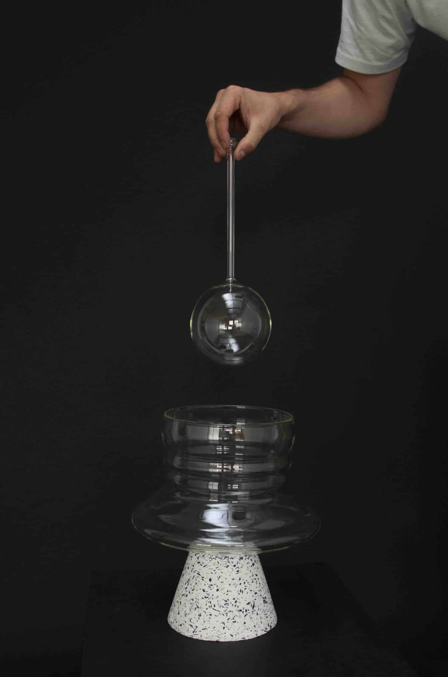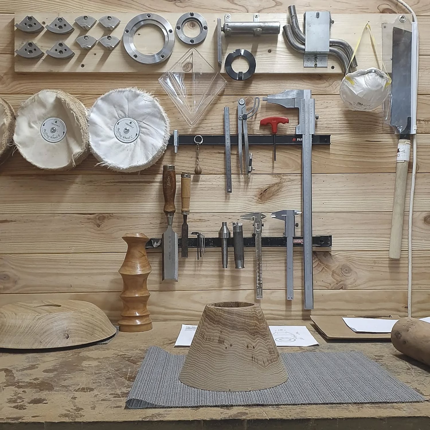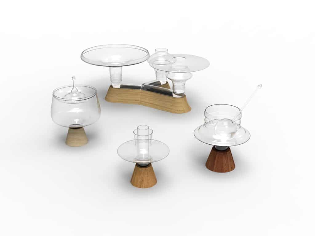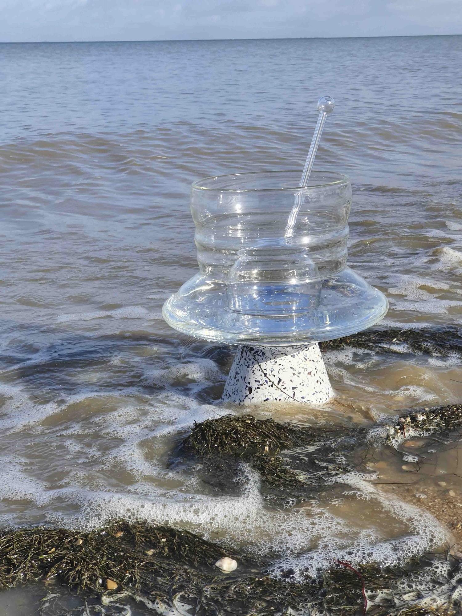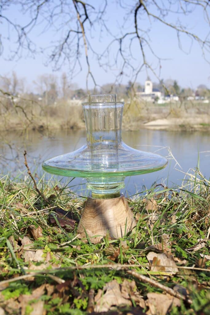 La fabrication des pièces met en œuvre deux savoir-faire artisanaux distincts. Le socle en bois, tourné par Aurélien Molinier, évoque la solidité du territoire. Quant à la partie supérieure en verre soufflé, réalisée par la verrerie Verart, elle capte la lumière et matérialise l’eau dans sa dimension la plus poétique et la plus menaçante à la fois.