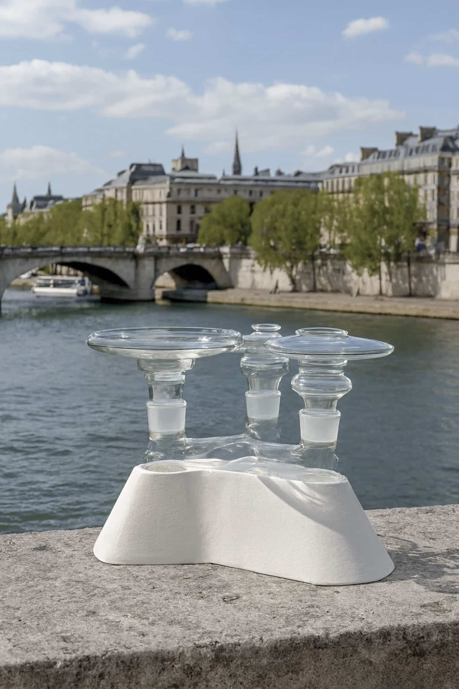 Le vase Paris, avec sa double topologie représentant la Marne et la Seine, témoigne d’une approche technique particulièrement élaborée. Le socle en céramique supporte trois structures en verre soufflé qui s’entremêlent pour figurer la confluence des rivières et la propagation de l’eau dans le tissu urbain. Quant au vase Saint-Nazaire, il matérialise la submersion marine avec une base en terrazzo tacheté évoquant l’écume et le sable associée à un verre transparent sculpté en couronne, rappelant l’avancée inexorable de la mer lors des tempêtes.