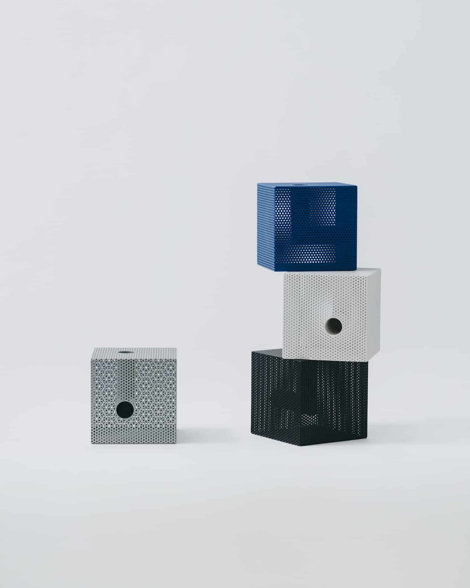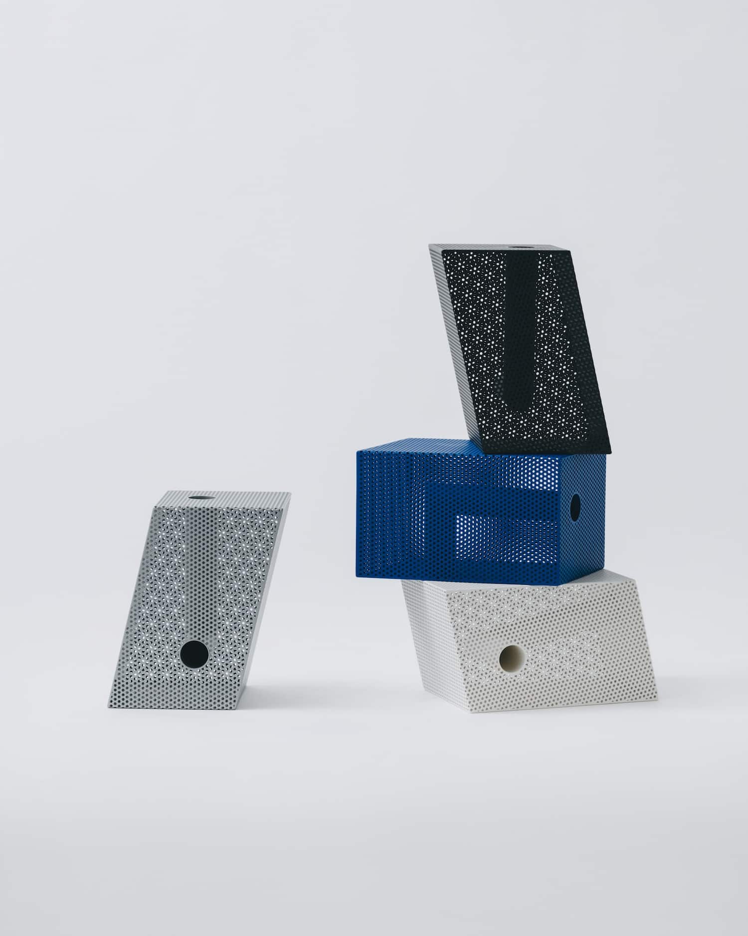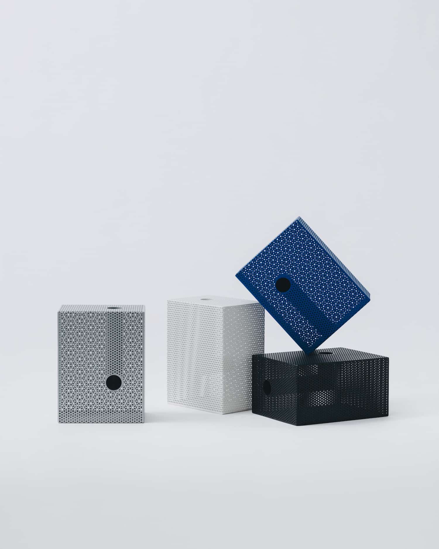 La collection propose quatre formes : box (cube), brick (parallélépipède), tilted (incliné) et wedge (en coin). Chaque forme est déclinée en deux tailles et quatre finitions : noir mat, blanc mat, bleu mat et argent métallisé.