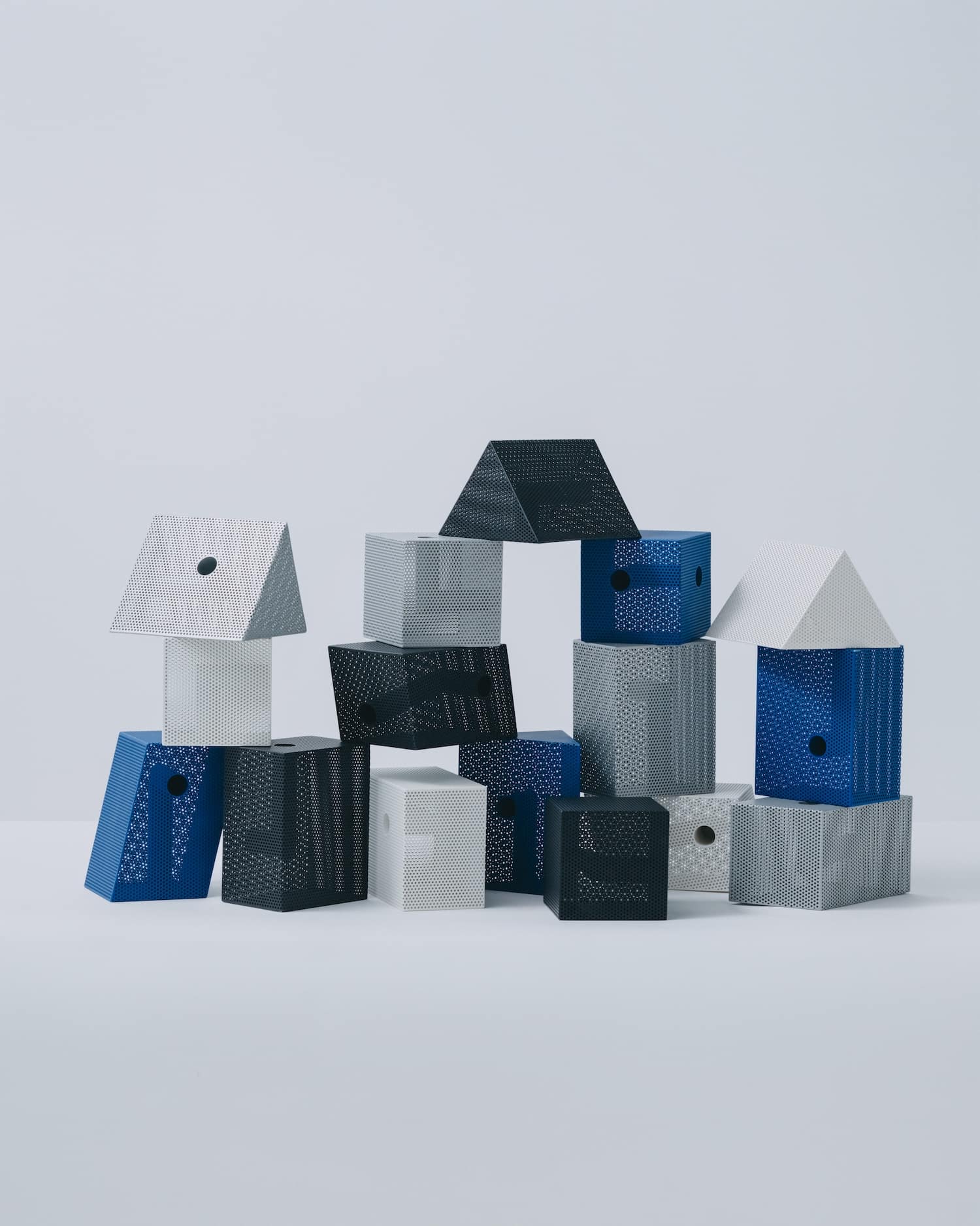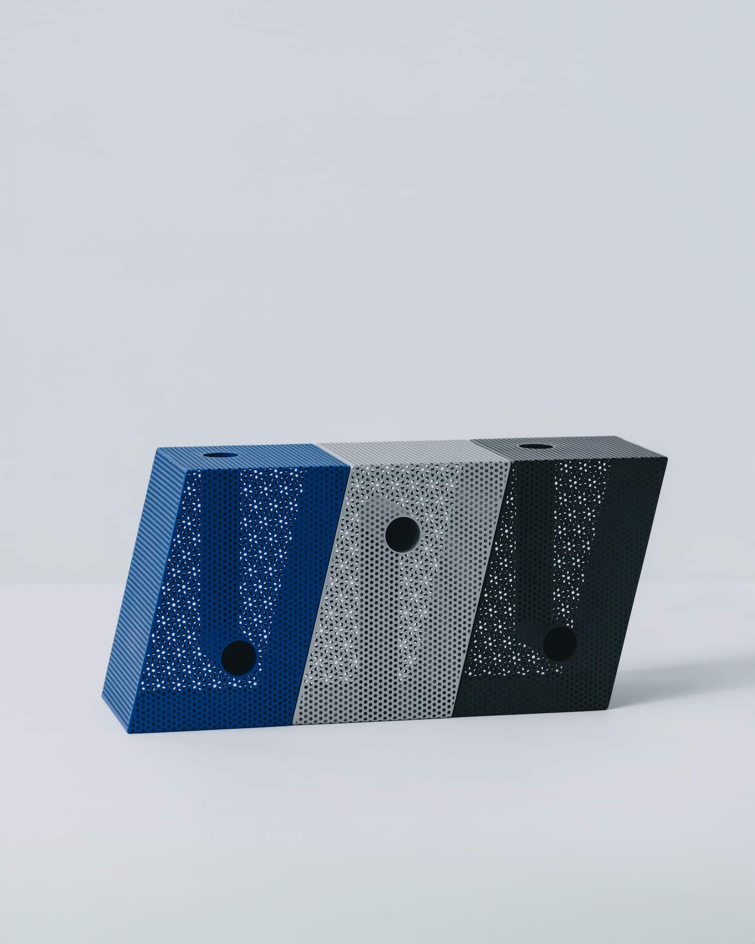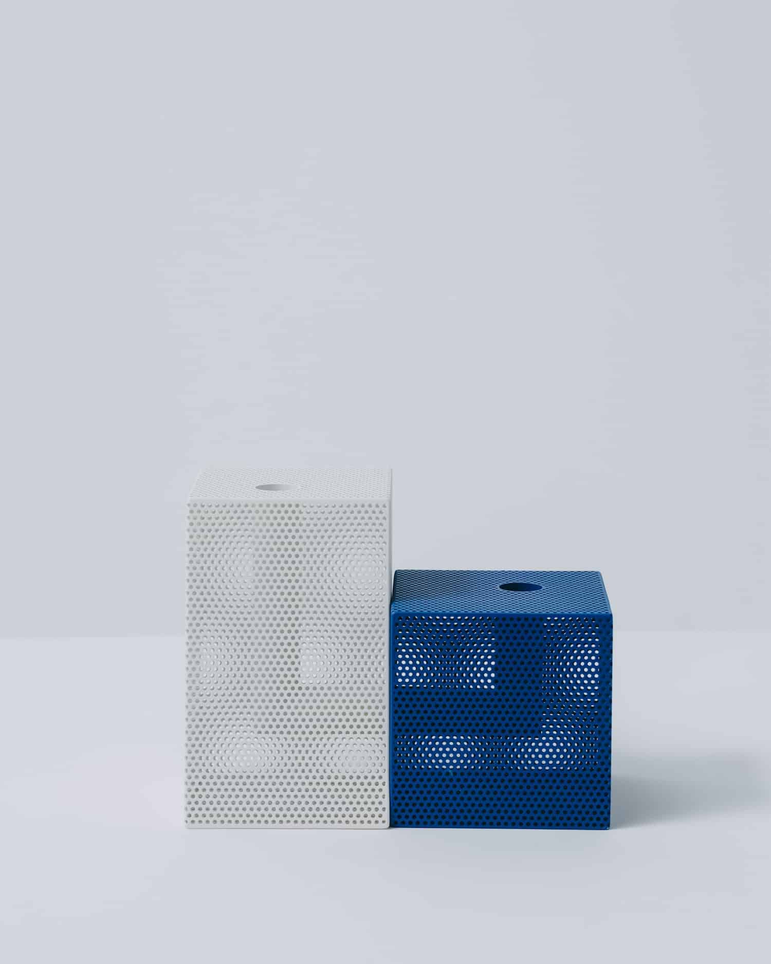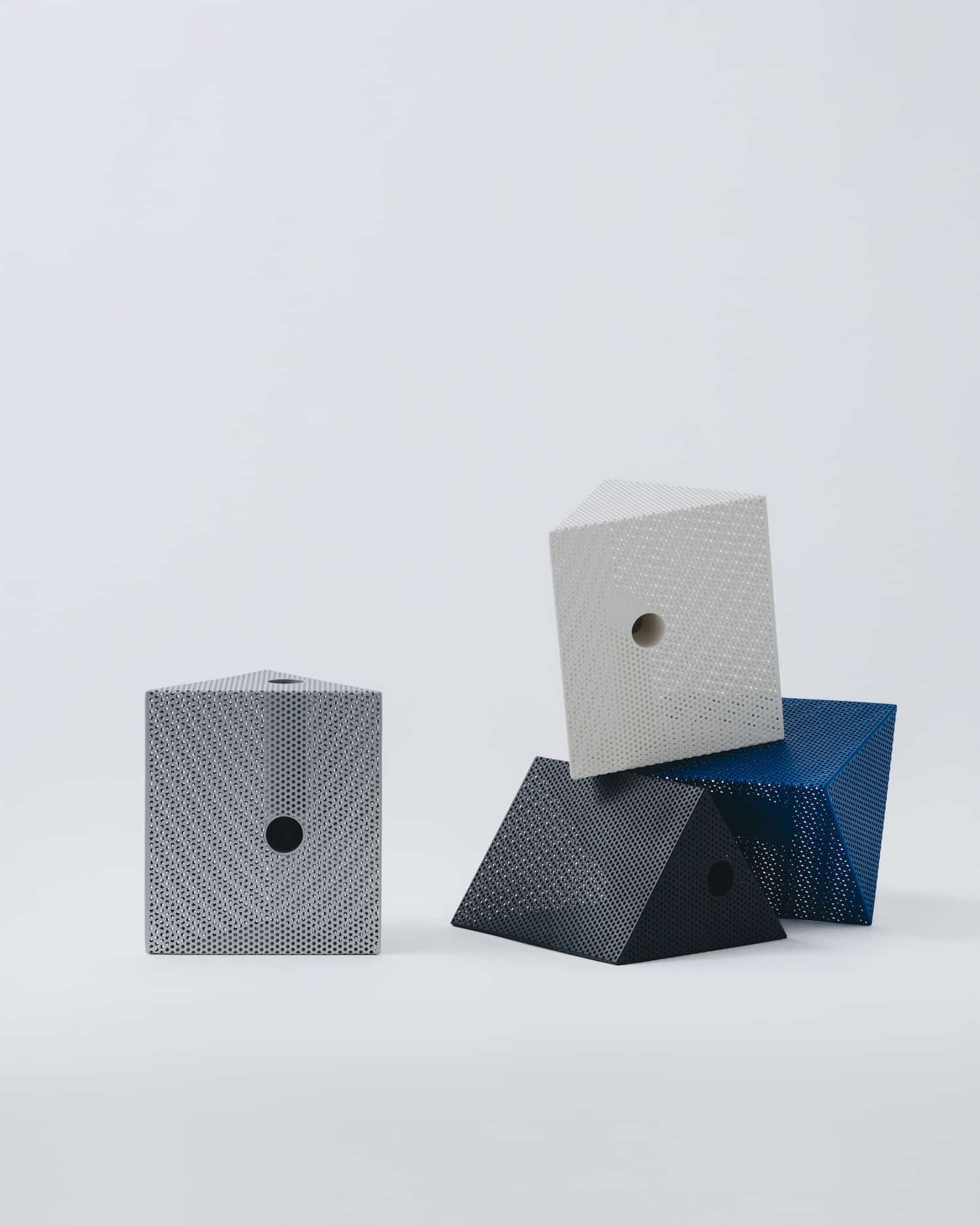 La collection propose quatre formes : box (cube), brick (parallélépipède), tilted (incliné) et wedge (en coin). Chaque forme est déclinée en deux tailles et quatre finitions : noir mat, blanc mat, bleu mat et argent métallisé.