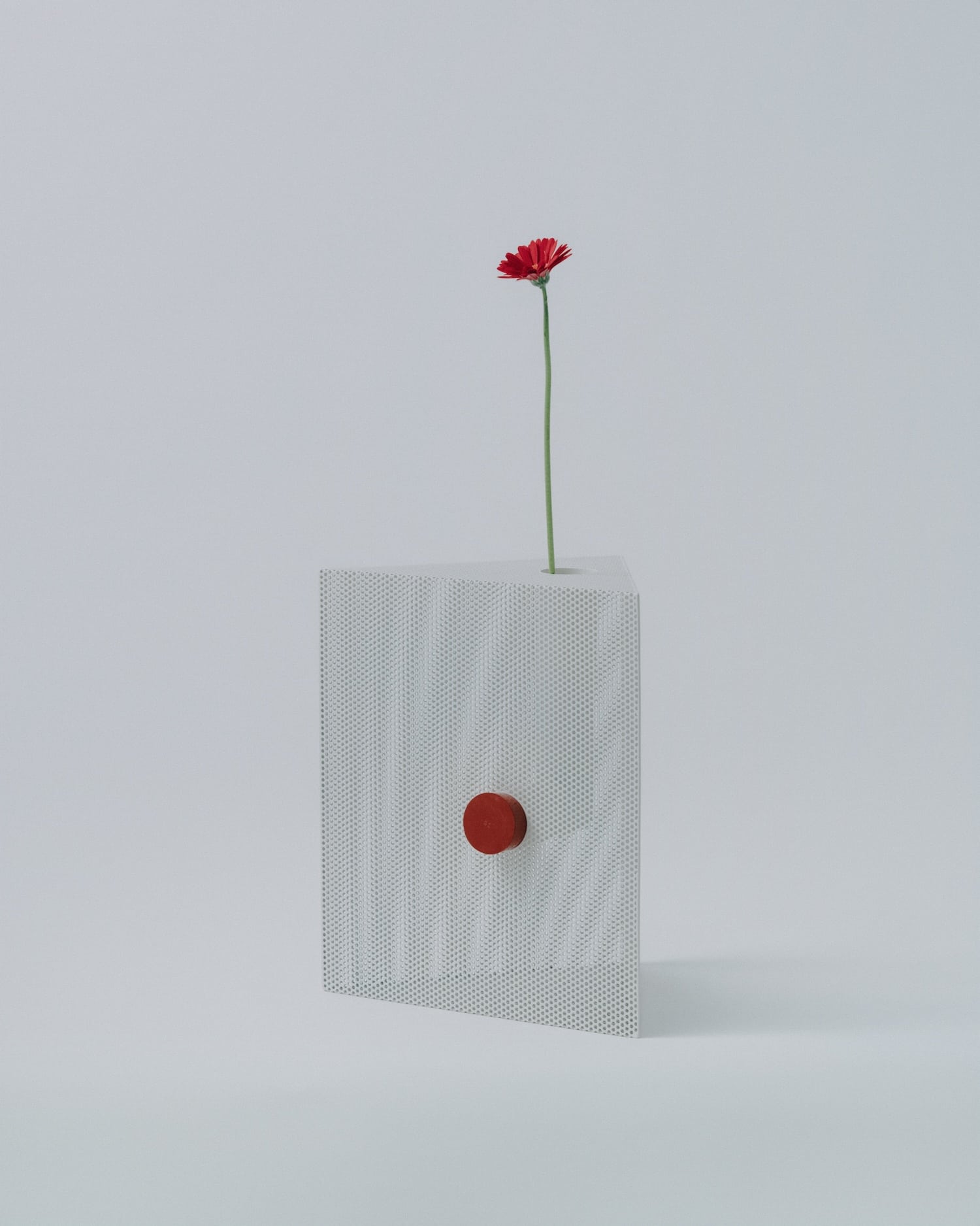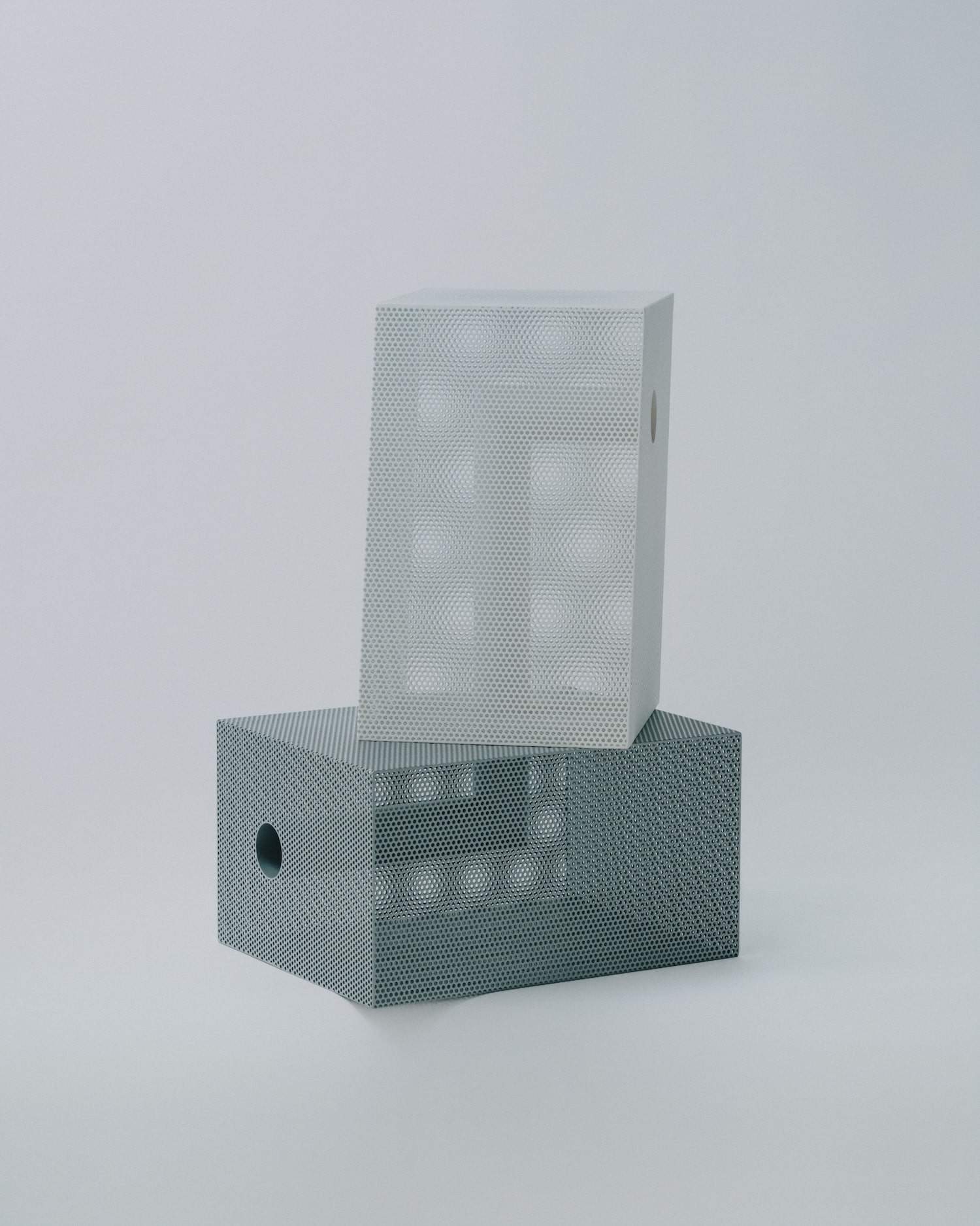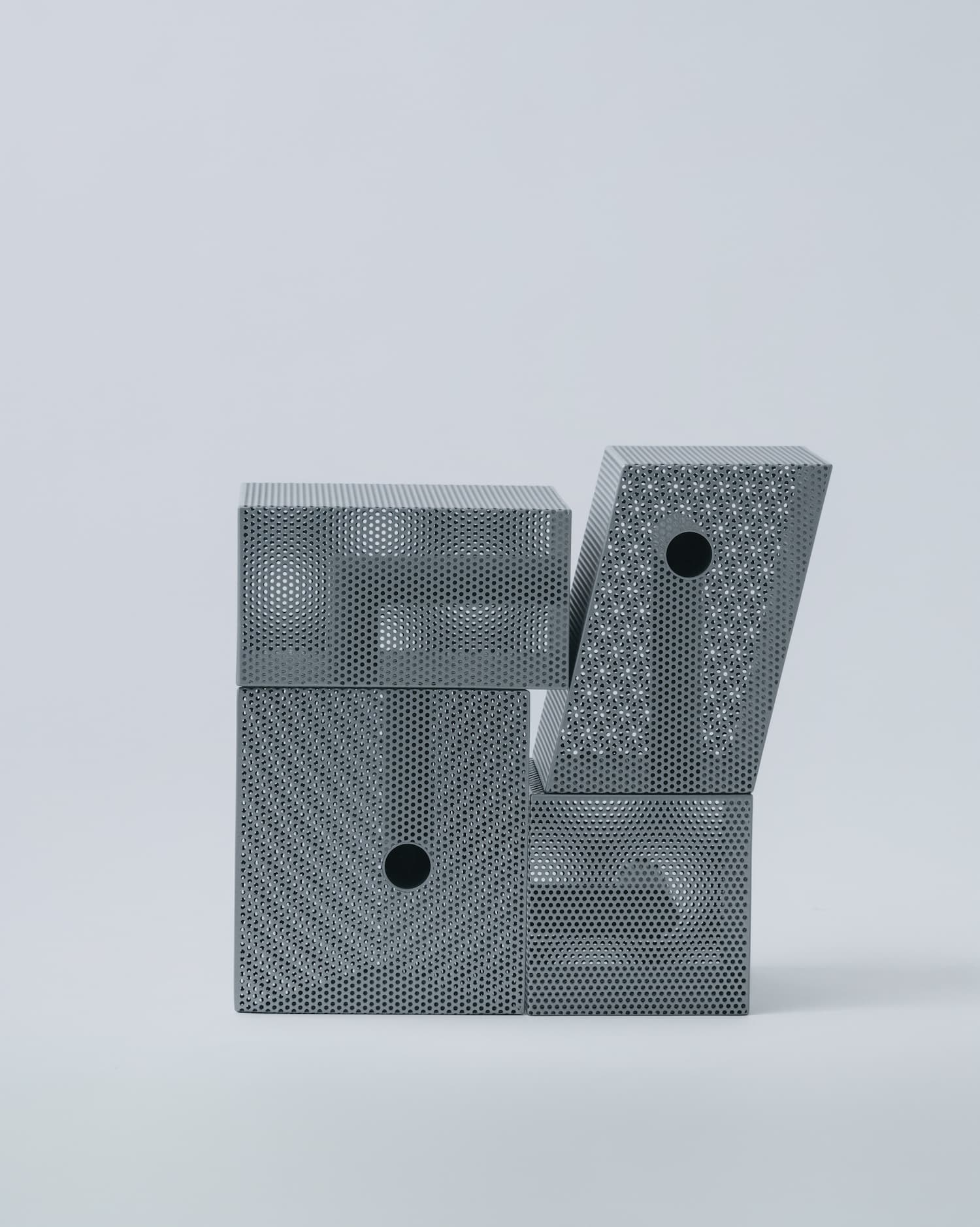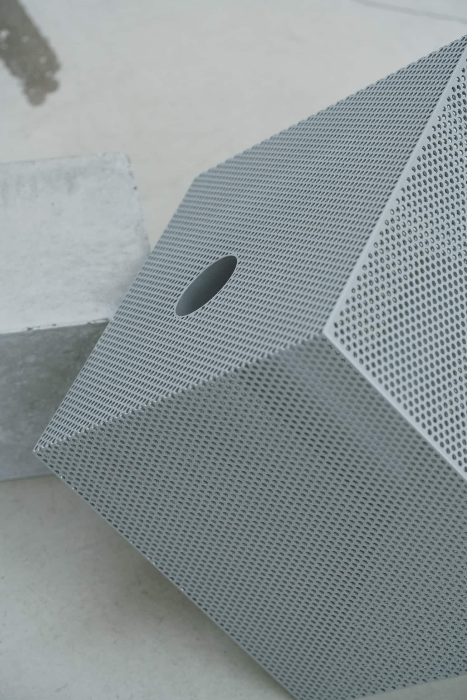 Sur le plan matériau, la pièce est construite à partir d’une feuille d’acier perforée, façonnée et soudée pour former une structure en volume. Un tube en acier inoxydable traverse l’intérieur de chaque objet selon un angle en L. La surface reçoit ensuite un traitement par revêtement en poudre, appliqué de façon uniforme sur les faces intérieures et extérieures. Ce point n’est pas anodin : le traitement homogène des deux faces efface la distinction entre dedans et dehors, entre structure porteuse et peau visible.