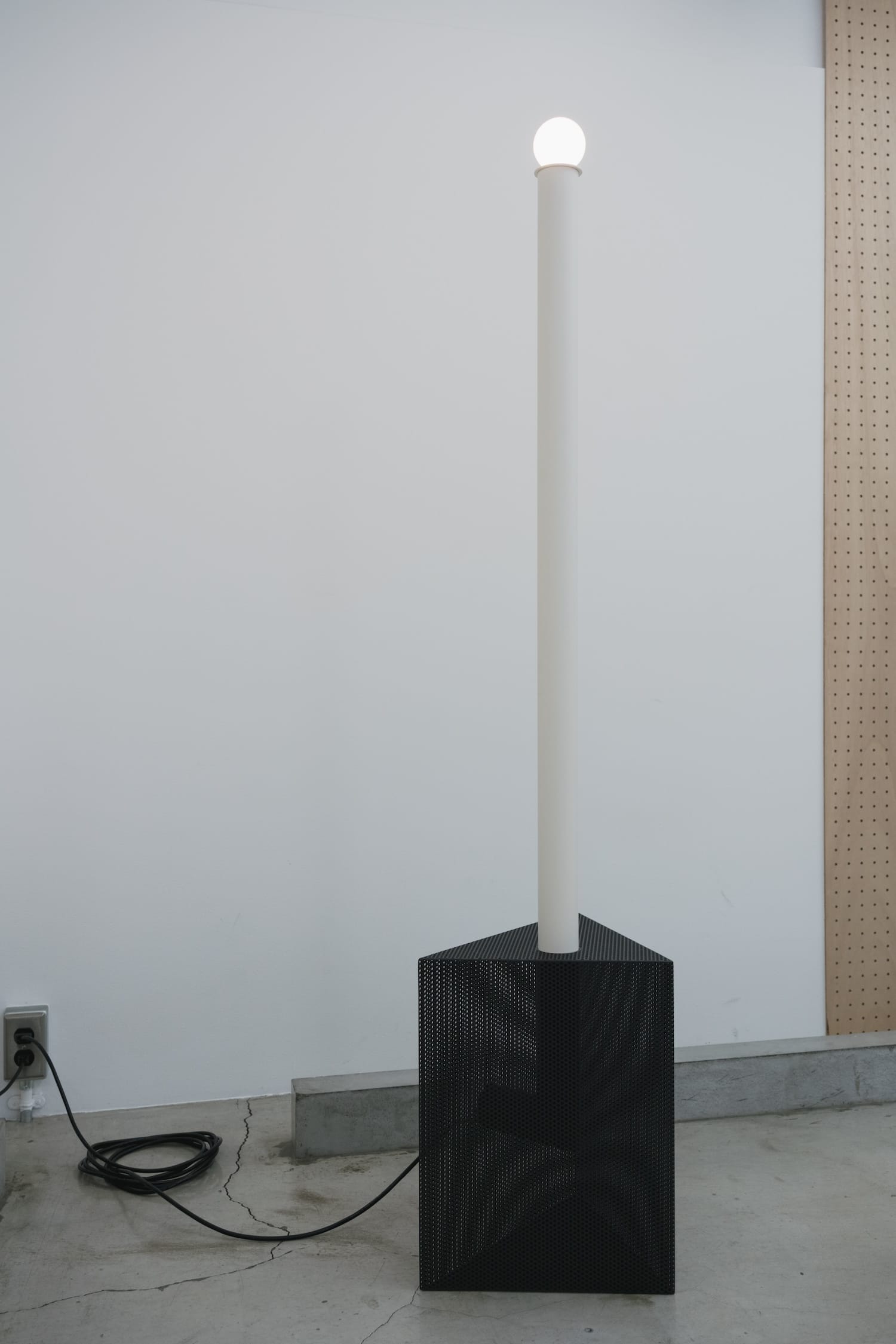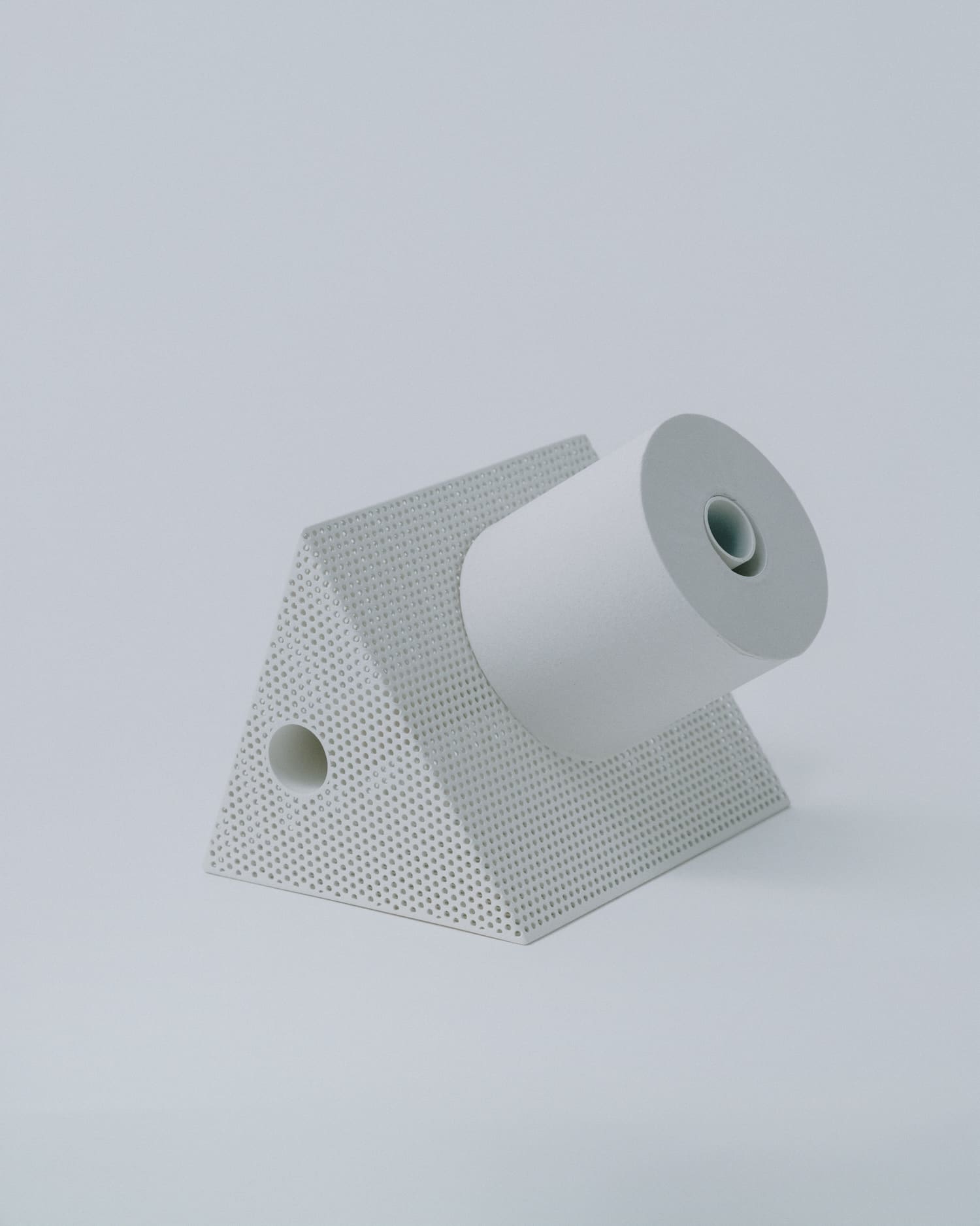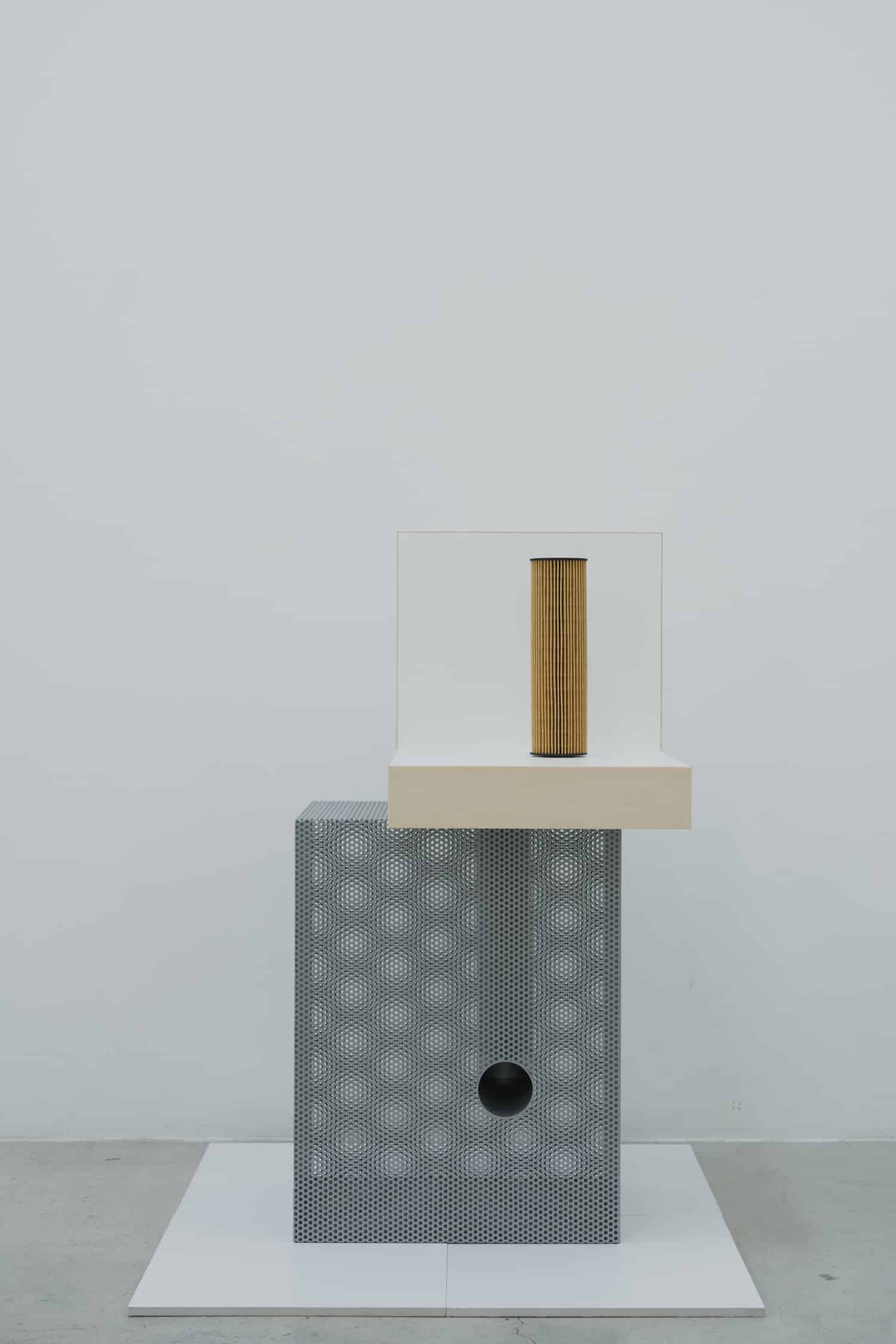 Sur le plan matériau, la pièce est construite à partir d’une feuille d’acier perforée, façonnée et soudée pour former une structure en volume. Un tube en acier inoxydable traverse l’intérieur de chaque objet selon un angle en L. La surface reçoit ensuite un traitement par revêtement en poudre, appliqué de façon uniforme sur les faces intérieures et extérieures. Ce point n’est pas anodin : le traitement homogène des deux faces efface la distinction entre dedans et dehors, entre structure porteuse et peau visible.