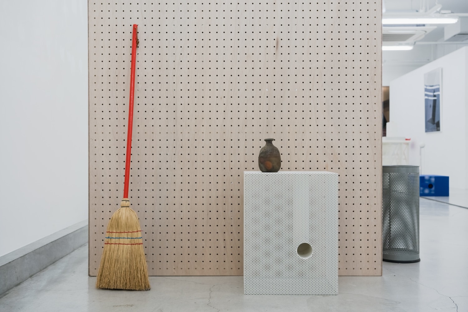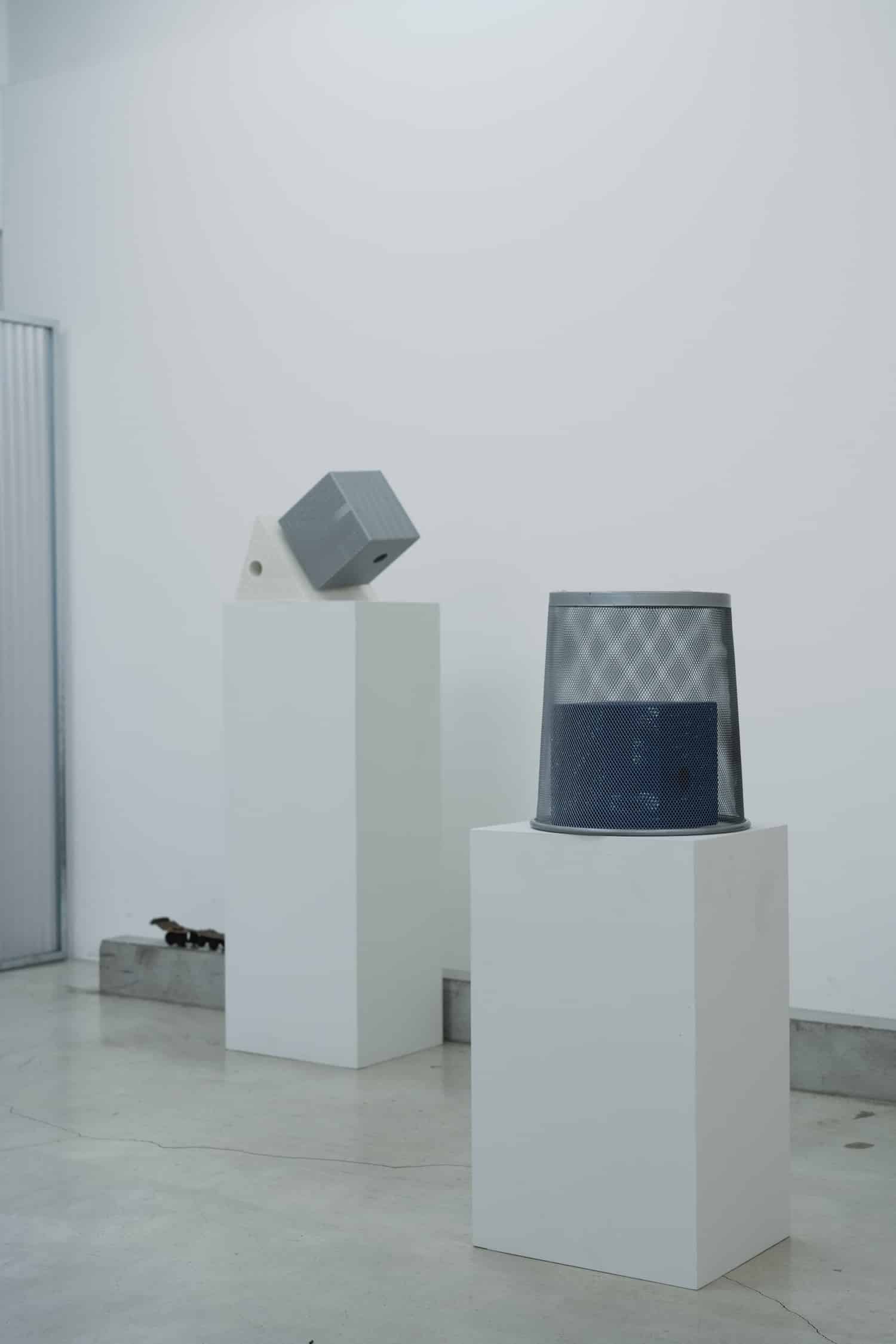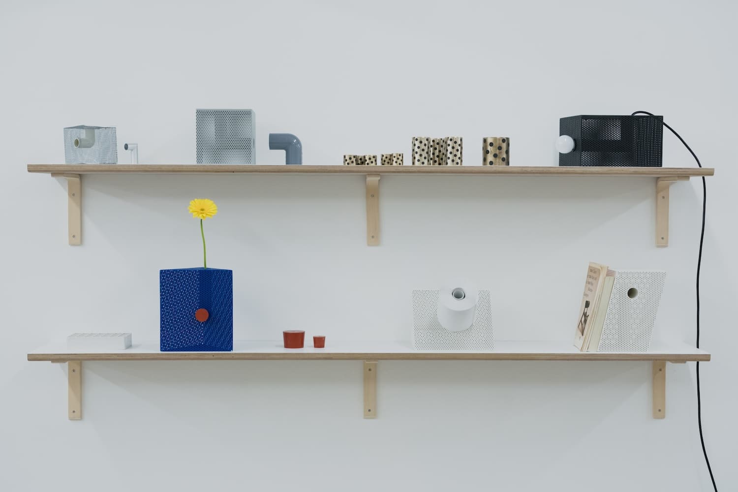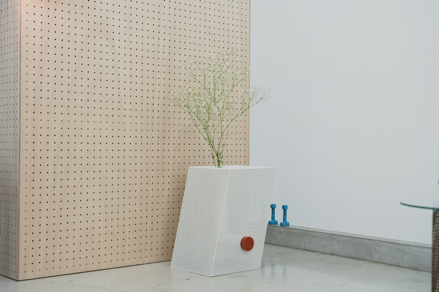 Sur le plan matériau, la pièce est construite à partir d’une feuille d’acier perforée, façonnée et soudée pour former une structure en volume. Un tube en acier inoxydable traverse l’intérieur de chaque objet selon un angle en L. La surface reçoit ensuite un traitement par revêtement en poudre, appliqué de façon uniforme sur les faces intérieures et extérieures. Ce point n’est pas anodin : le traitement homogène des deux faces efface la distinction entre dedans et dehors, entre structure porteuse et peau visible.
