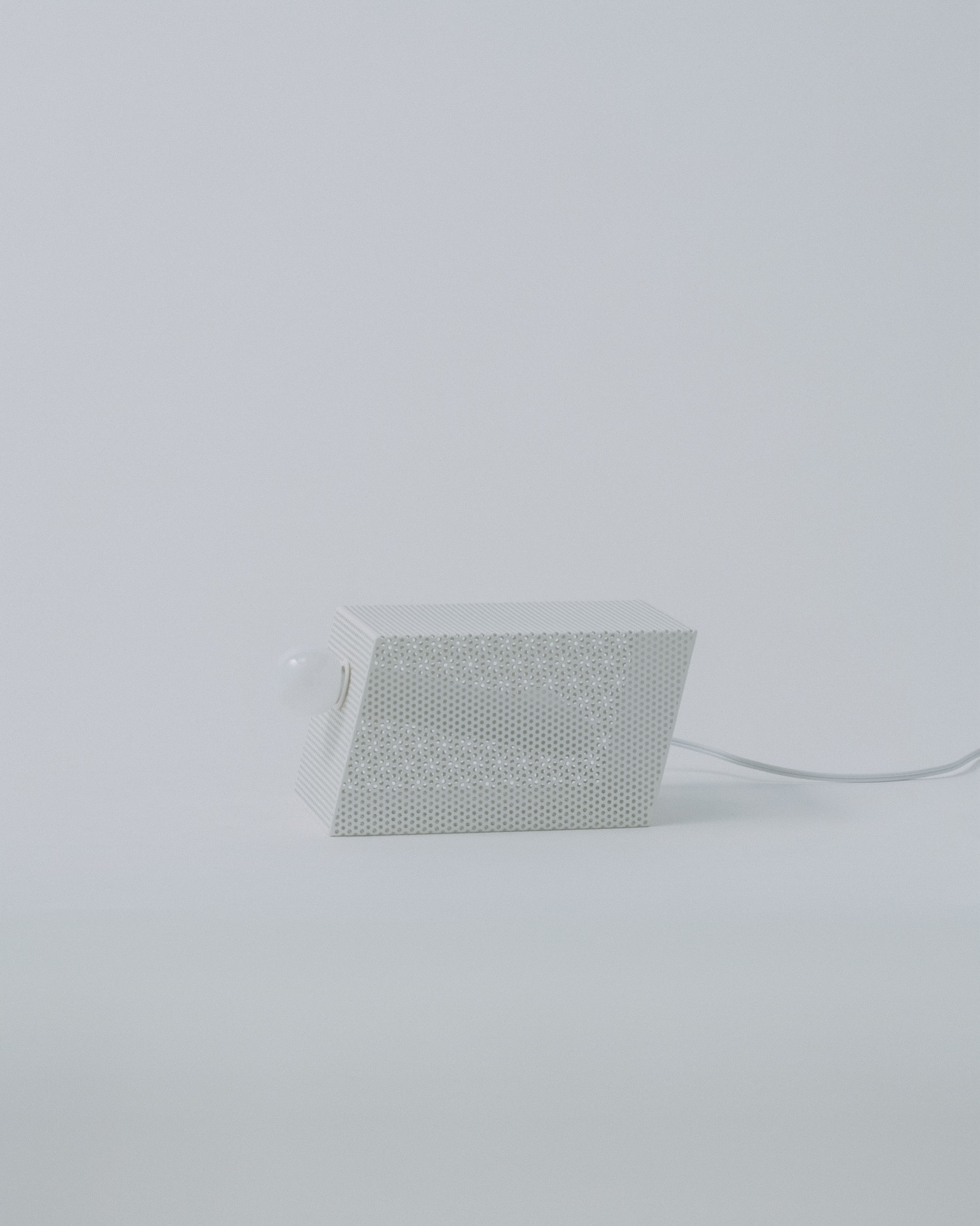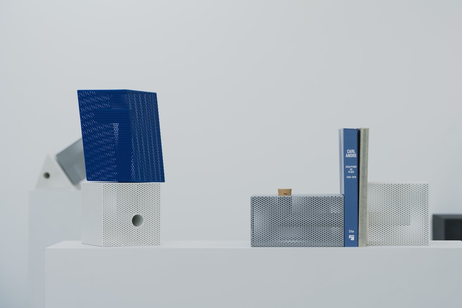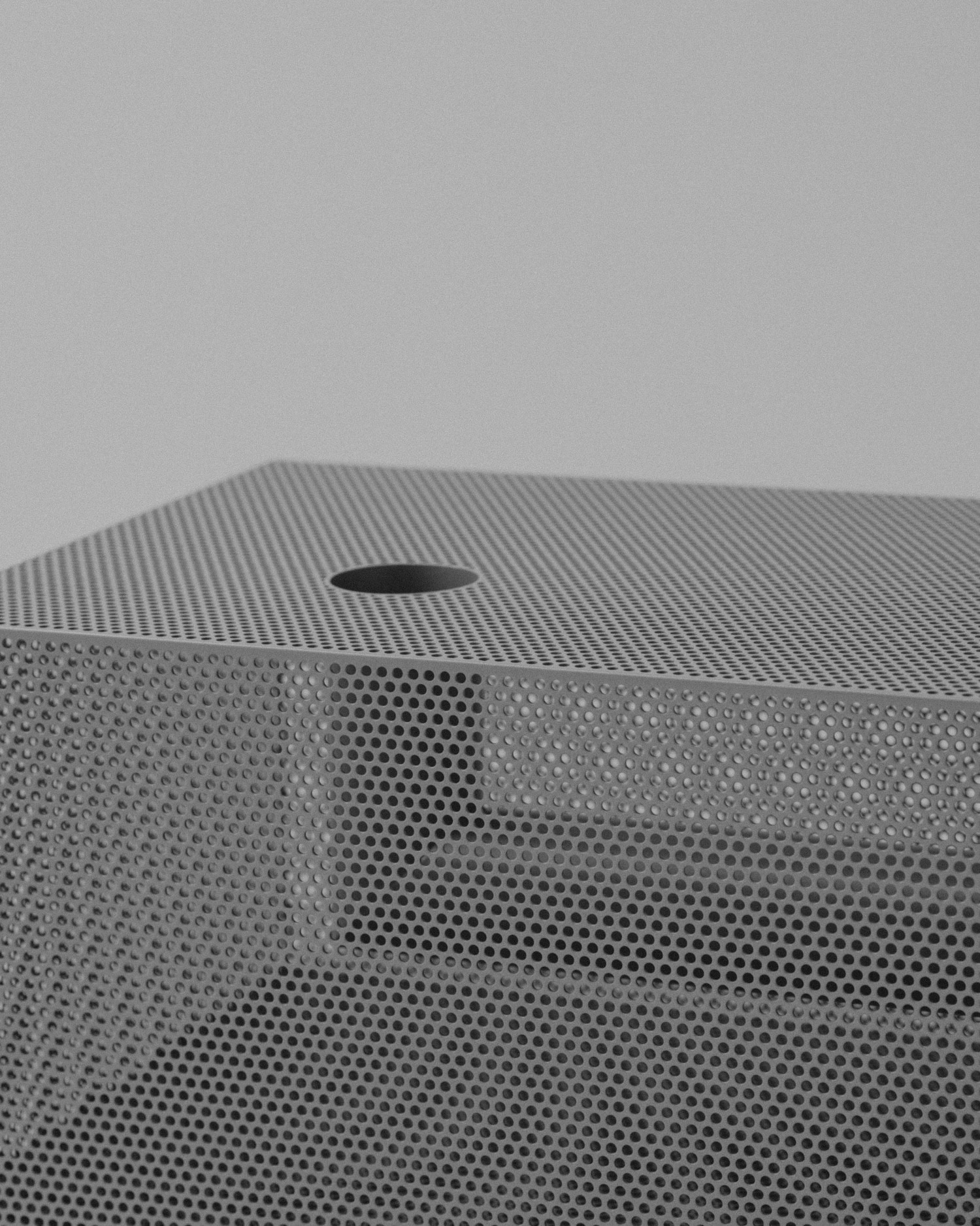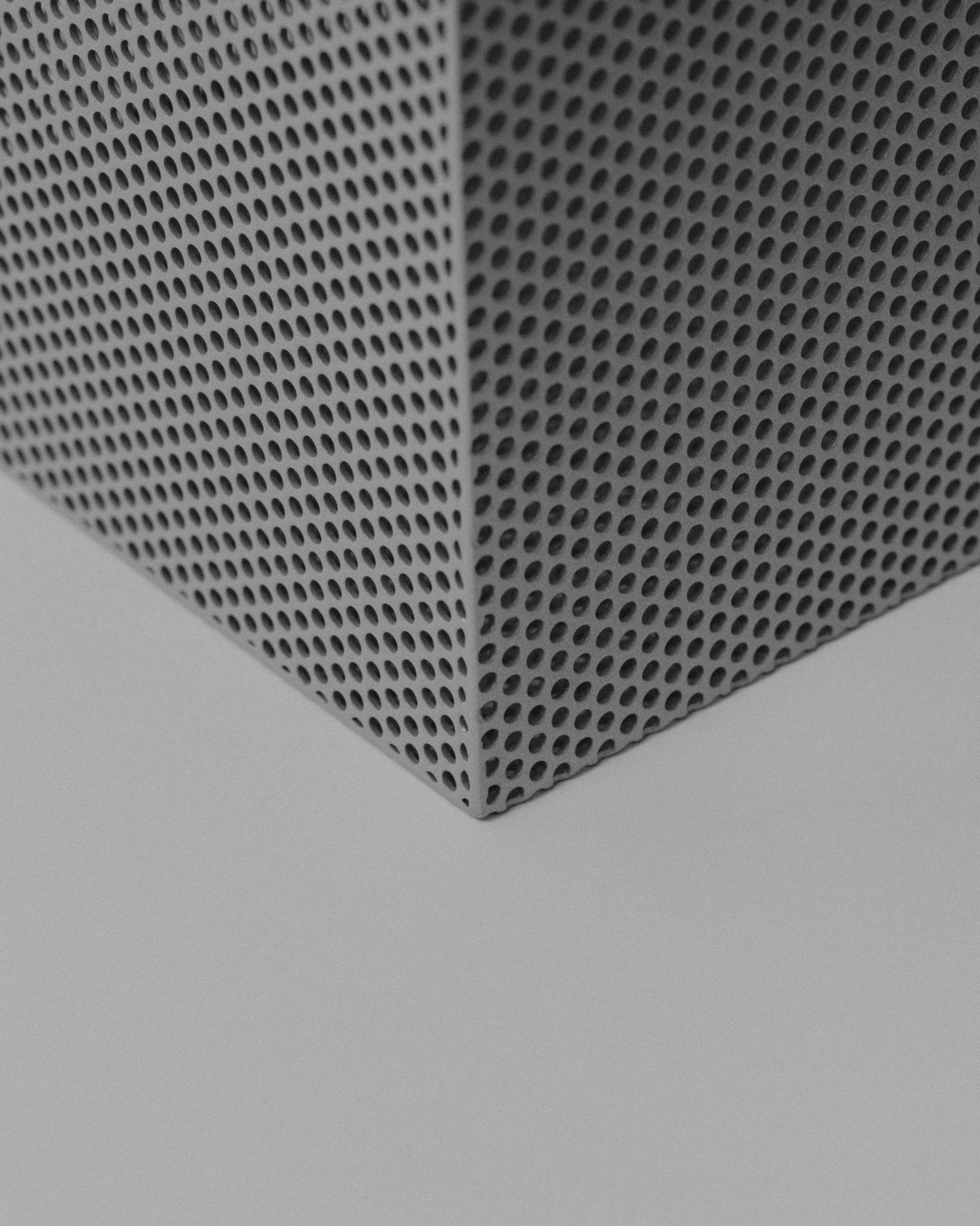 La tôle perforée a une propriété que les autres matériaux métalliques n’ont pas à ce degré : elle fait coexister l’opacité et la transparence au sein d’une même surface. L’objet semble fermé vu de face. On déplace légèrement la tête, ou la lumière change d’angle, et l’intérieur commence à apparaître par fragments. Le tube en L surgit, disparaît, revient selon la position du spectateur.