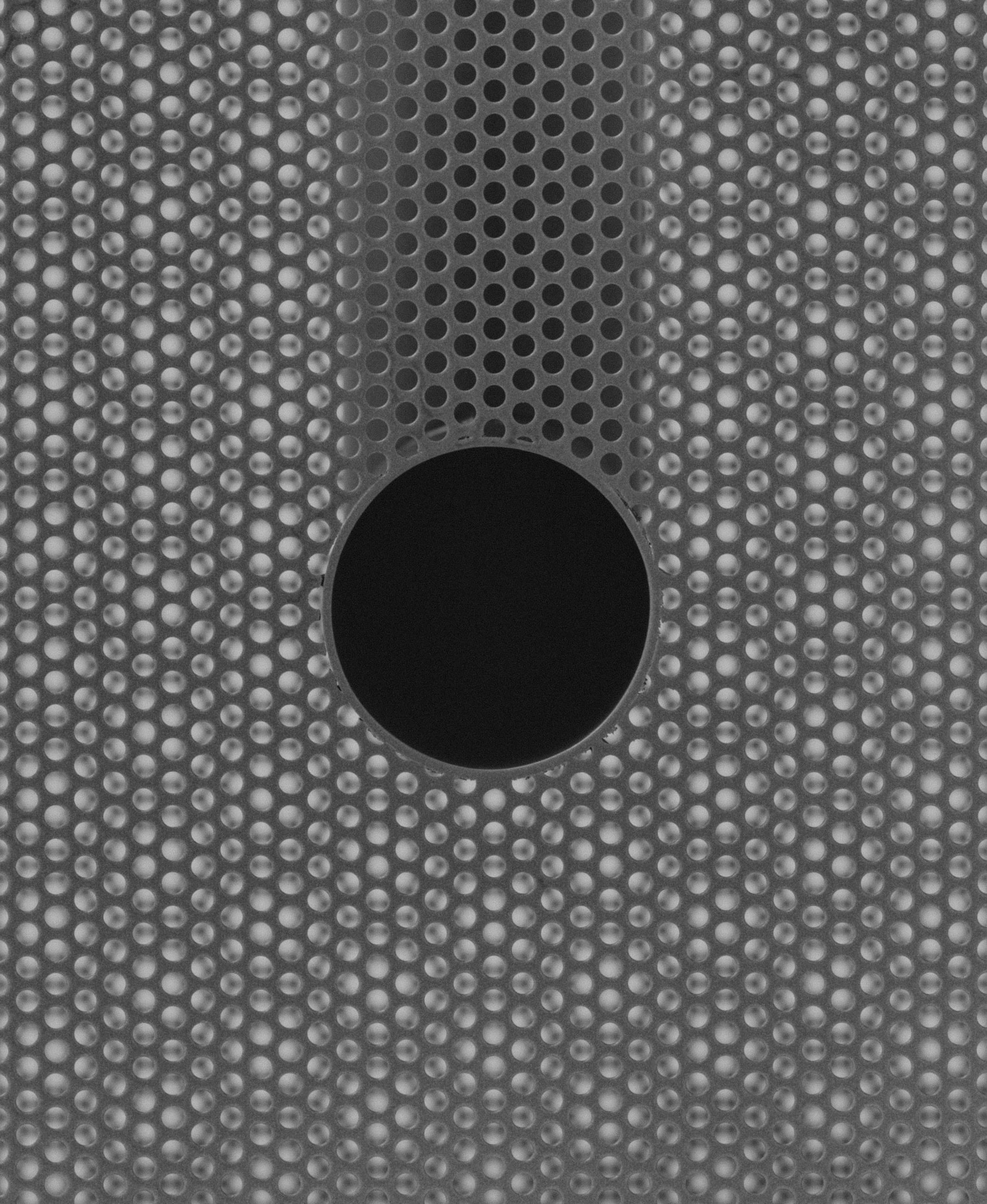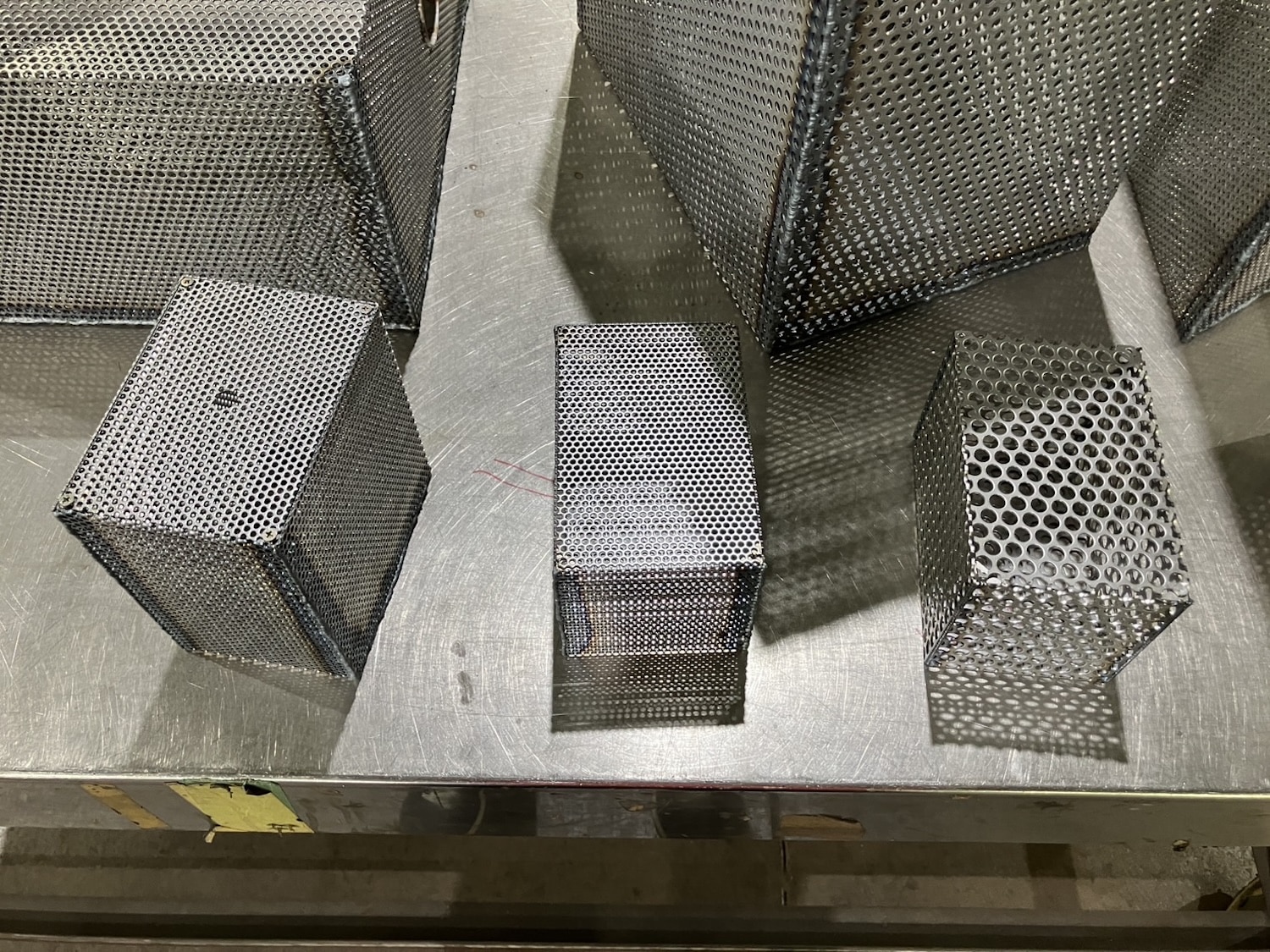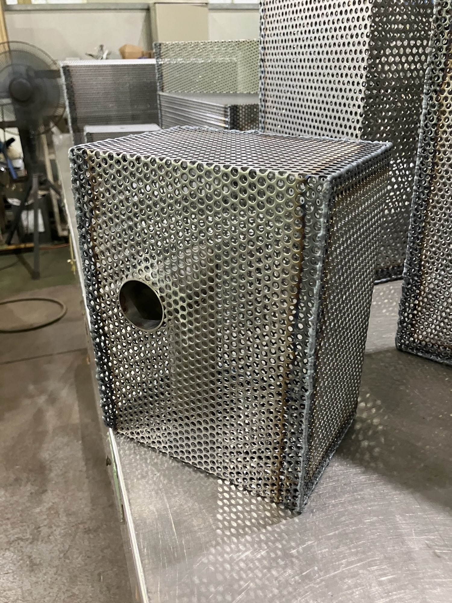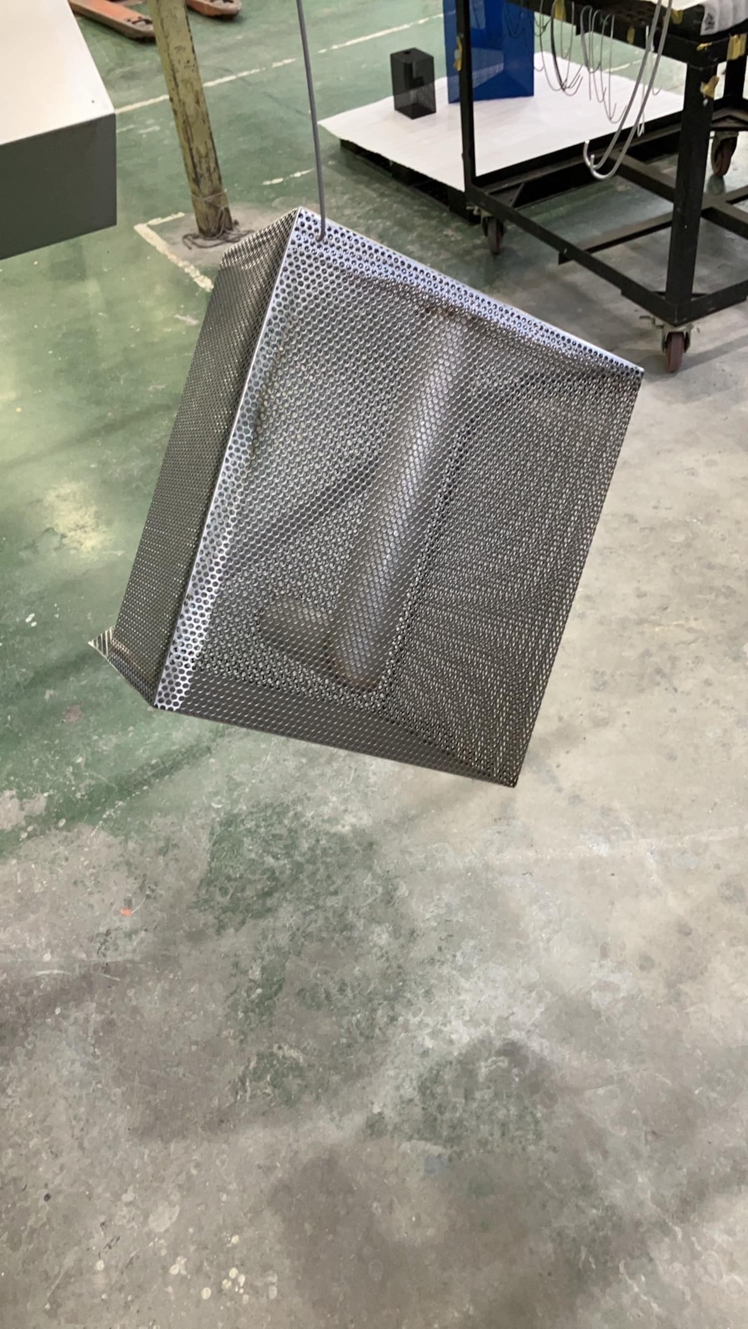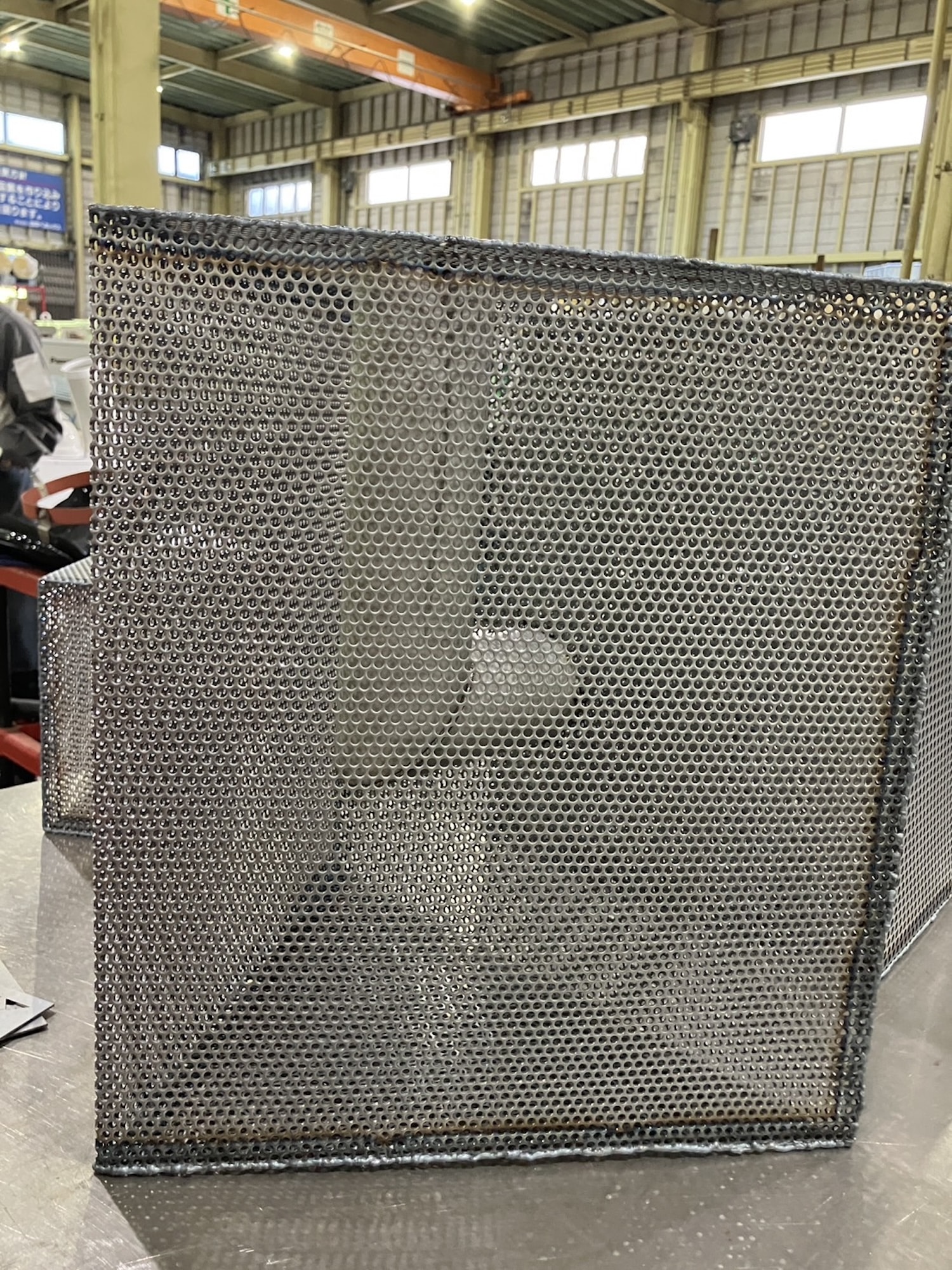 La tôle perforée a une propriété que les autres matériaux métalliques n’ont pas à ce degré : elle fait coexister l’opacité et la transparence au sein d’une même surface. L’objet semble fermé vu de face. On déplace légèrement la tête, ou la lumière change d’angle, et l’intérieur commence à apparaître par fragments. Le tube en L surgit, disparaît, revient selon la position du spectateur.