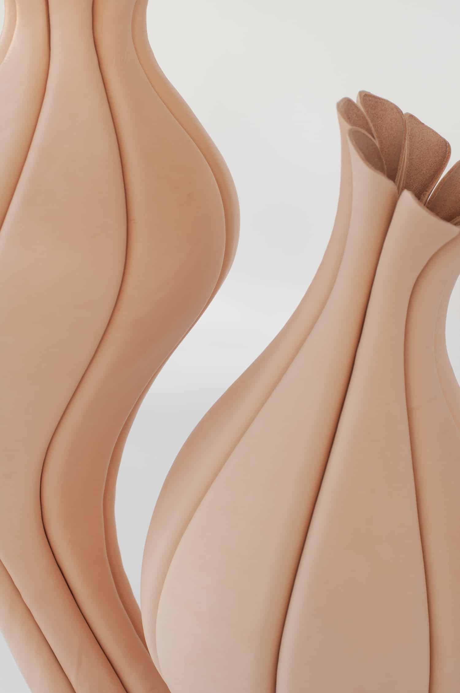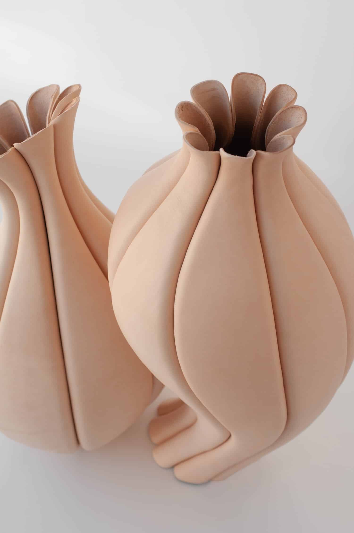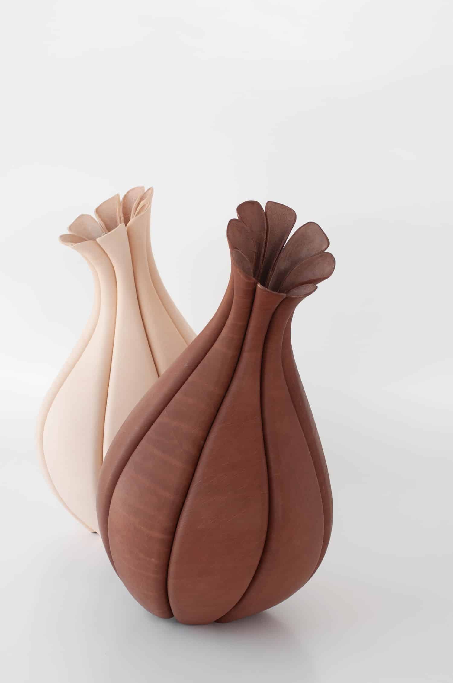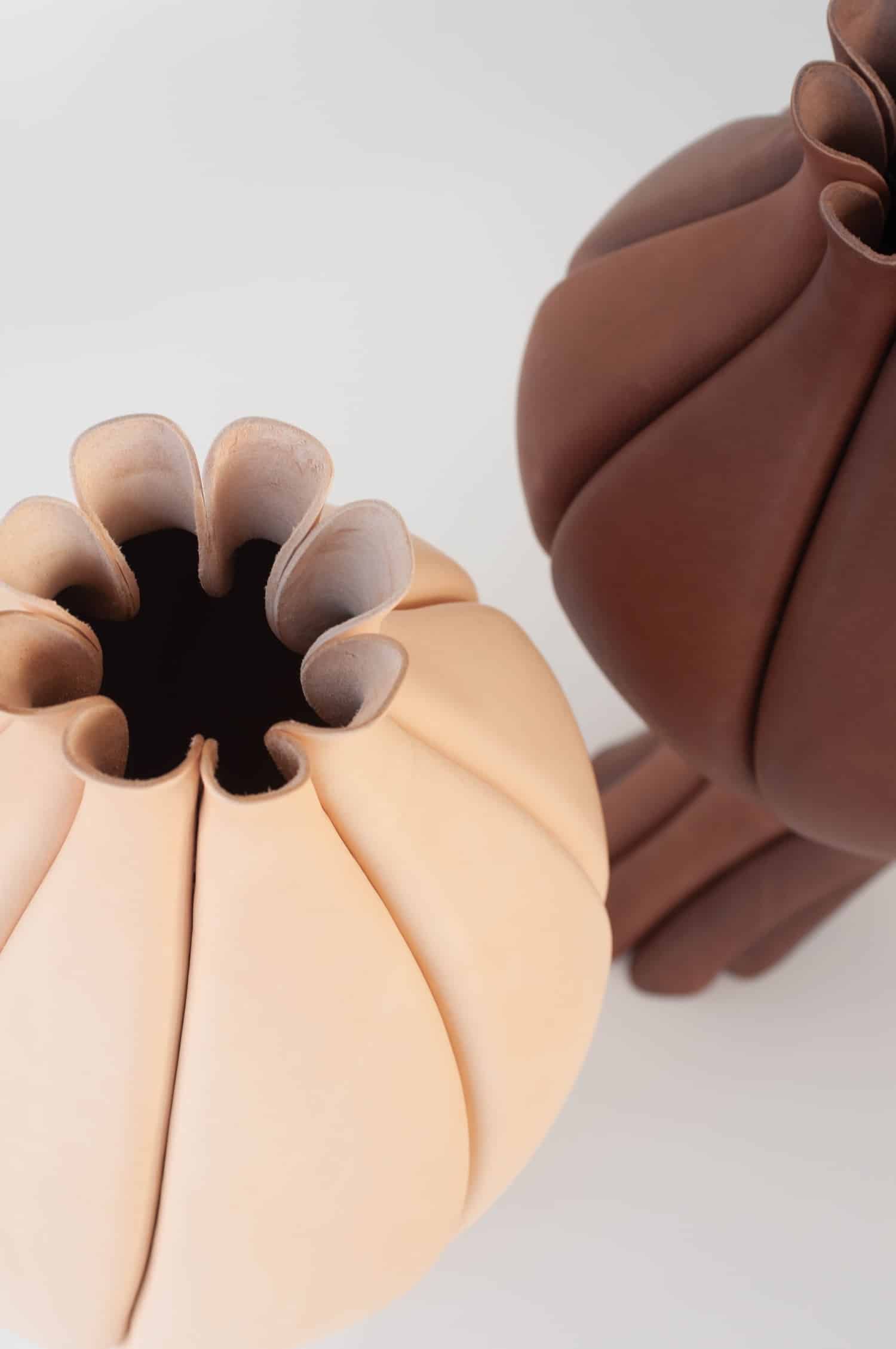Elle applique au cuir la précision d’une joaillière et la patience d’une maroquinière, en refusant la facilité des plastiques thermoformés ou des résines. Son matériau unique, c’est le cuir tanné végétal, issu de tanneries italiennes réputées, biodégradable, non toxique. Pour celles et ceux qui suivent les explorations contemporaines de cette matière, le travail rappelle par certains aspects les recherches de Rebecca Asquith autour du cuir comme élément structurel, ou encore les bi matières bois cuir du designer français Damien Beal. Sauf que Luvaton pousse la logique encore plus loin, en faisant du cuir la structure elle même, et plus seulement une peau.