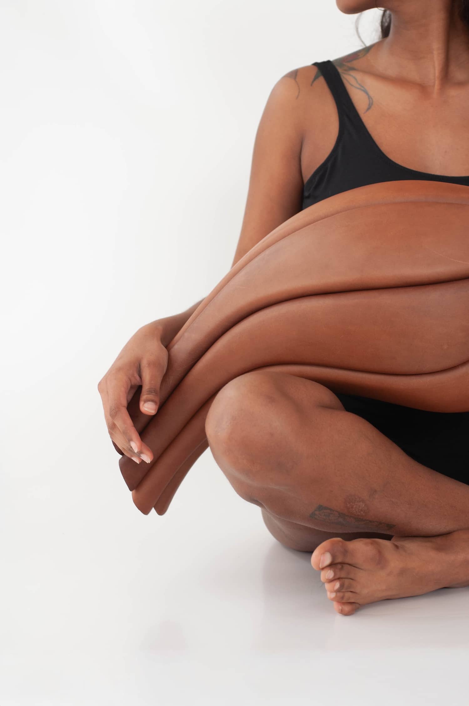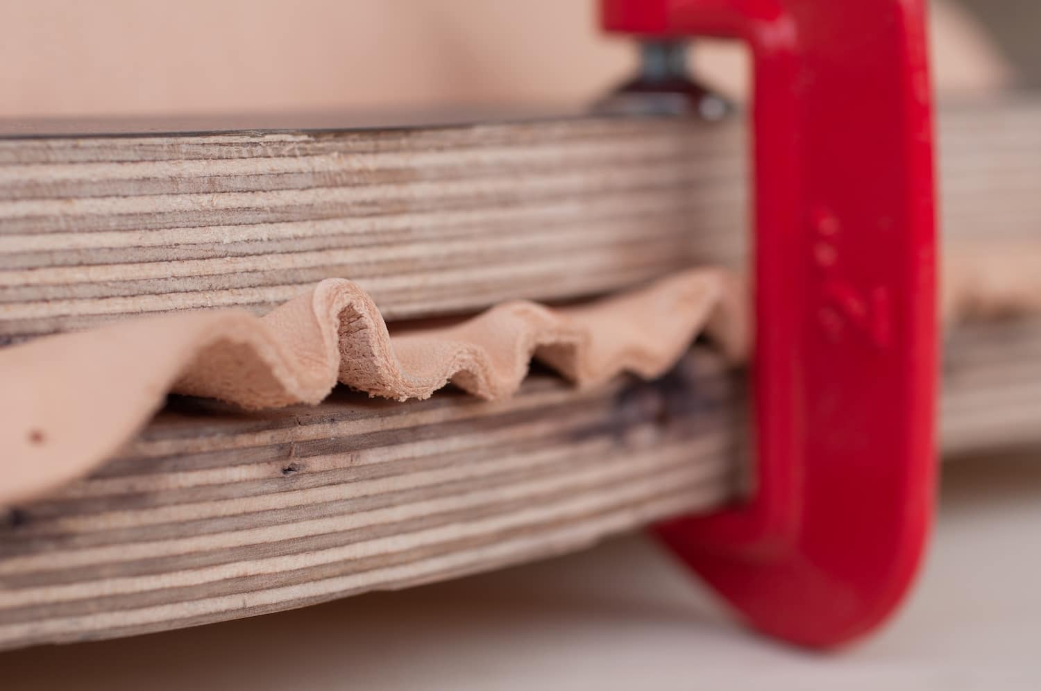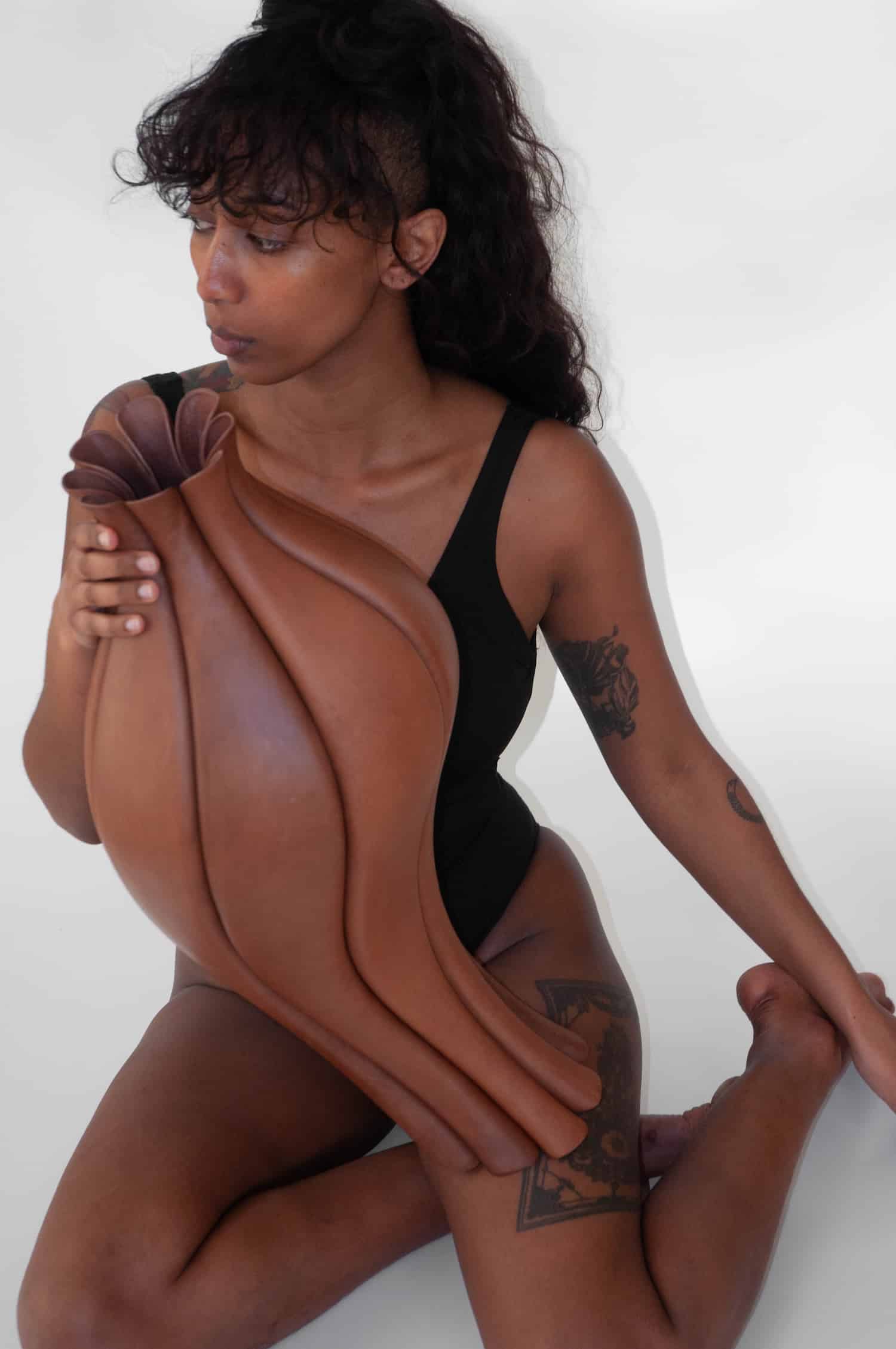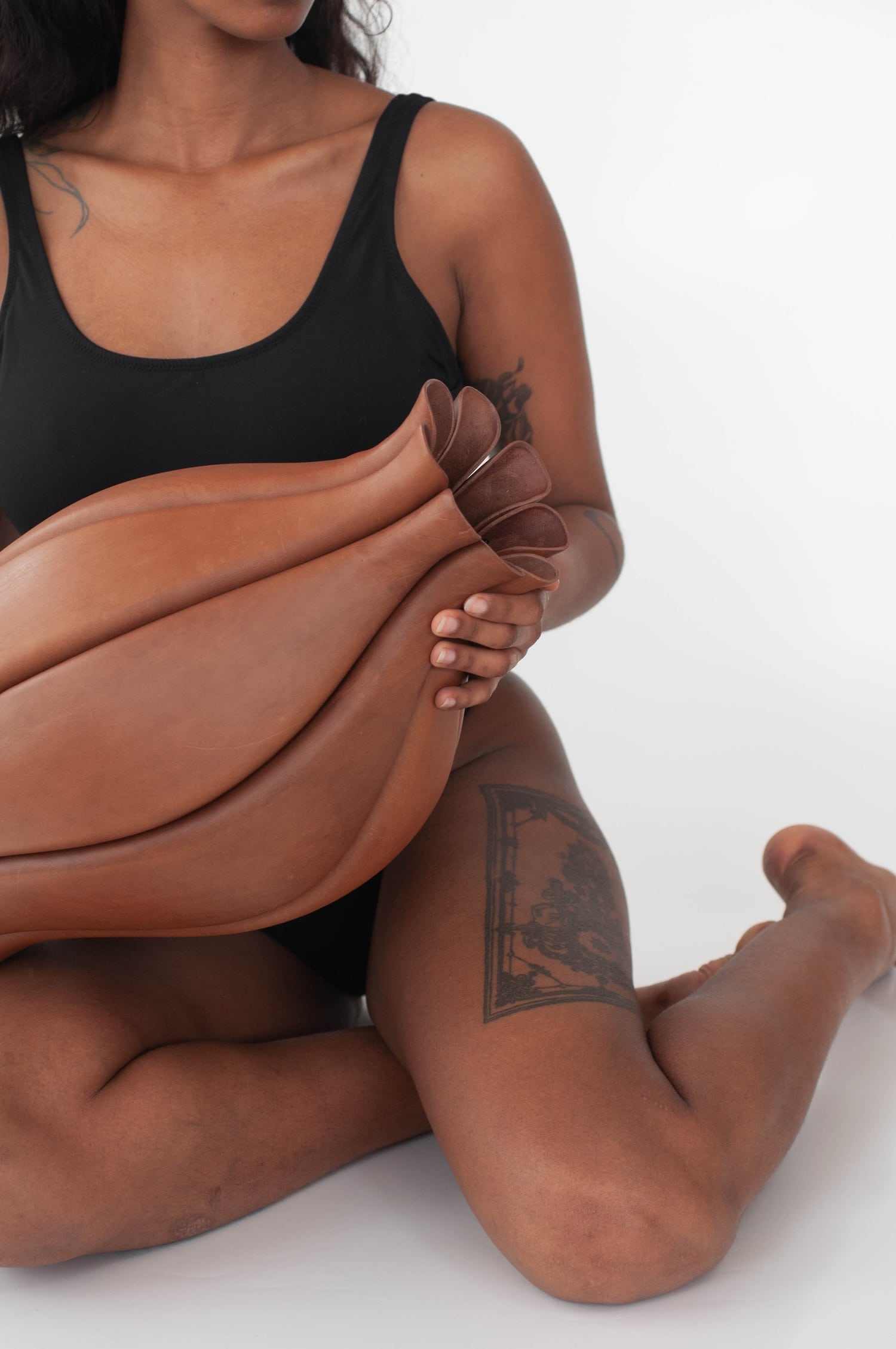 Elle applique au cuir la précision d’une joaillière et la patience d’une maroquinière, en refusant la facilité des plastiques thermoformés ou des résines. Son matériau unique, c’est le cuir tanné végétal, issu de tanneries italiennes réputées, biodégradable, non toxique. Pour celles et ceux qui suivent les explorations contemporaines de cette matière, le travail rappelle par certains aspects les recherches de Rebecca Asquith autour du cuir comme élément structurel, ou encore les bi matières bois cuir du designer français Damien Beal. Sauf que Luvaton pousse la logique encore plus loin, en faisant du cuir la structure elle même, et plus seulement une peau.