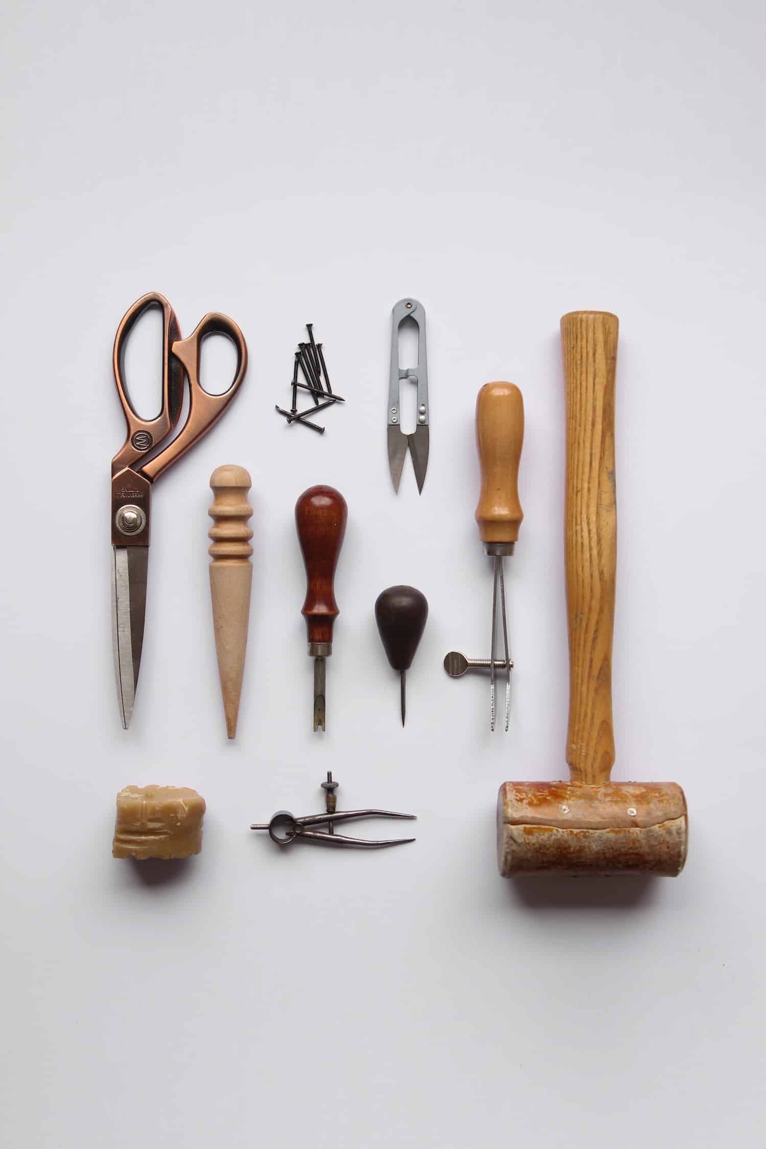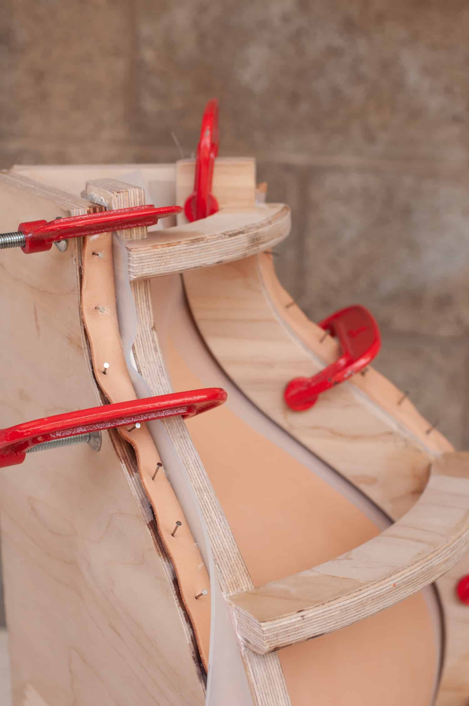 Chaque pièce commence par un croquis à la main et un prototypage physique. Les formes sont ensuite traduites en modèles numériques qui servent à imprimer en 3D des moules modulaires. Sur ces moules, le cuir est ensuite travaillé selon la technique traditionnelle du formage à l’eau, une méthode ancestrale qui consiste à humidifier la peau puis à la figer dans sa forme finale au séchage.