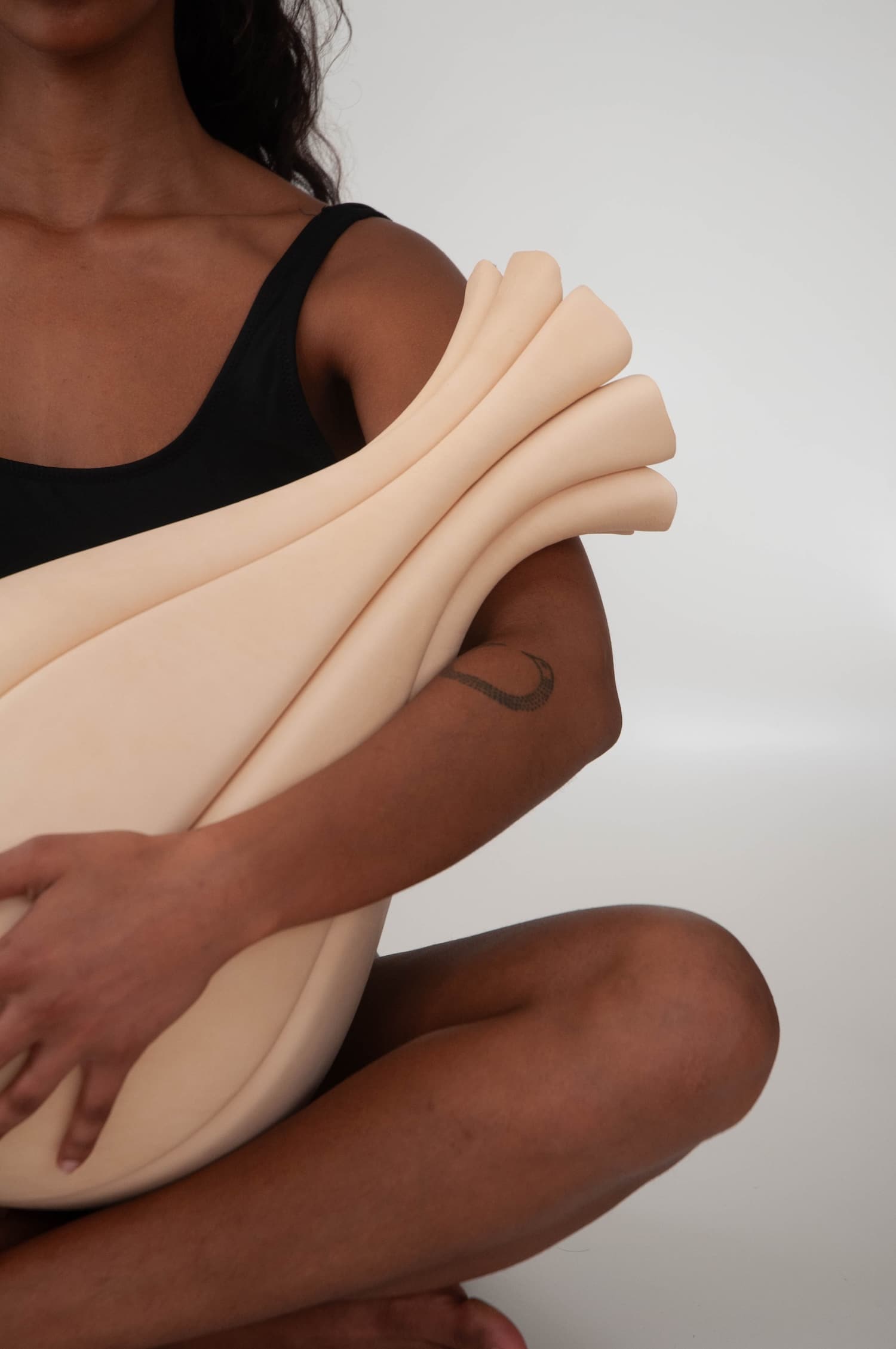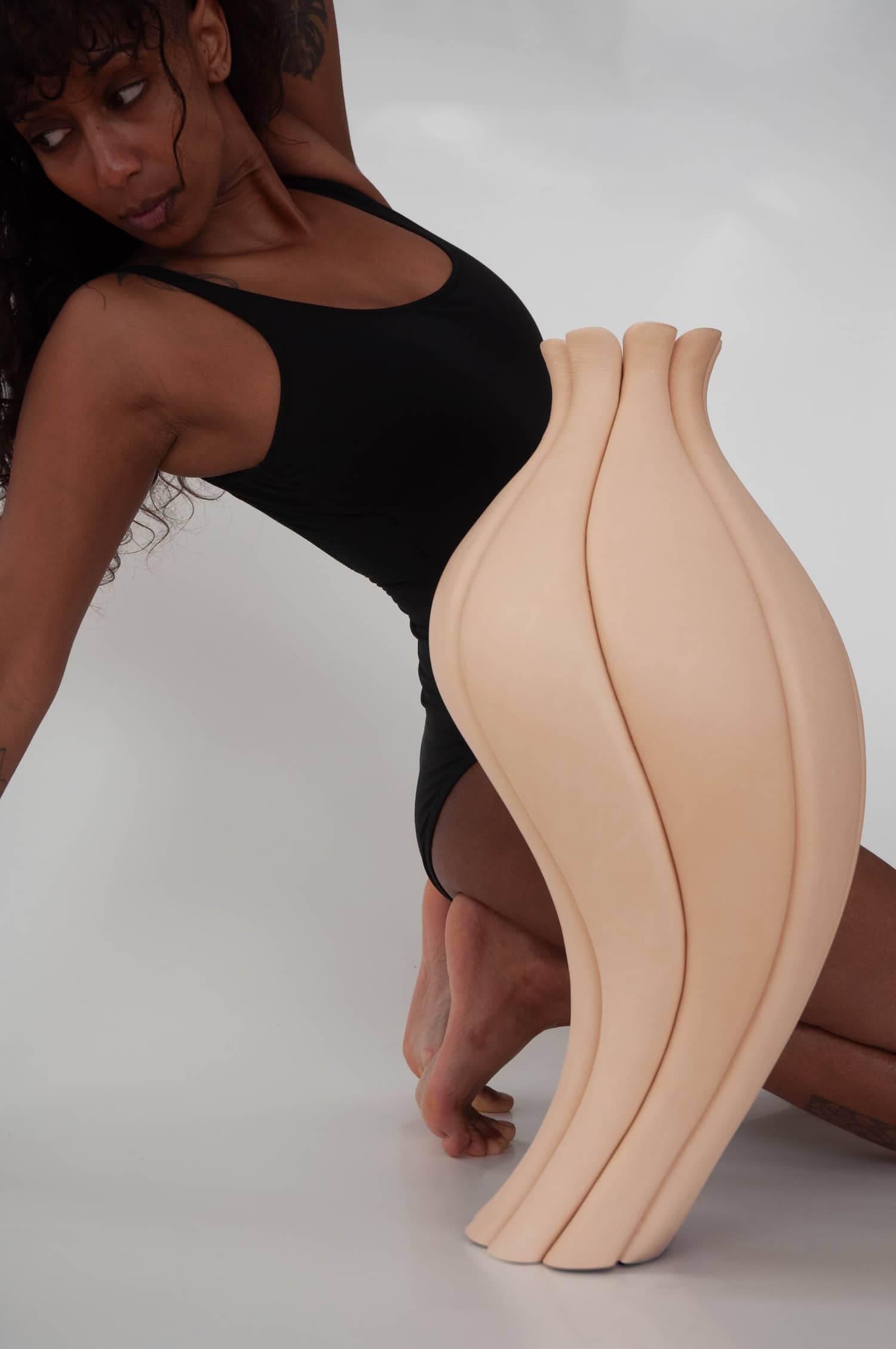 La pièce présentée en exclusivité à Milan porte bien son nom. TRACE traduit l’essence fluide d’un geste en une forme tridimensionnelle stable. La collection est née d’une série d’études d’observation du corps en mouvement, transposées ensuite en volumes. On y lit la tension d’un tronc qui se cambre, la souplesse d’un bras qui s’élève.