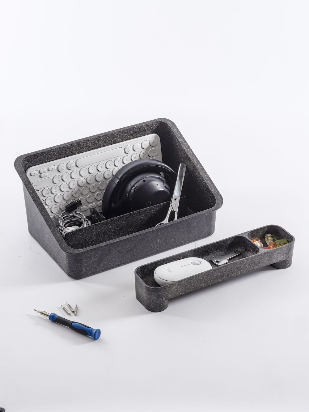 « Après 2 ans et demi de travail, le studio est fier de lancer L’ultime. Un nouvel objet, la fusion d’un réhausseur d’ordinateur et d’une boite à outil. Un design simple et essentiel conçu pour vivre dans les intérieurs domestique autant que corporate. L’architecture de l’objet offre à son utilisateur une vraie position ergonomique en tant que rehausseur, tandis que la boite de rangement devient le parfait organisateur de bureau. »