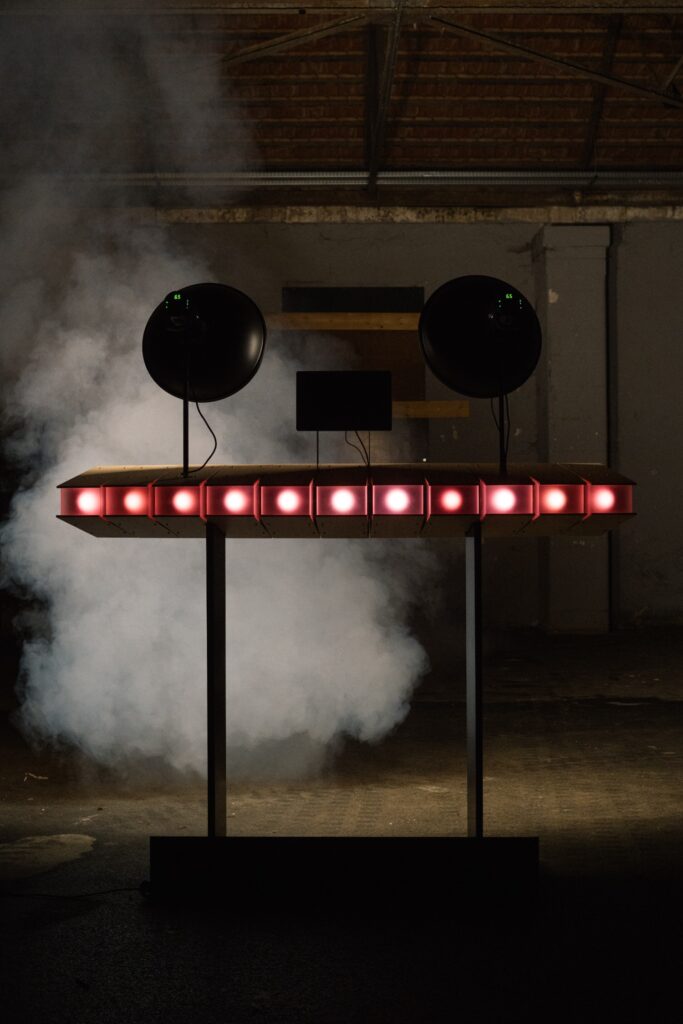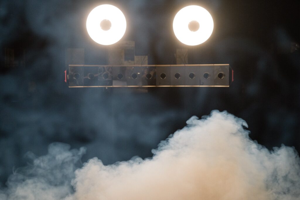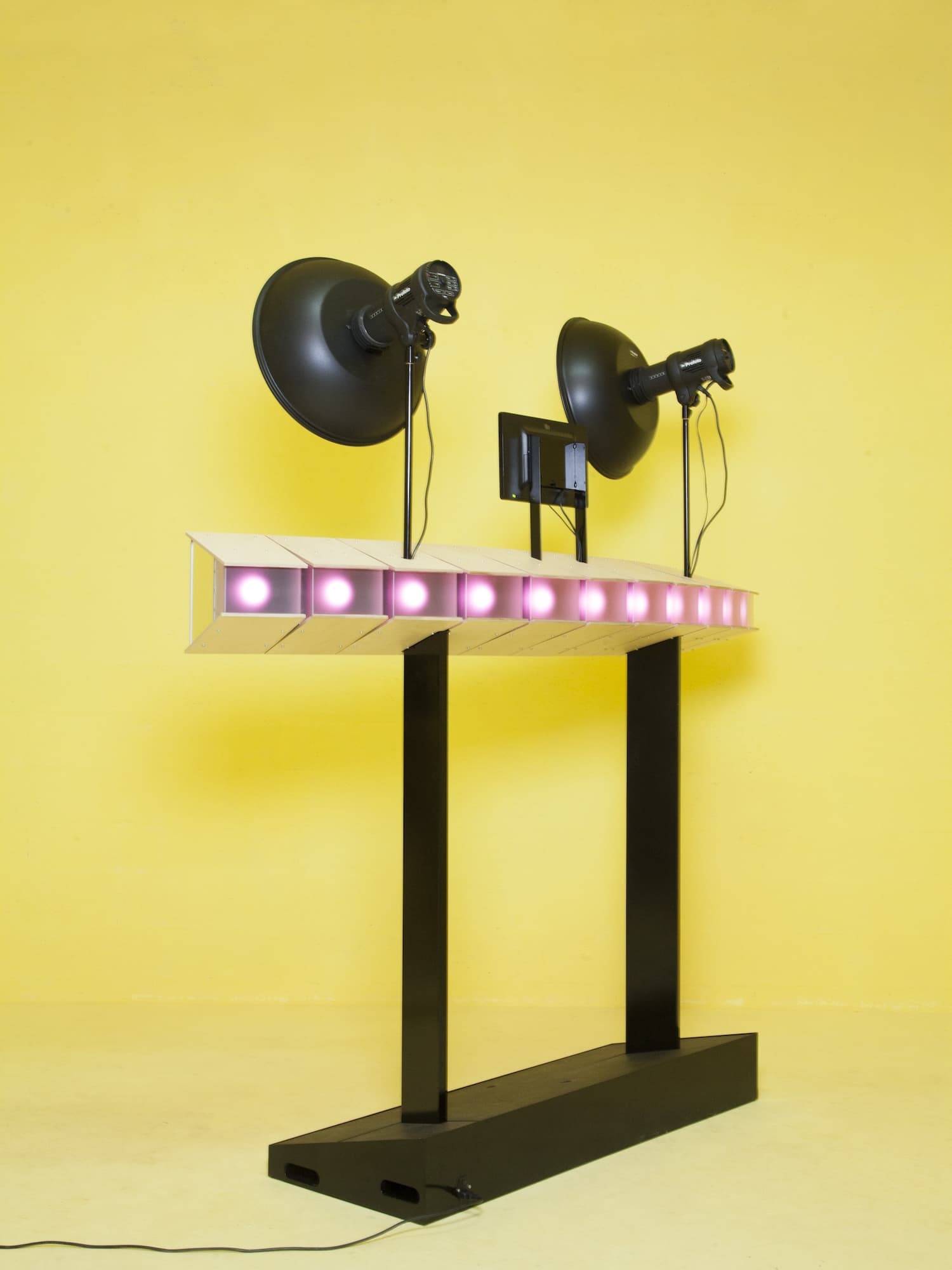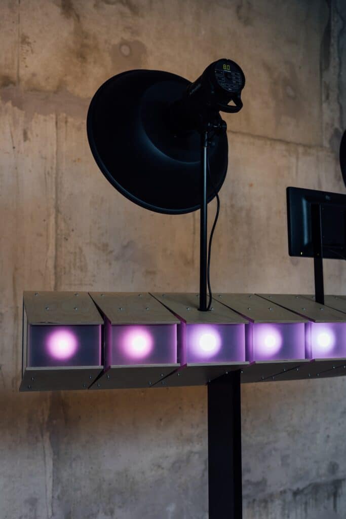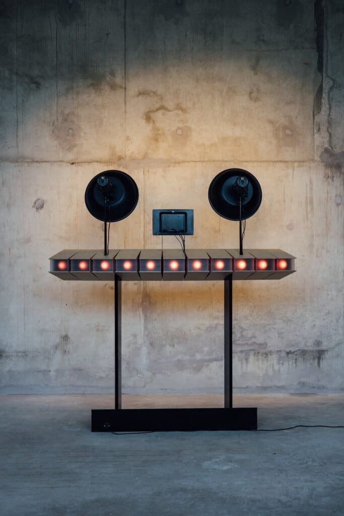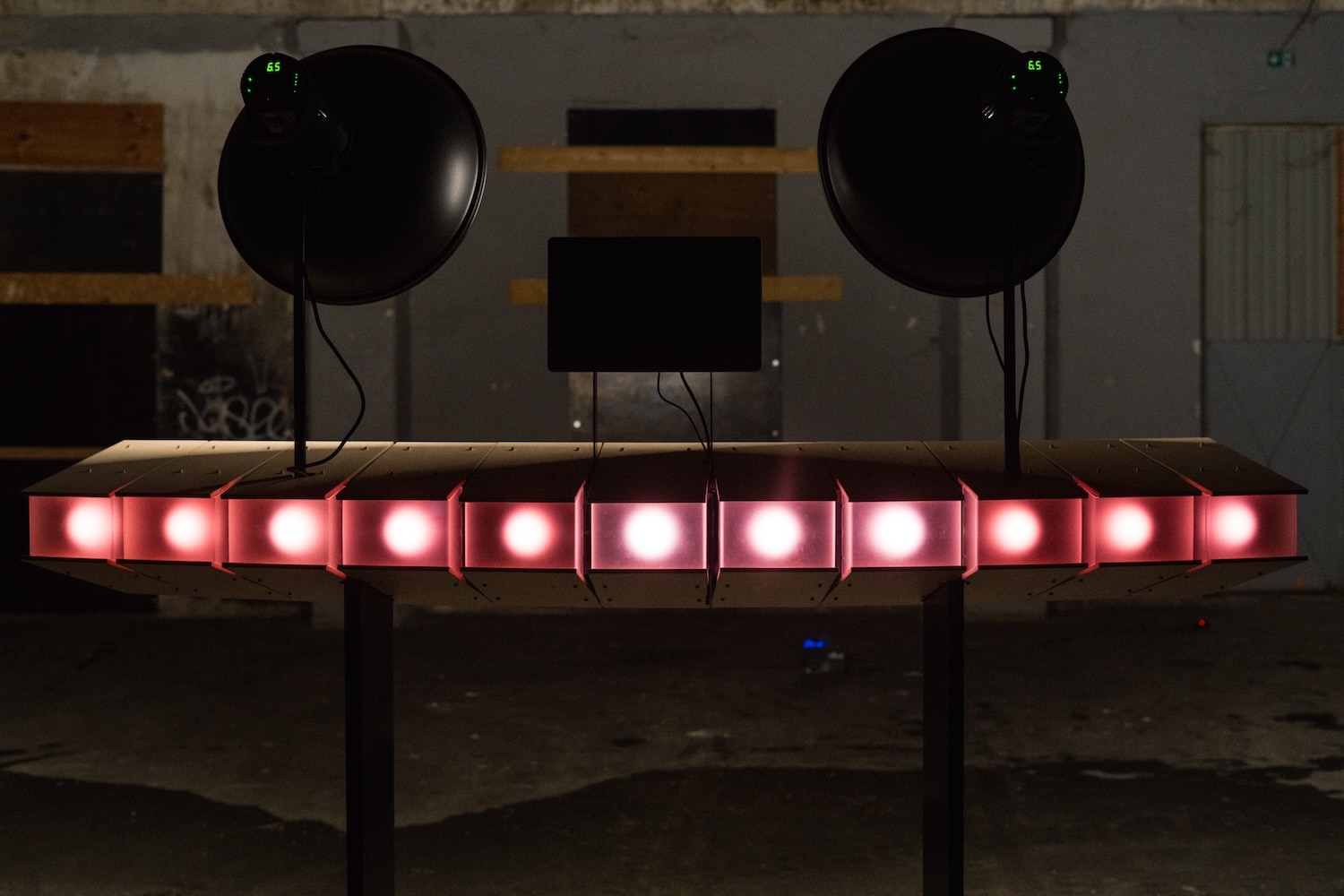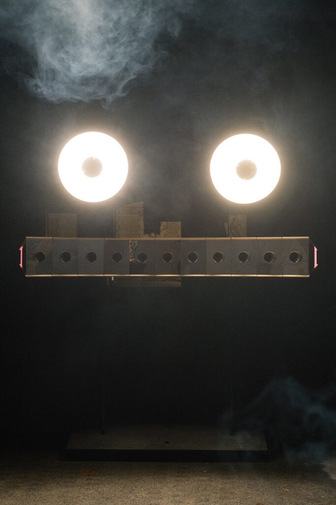 L’objet intrigue avant même de comprendre sa fonction. Arc tendu vers le sujet photographié, la structure évoque une portion de carlingue spatiale tombée là, suspendue dans le mouvement. On y perçoit des lignes tendues, des modules répétitifs, une pulsation lumineuse animée. Avec ses deux grands yeux et cette grande bouche on décèle un être non terrestre, fait de métal et d’acier qui semble attendre son moment, le bon moment.