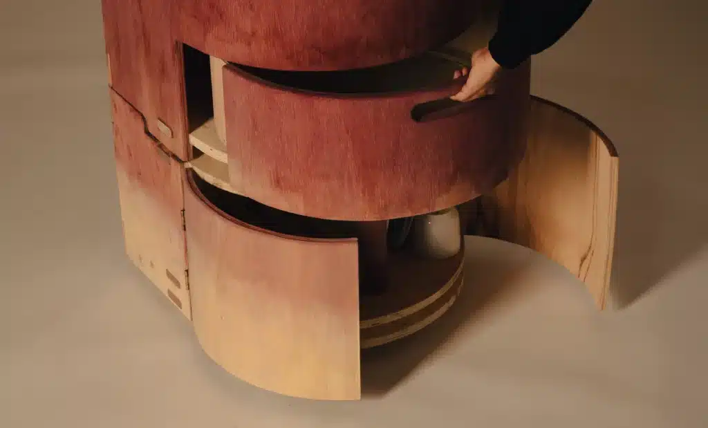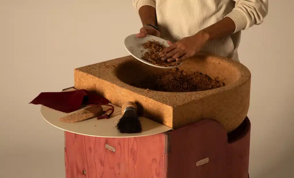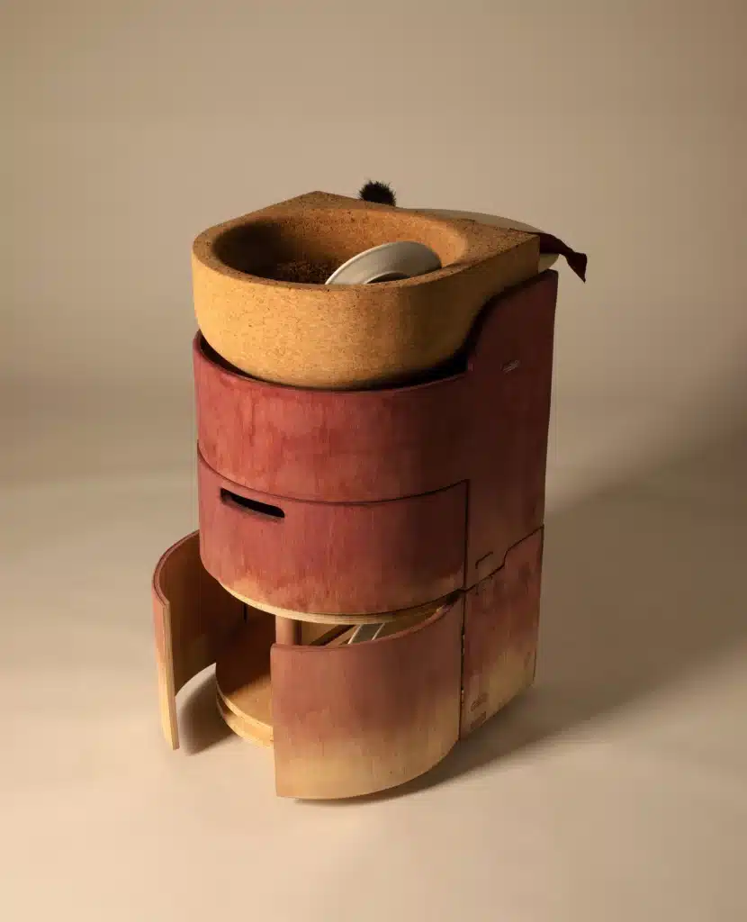 L’usage de matériaux récupérés est central : liège de bouchons, résidus vinicoles (utilisés pour teindre des surfaces), argile issue de chantiers, charbon, etc. Chaque composant contribue à réduire la dépendance aux matériaux synthétiques, tout en introduisant une dimension narrative dans l’objet par sa provenance, ses traces, ses transformations. Le projet souligne aussi l’importance de rendre visibles des processus habituellement invisibles (évaporation, filtration, récupération), afin d’élargir la conscience du cycle de l’eau dans l’environnement domestique.