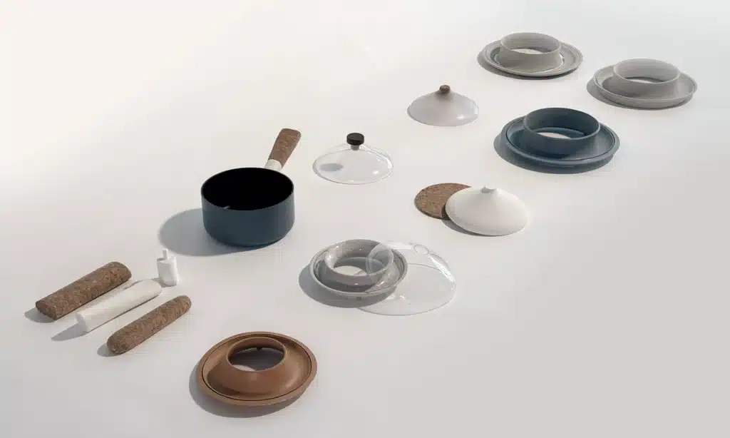 - Sanchaya : un couvercle de cuisson conçu pour condenser la vapeur et la restituer sous forme d’eau récupérable. Par une surface vitrée transparente et un réservoir céramique interne, il rend visible le cycle d’évaporation-condensation, et encourage une relation plus réfléchie à l’eau utilisée lors de la cuisson.
