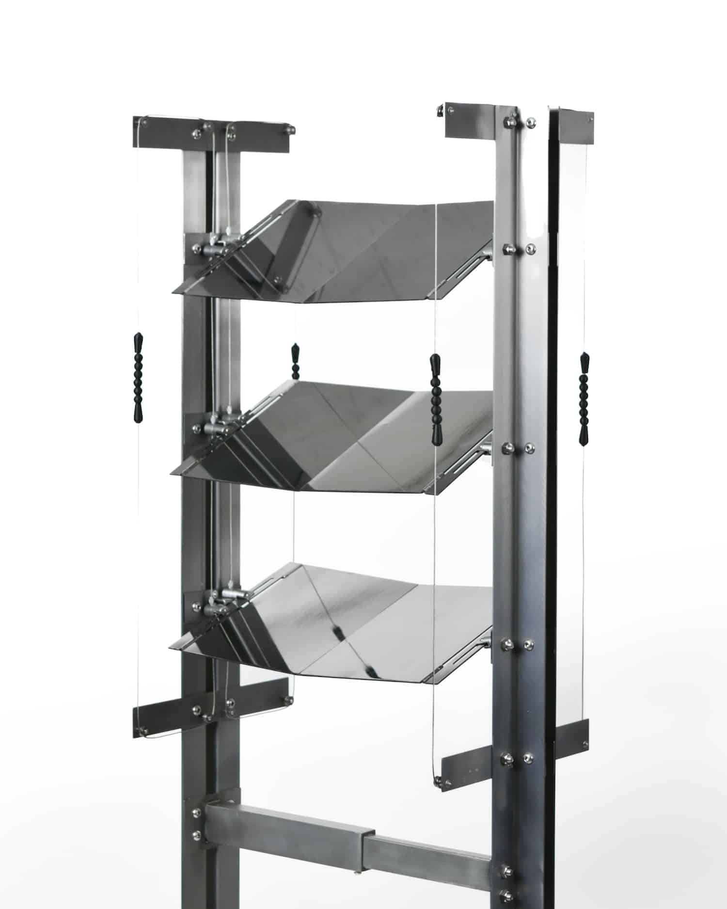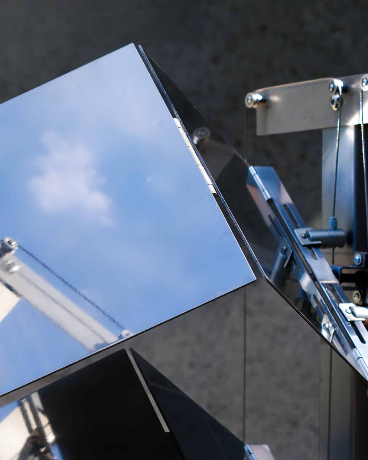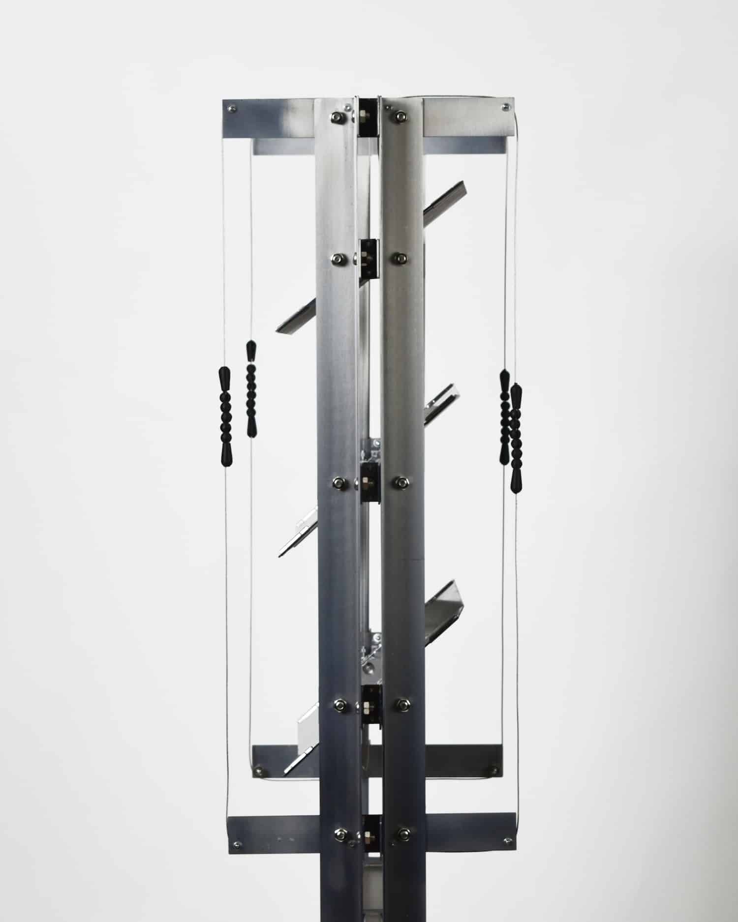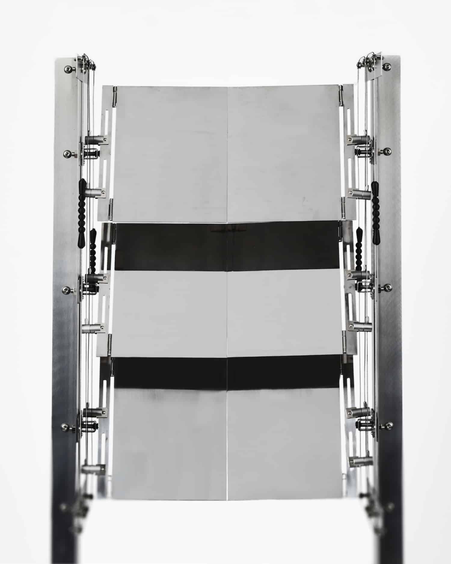 La silhouette de la pièce est verticale, presque monolithique vue de face. Elle évoque un paravent traditionnel asiatique, mais l’épure de l’acier poli l’oriente clairement vers le vocabulaire de l’architecture contemporaine. Pas de motif sculpté, pas de décor figuratif : la surface elle-même constitue l’ornement. Les reflets du ciel, les ombres portées des lattes, la qualité du métal font le travail.