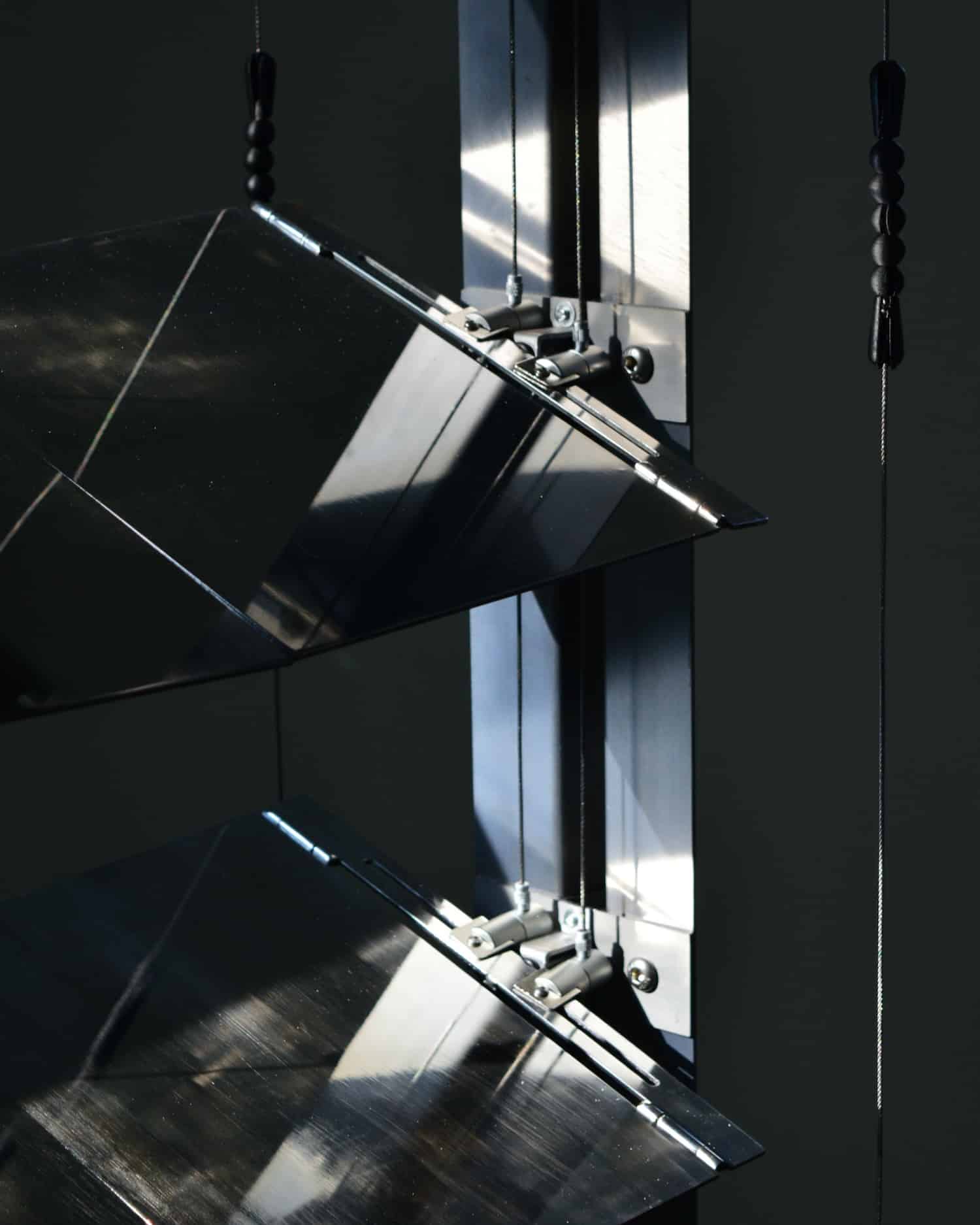 Le brief des designers est clair : redonner à l’habitant urbain une perception du temps naturel. Pas le temps des notifications ni celui des réunions, mais le temps solaire, celui que l’on mesure à la couleur du ciel en début de matinée par opposition à celle du crépuscule. Les surfaces réfléchissantes de la cloison agissent comme un rappel continu de ce temps là, en important dans le salon ou la chambre les variations lumineuses de l’extérieur.