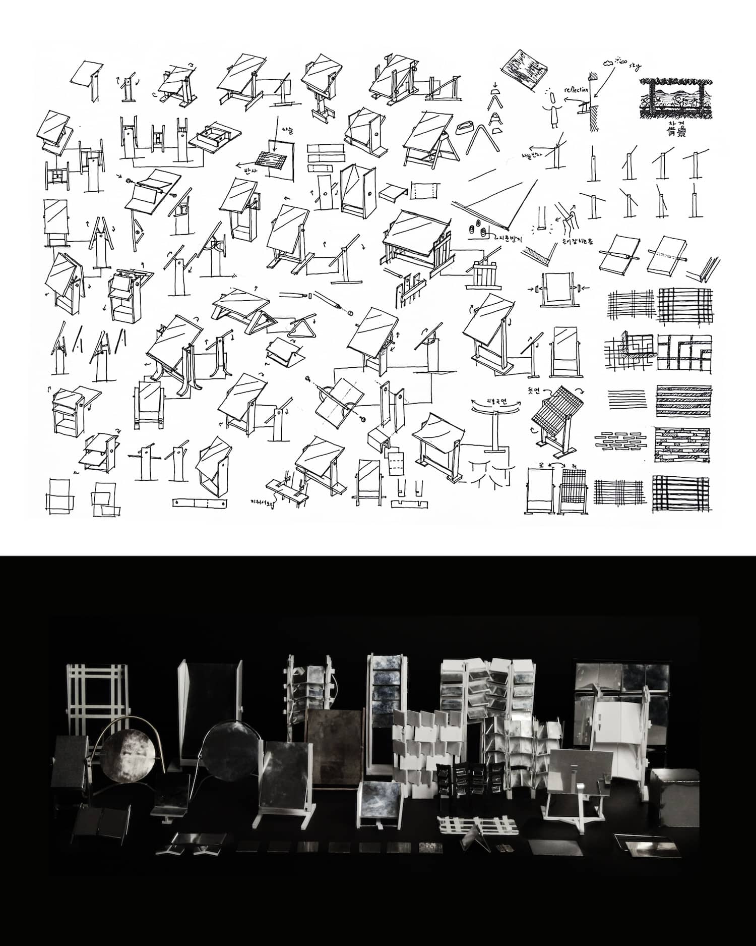 Ce qui distingue Chagyeong c’est la structure rotative, les lames métalliques pivotent, ce qui permet à l’utilisateur d’ajuster l’angle selon l’heure de la journée ou la position du soleil. Le matin, on laisse entrer la lumière rasante. L’après-midi, on oriente les reflets différemment. La surface miroir capte les couleurs du ciel, les restitue à l’intérieur et les projette sur les murs et le sol sous forme de reflets changeants.