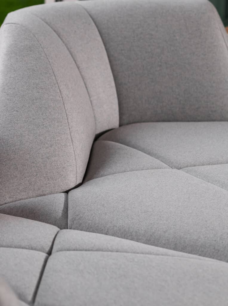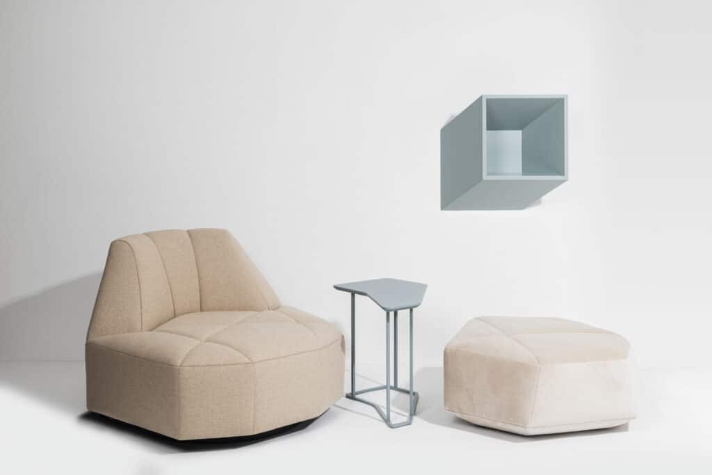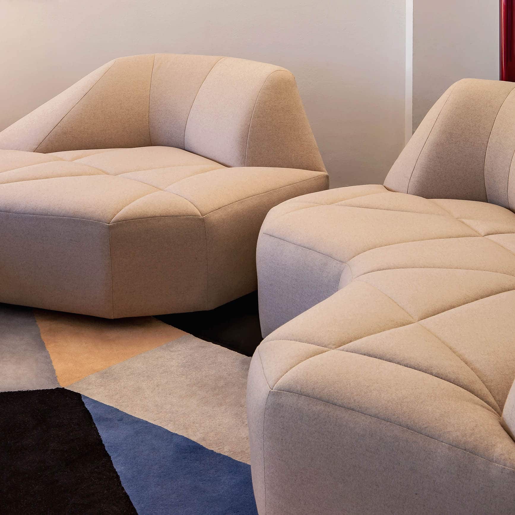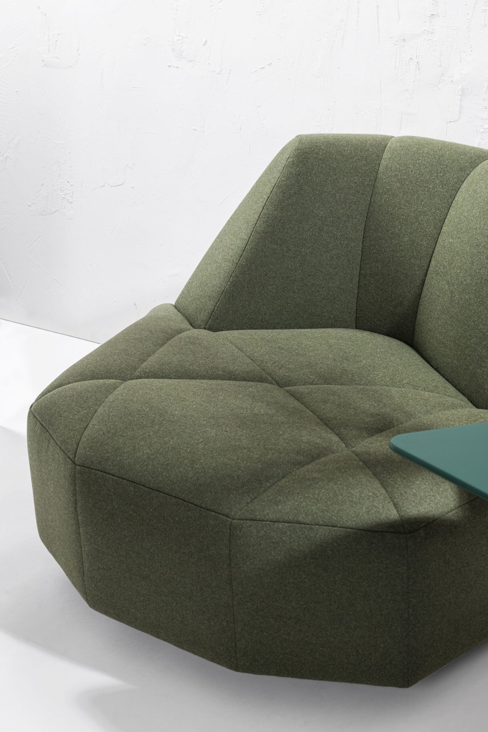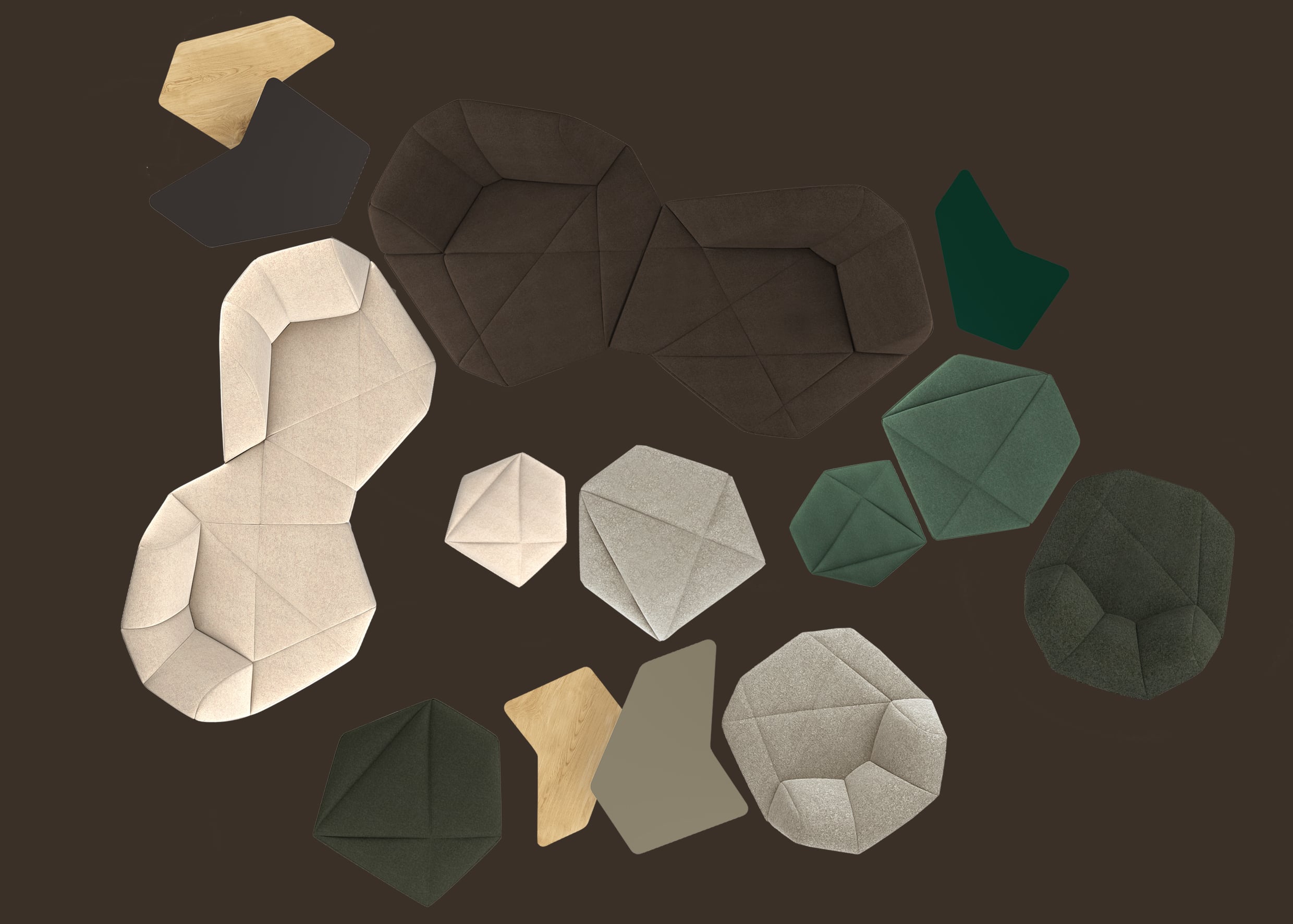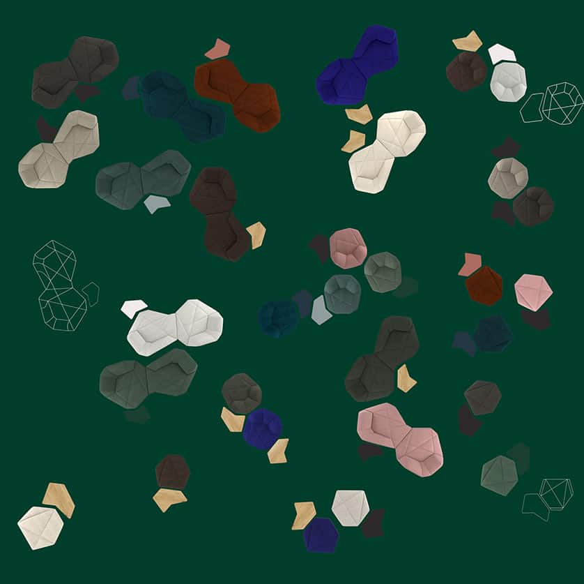 La gamme Crystal incarne l’esprit de FID Paris. Elle se compose d’assises modulables (canapés, fauteuils, poufs) revêtues d’un tissu doux (« sustainable soft touch wool ») et jouant sur les possibles juxtapositions d’éléments et laissant assez libre l’agencement.