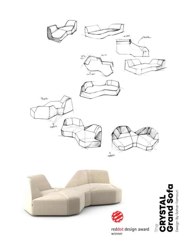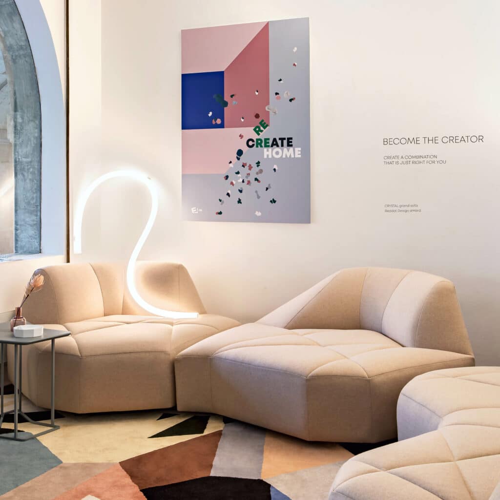 Le concept : donner la liberté à l’utilisateur de composer son mobilier par exemple en combinant un canapé « Home Edition » Crystal avec des poufs ou des tables d’appoint selon les usages et l’espace.