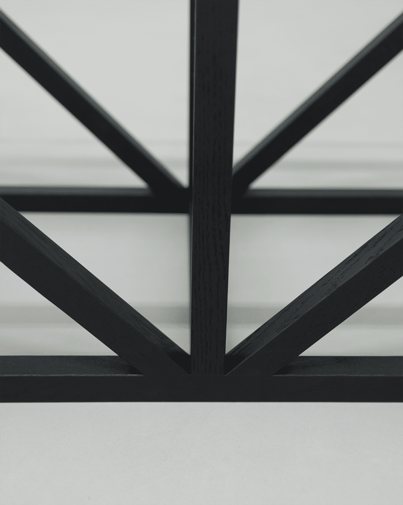 Ce qui frappe au premier abord dans la chaise Gang, c’est l’agencement complexe et pourtant parfaitement fluide de ses piliers en bois massif imbriqués. Chaque élément semble à la fois autonome et indépendant, comme si le bois avait été guidé par une croissance organique. Cette structure, qui rappelle un treillis triangulaire de grue par exemple, n’est pas seulement un choix esthétique : elle assure également une répartition efficace du poids, garantissant stabilité et légèreté.