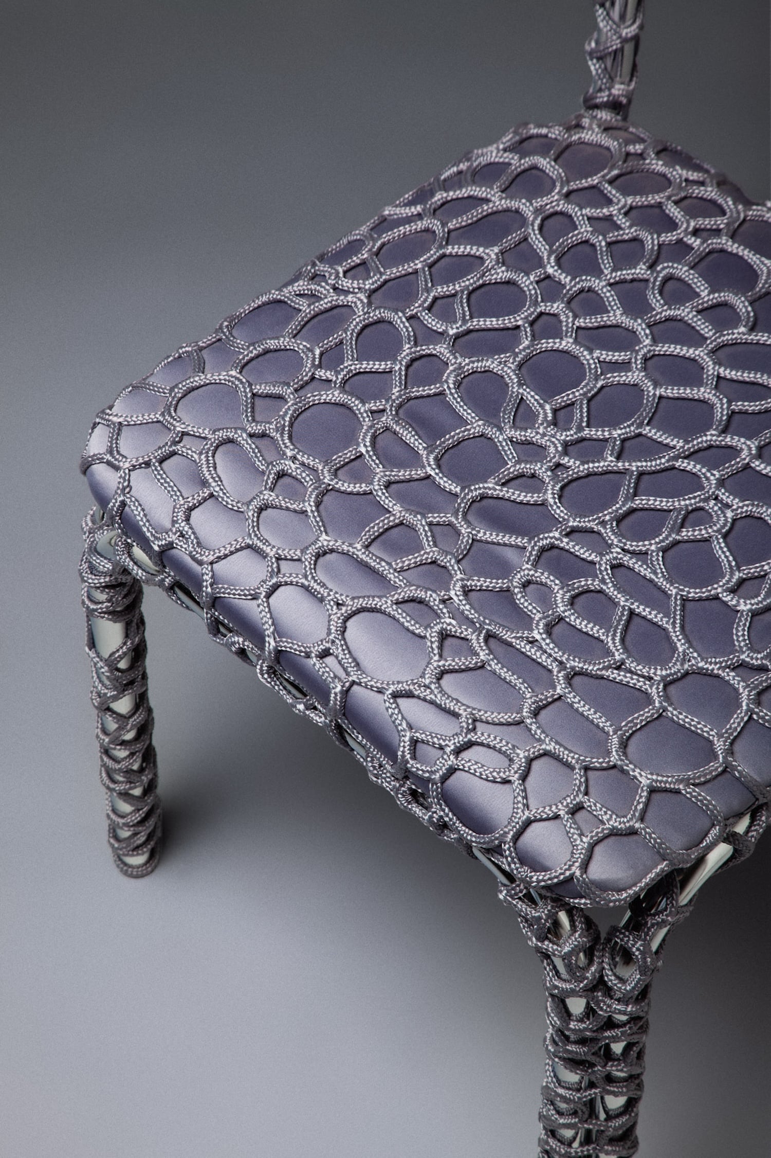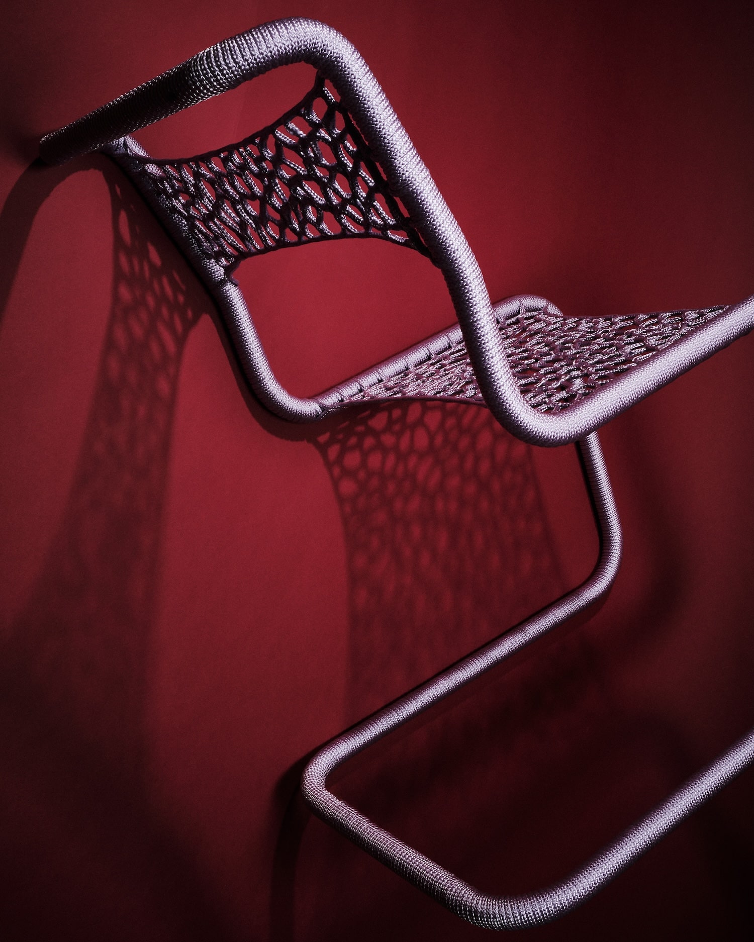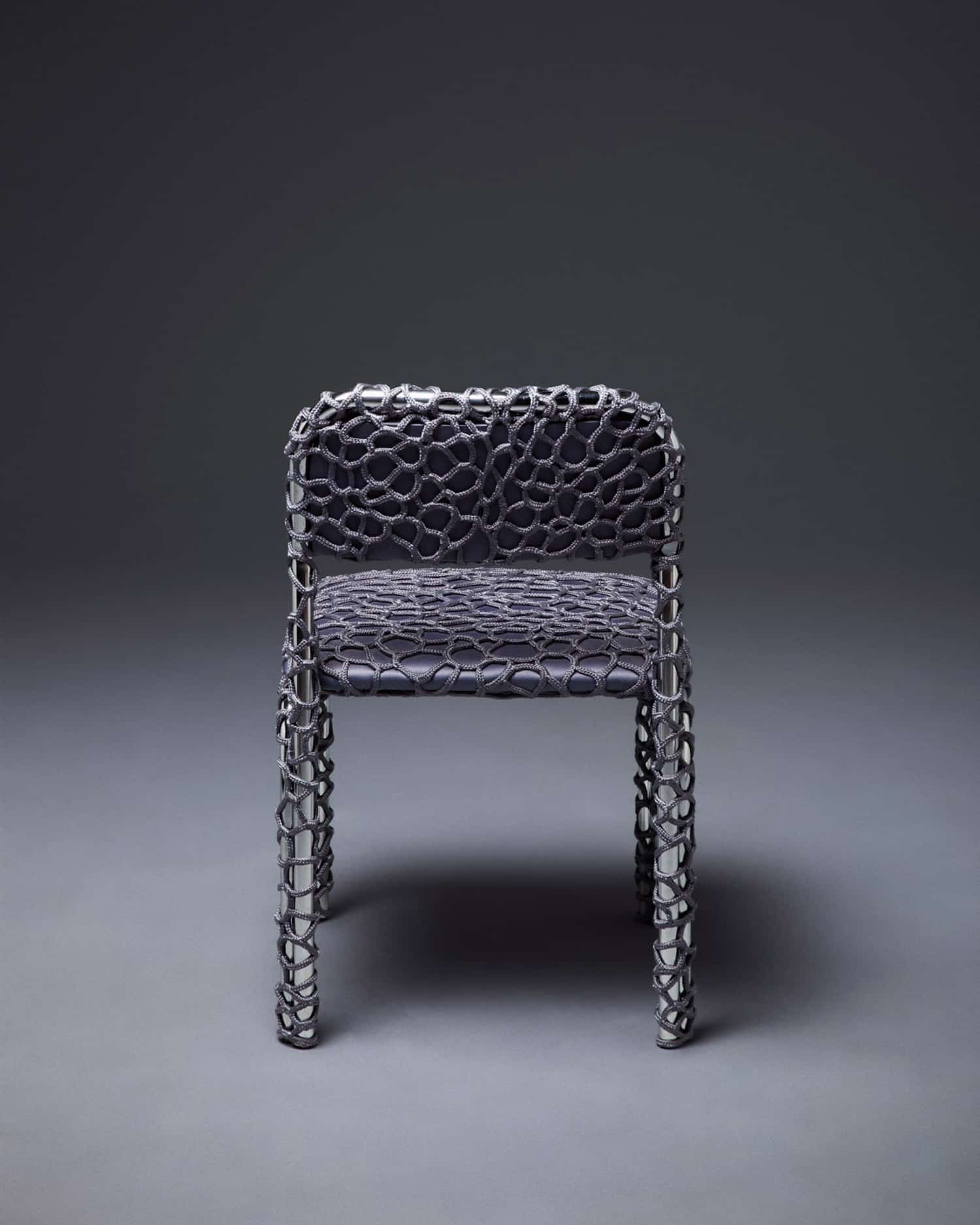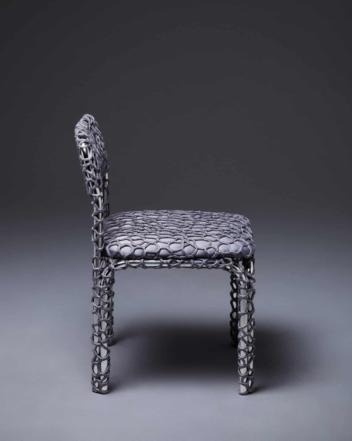 Chaque pièce évolue donc de façon intuitive. La corde, souvent polyester ou synthétique, se pose en tension sur le châssis, créant assise et dossier à partir d’un enchevêtrement de noeuds et de passages. L’absence de patron fixe génère des variations d’une chaise à l’autre : ni série industrielle, ni pièce unique de façon artificielle. La couleur joue un rôle majeur dans l’identification de chaque pièce. Sky Blue, Medium Purple, Aubergine, Midnight Blue, Lilac : la palette choisie pour la collection Take a Seat (2025) installe une légèreté chromatique en contraste direct avec la froideur du chrome.